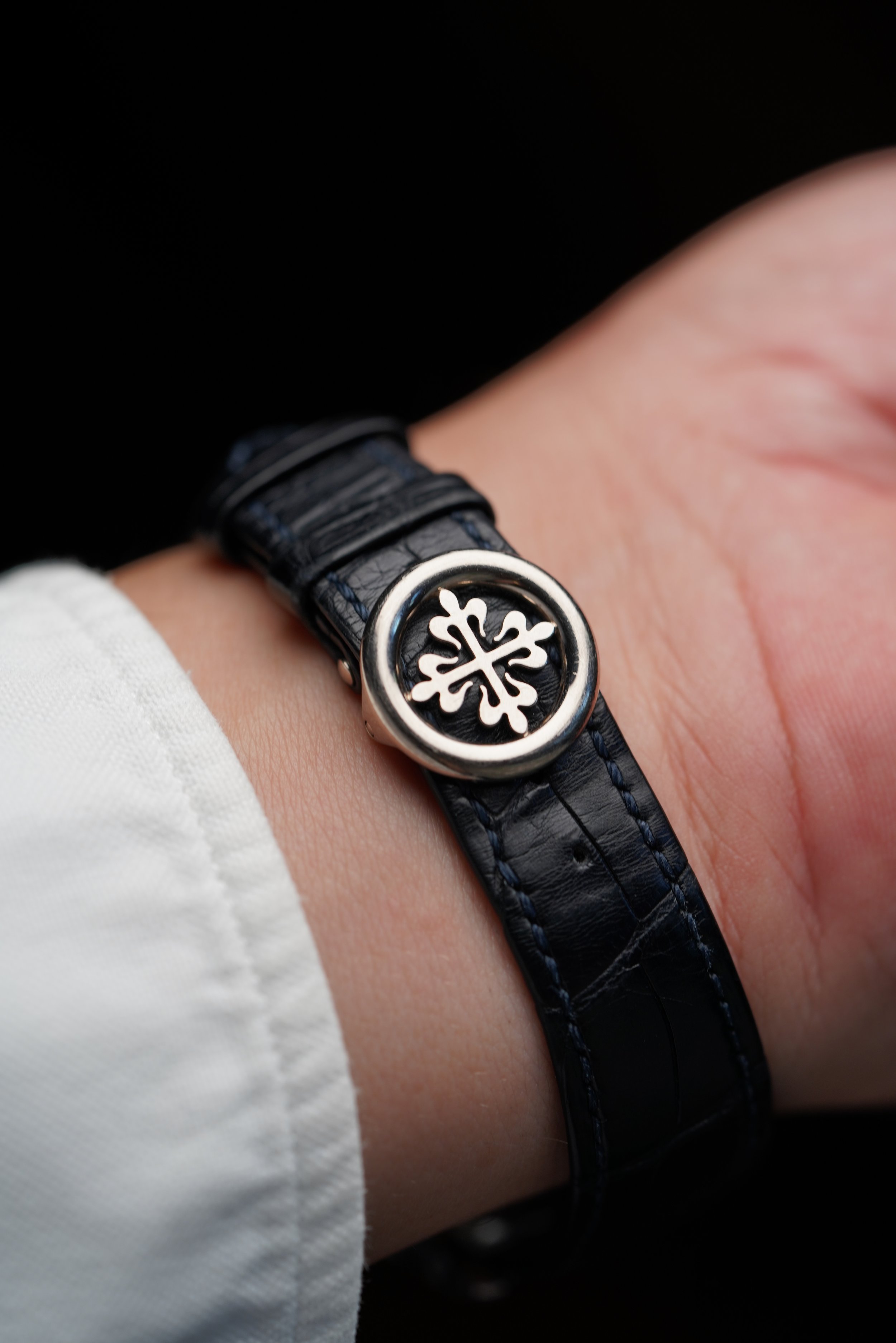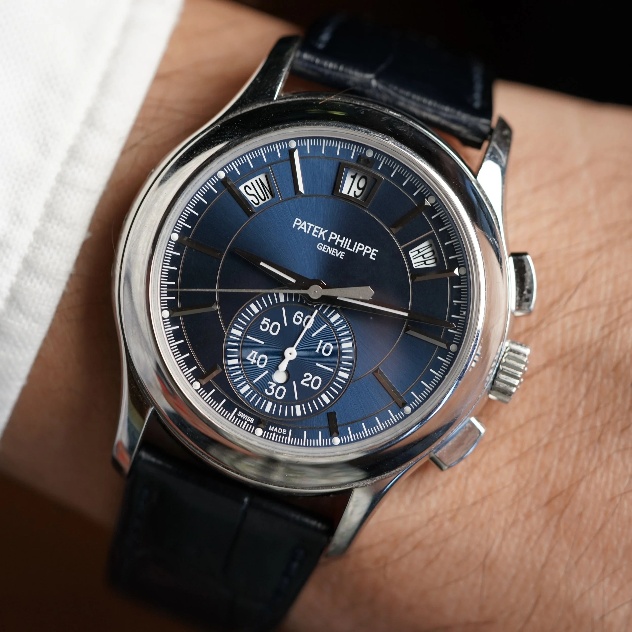 The Patek Philippe reference 5905P-001 is a very special self-winding annual calendar flyback chronograph. The platinum case measures 42mm in diameter. We believe the case is unpolished. It is paired on a beautiful Patek Philippe strap and platinum deployant. It has a stunning blue dial.