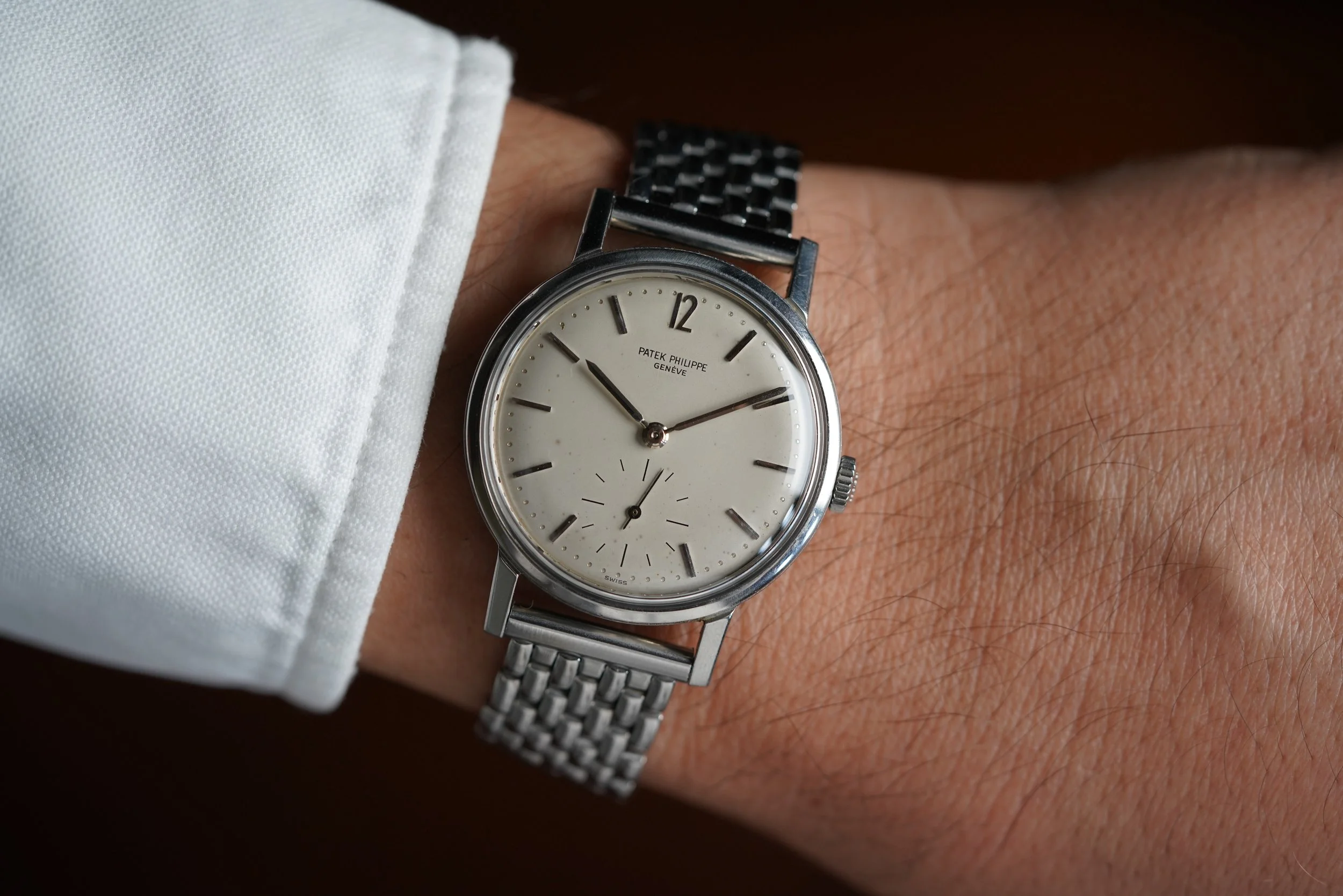The Patek Philippe reference 3417 is an iconic model with a very interesting role in the manufacturer’s history. The 3417 was introduced in 1958 and remained in production into the late 1960s. While many antimagnetic timepieces were being produced - the likes of the Railmaster, Milgauss, Ingenieur - Patek Philippe created a refined offering for the professional. This example dates to circa 1962. The case has been lightly polished. The watch measures 35mm in diameter (43mm lug-to-lug). It features the 3rd series dial without the Amagnetic font.
