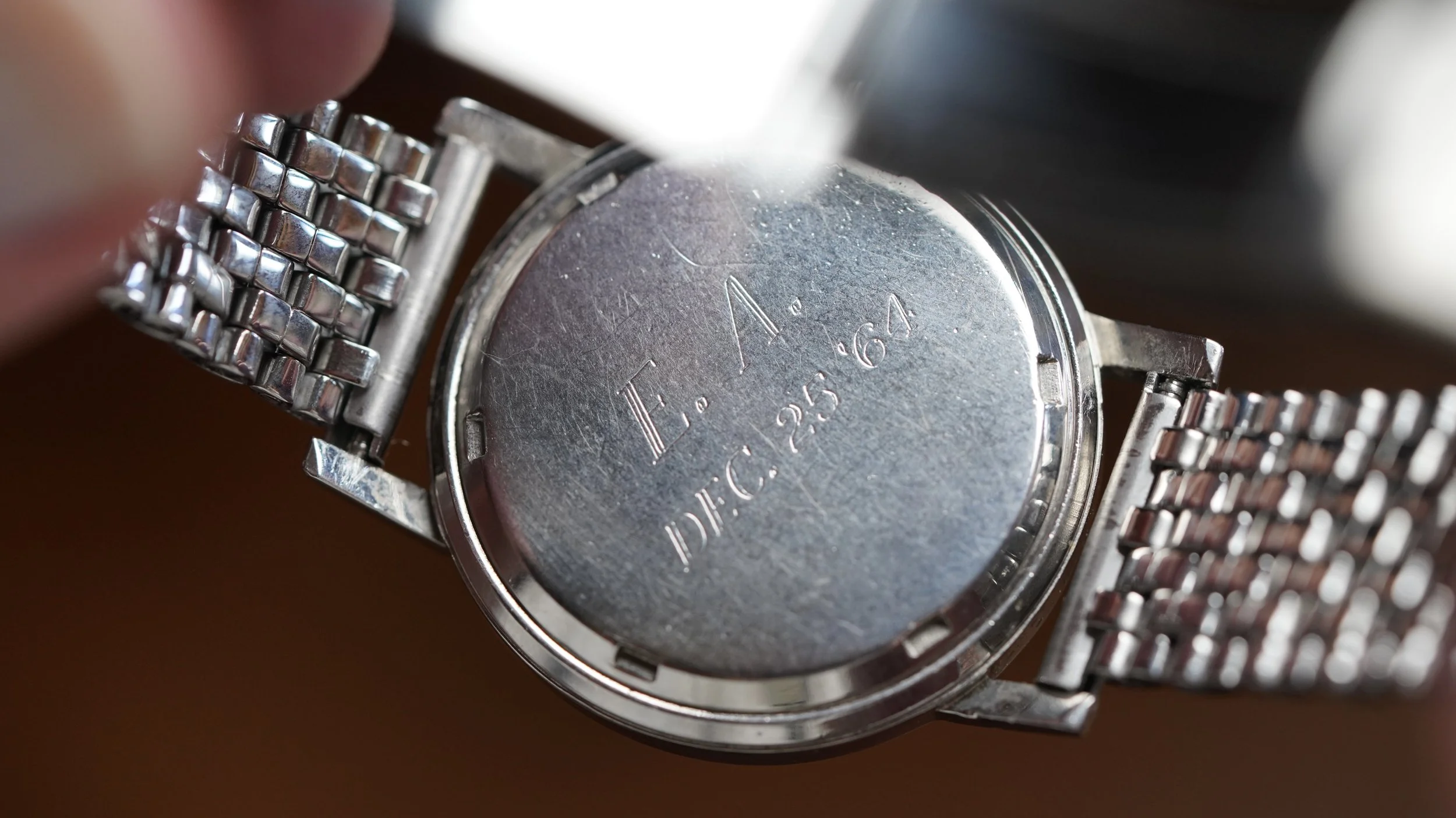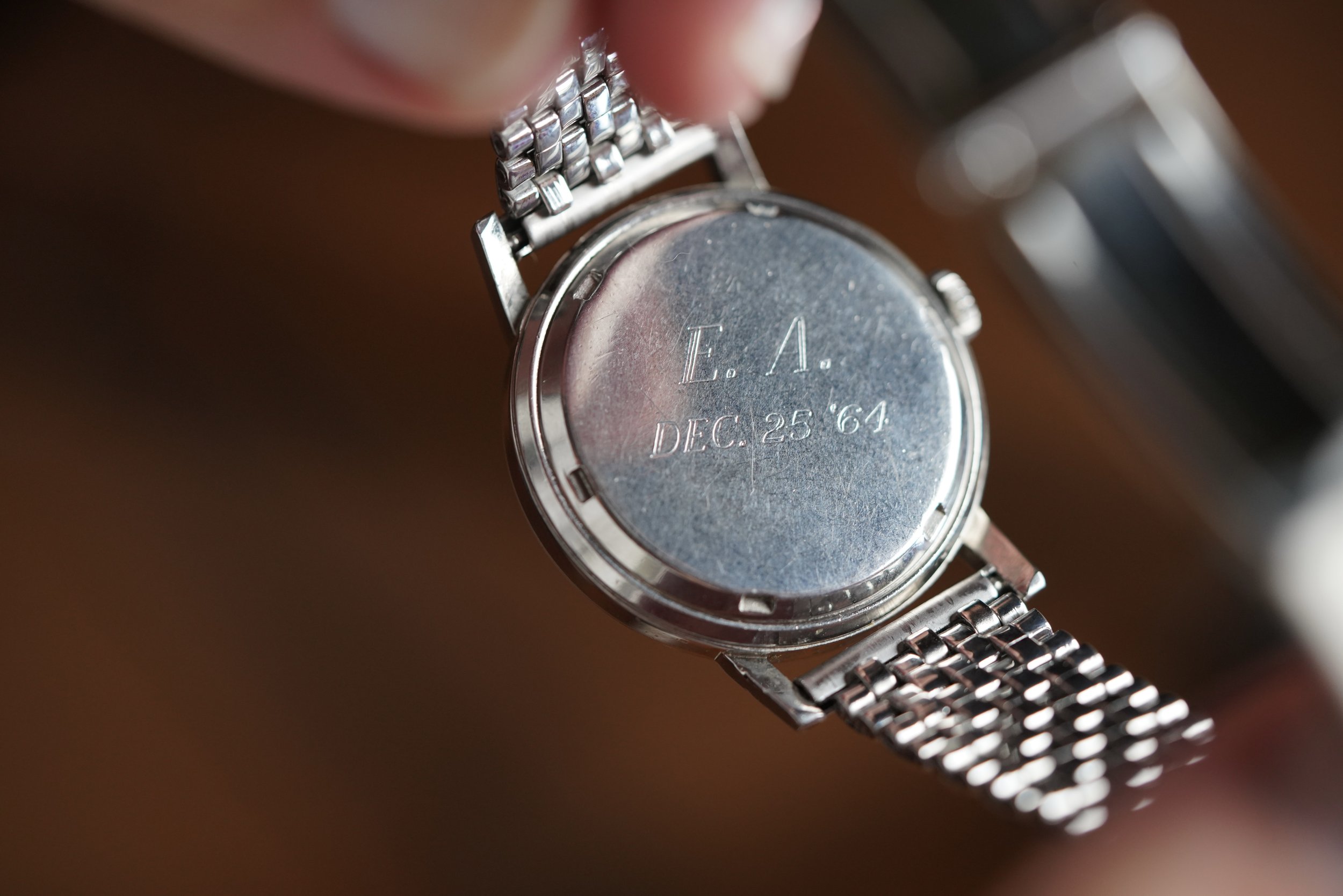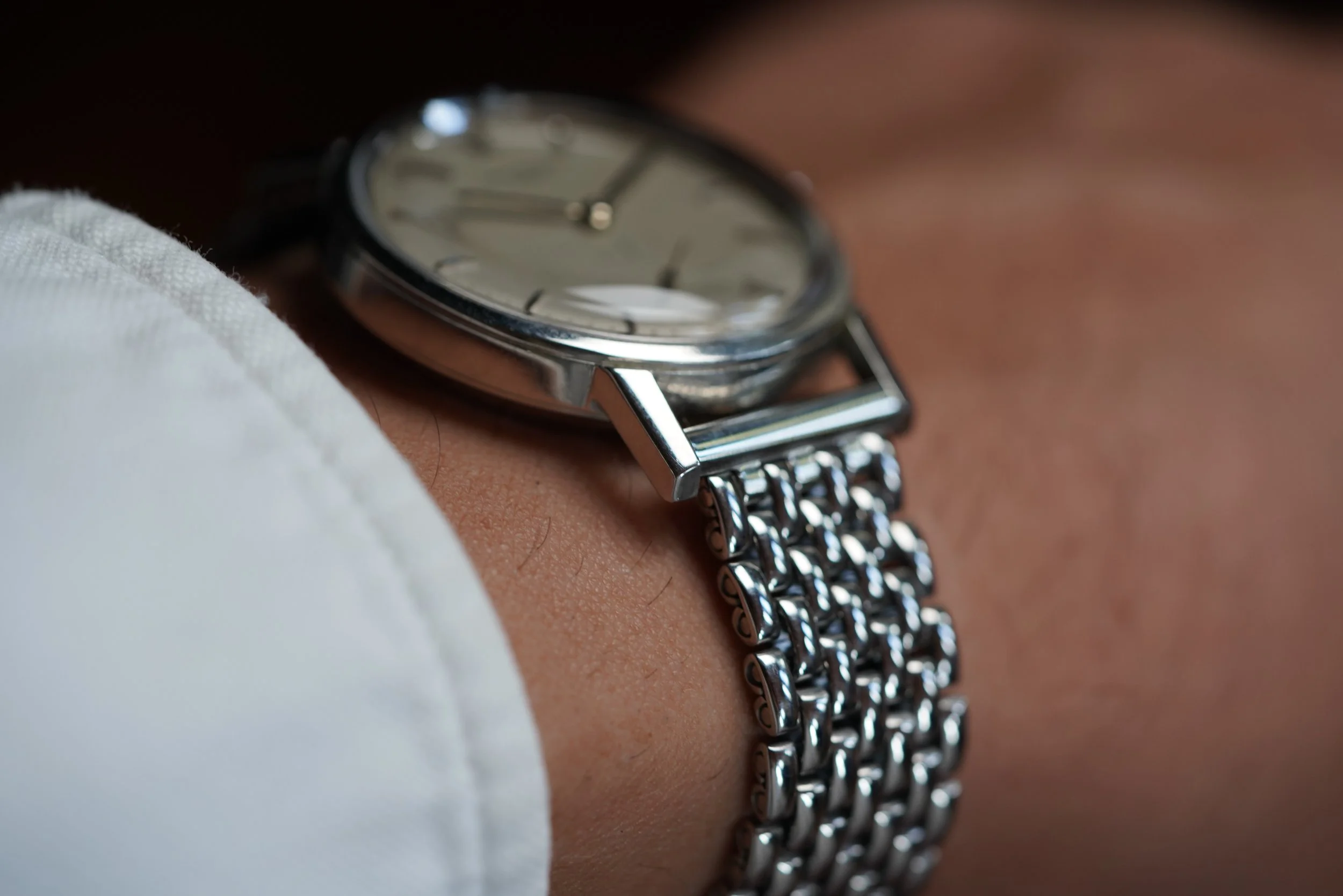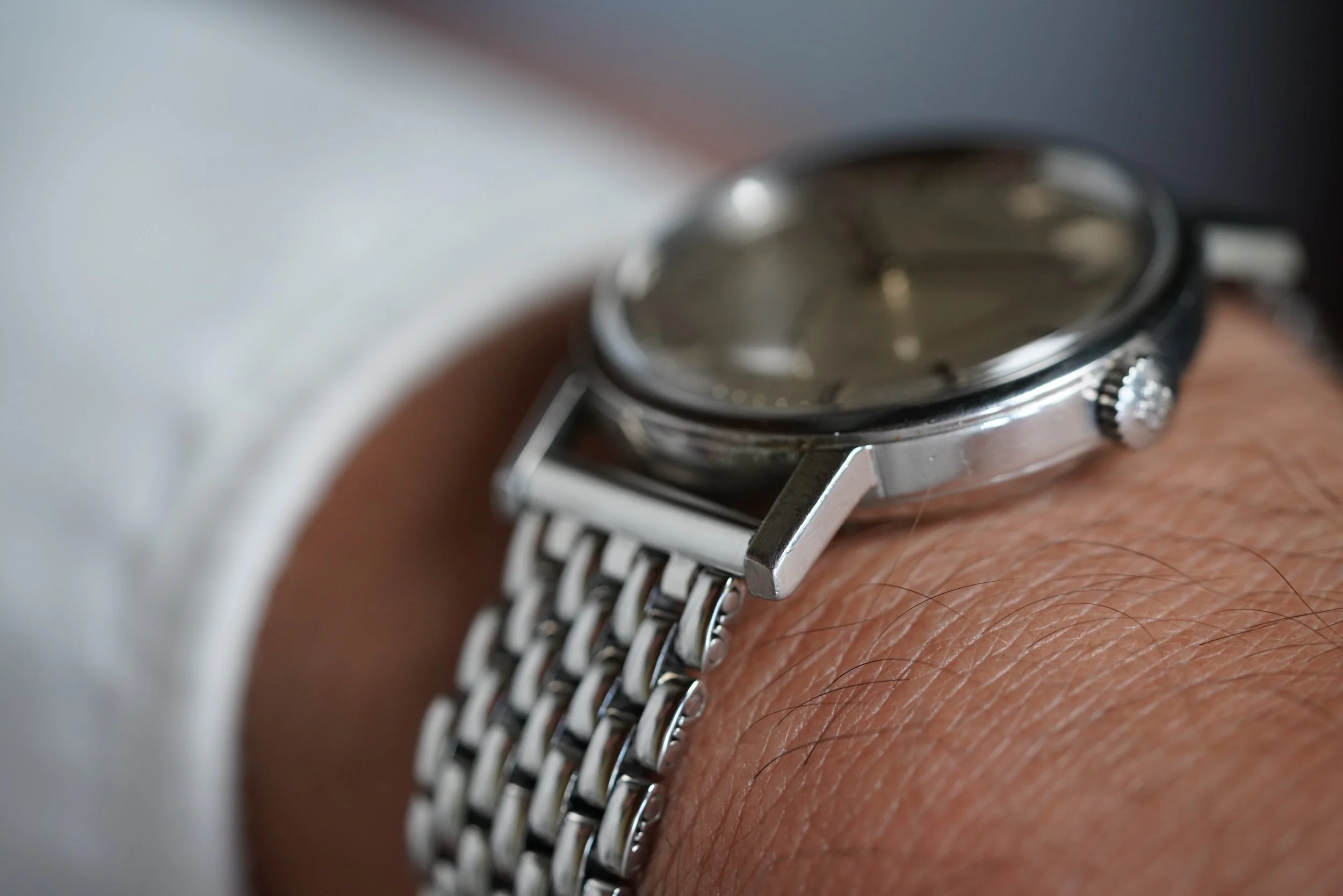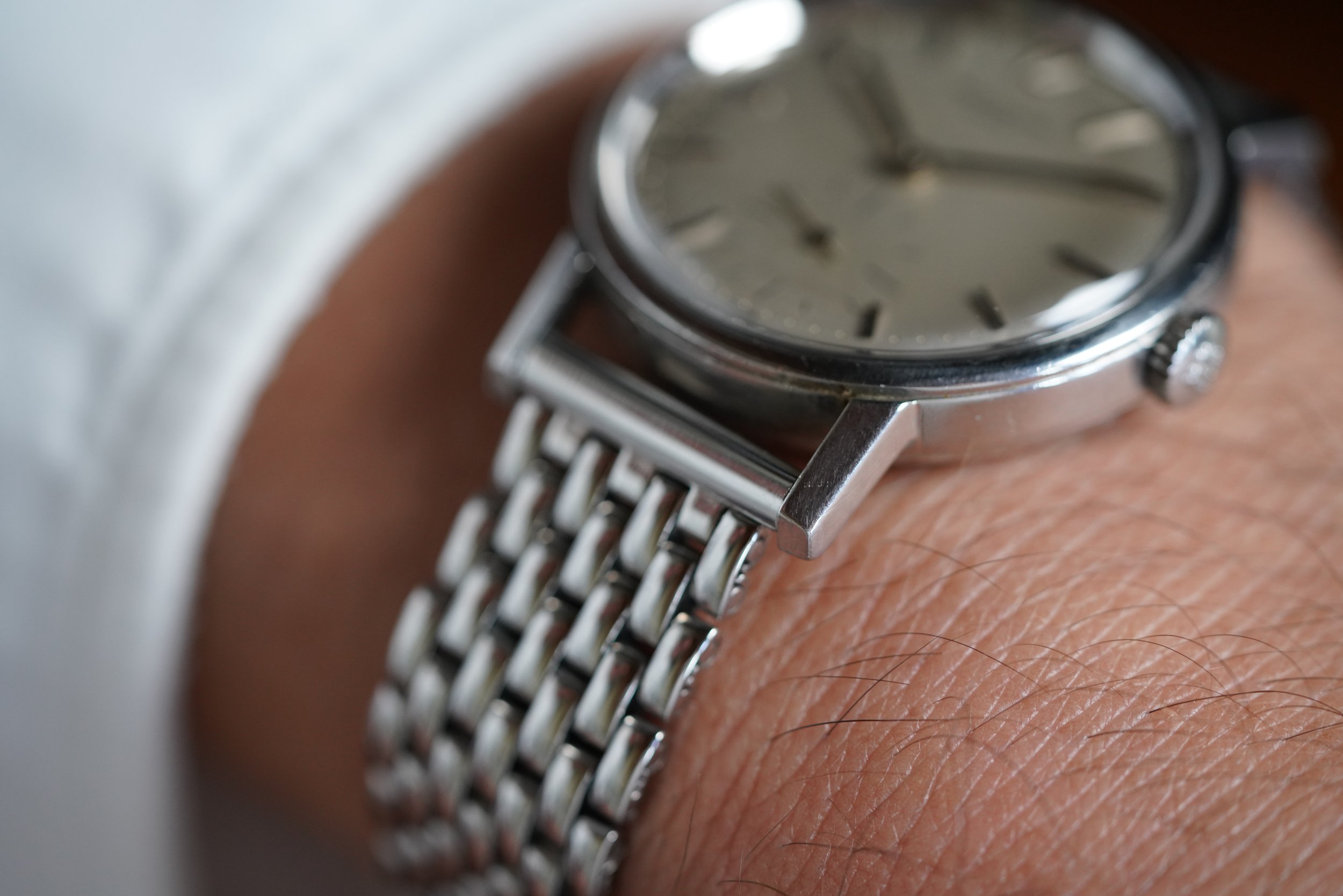 The watch comes with an Extract from the Archives. It does not come with box and papers. We do not know the service history, but it is running well. It is paired on a contemporary beads of rice bracelet by Private Eyes.