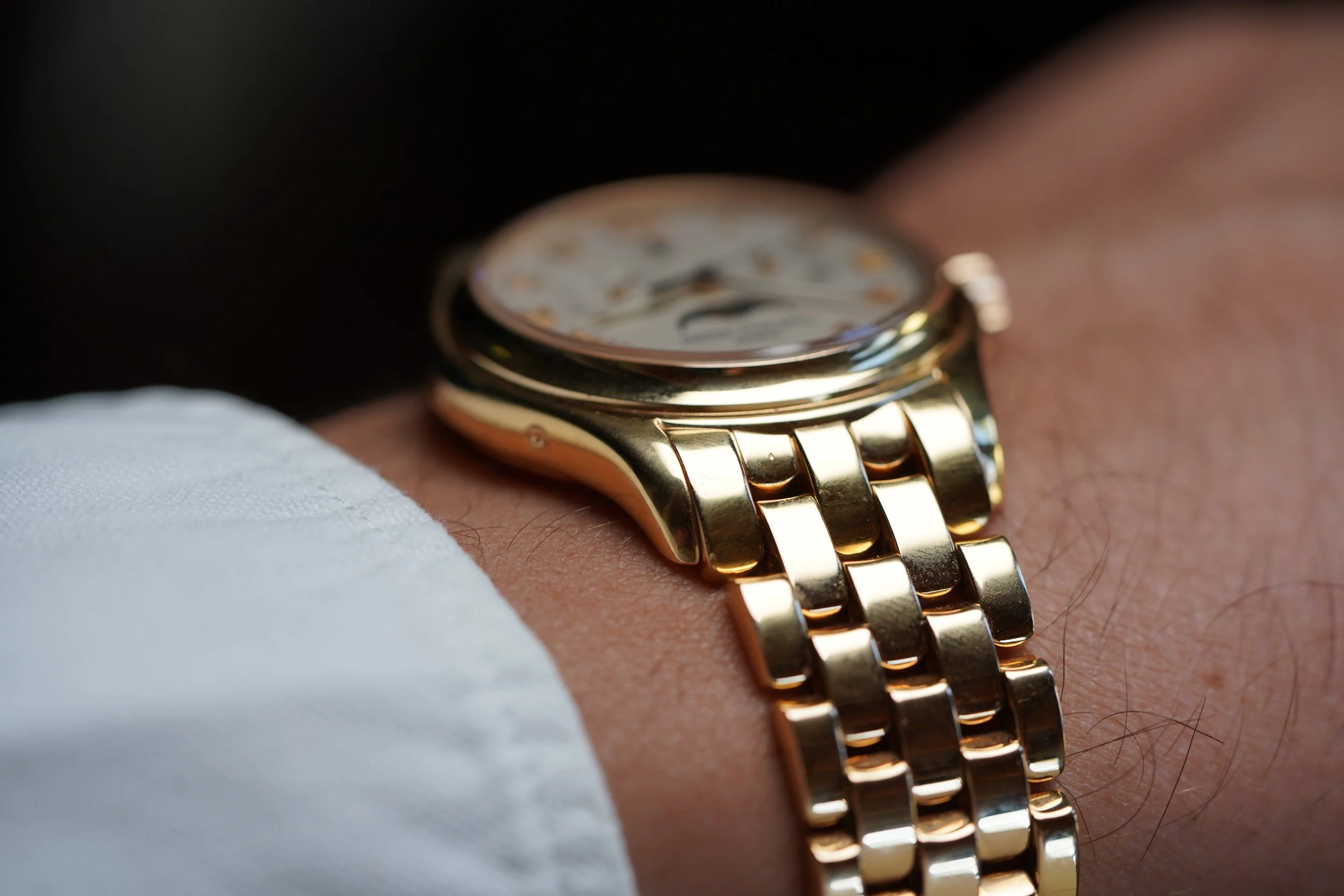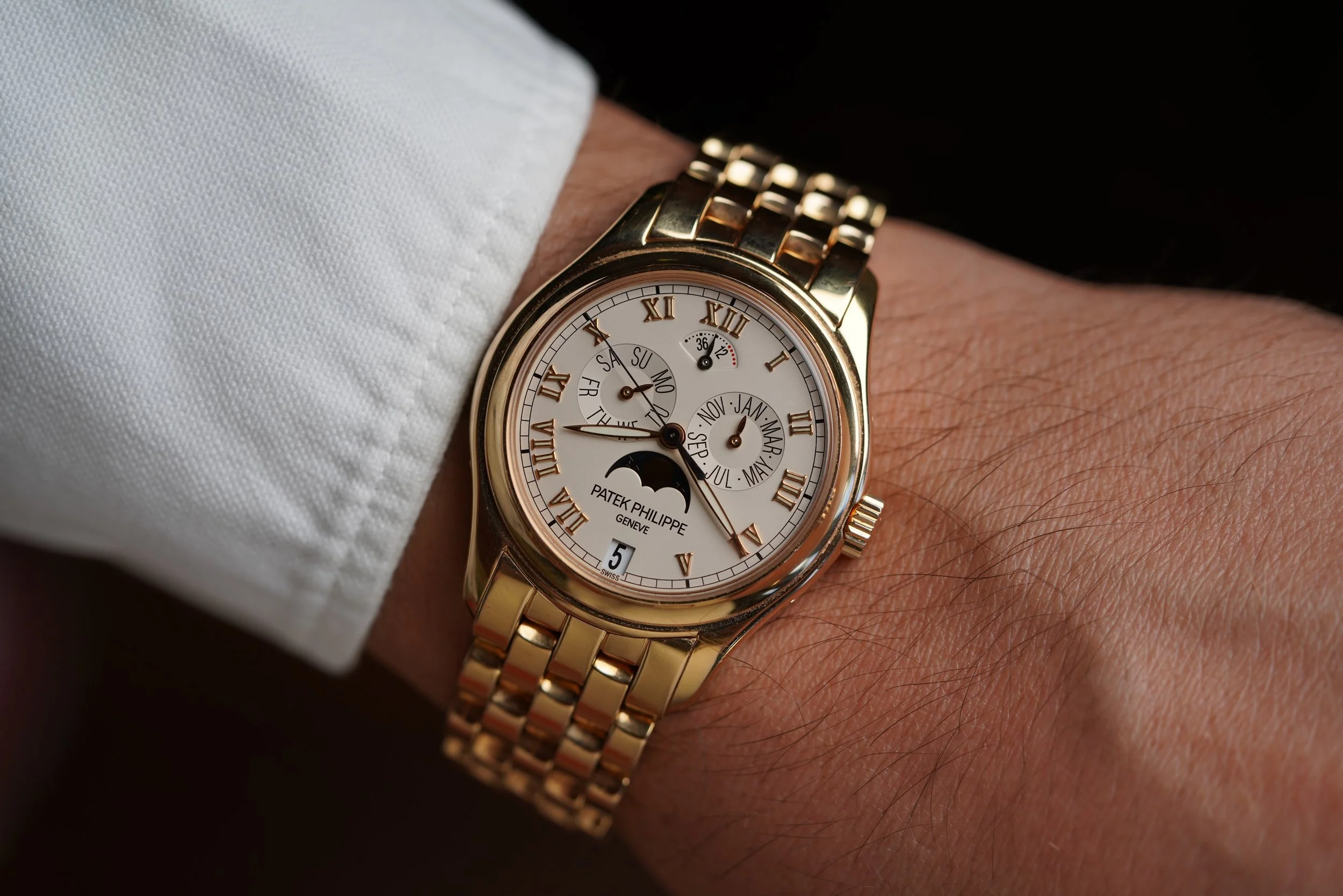The watch comes as a “full set” with a box, papers, gold pusher and Certificate of Origin. It was originally sold in 2002. It was last serviced in 2021 by Patek Philippe.