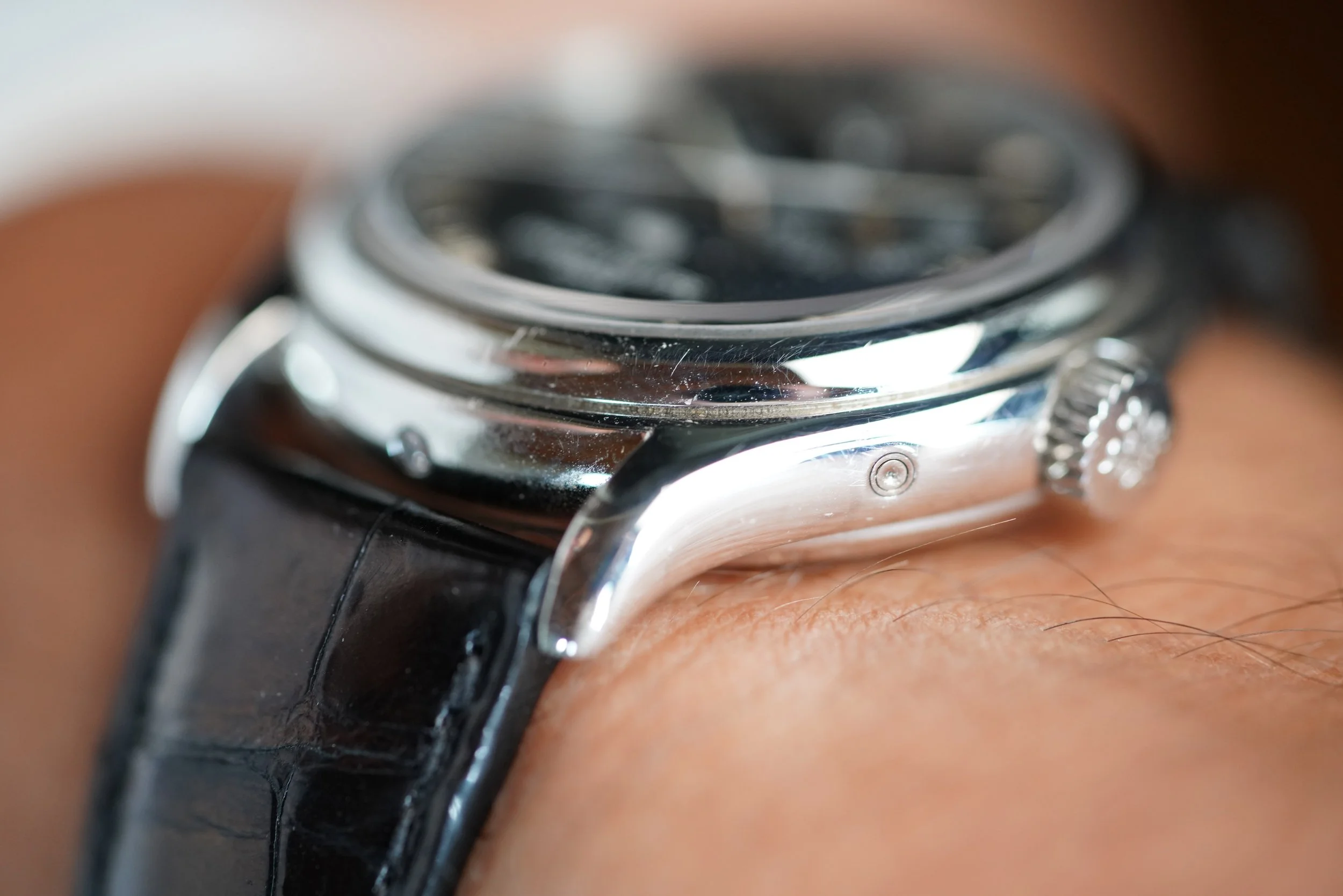 The watch comes with box and Certificate of Origin. We do not know the service history but it is running well. It was produced in 2003. It comes with its original platinum tang buckle.