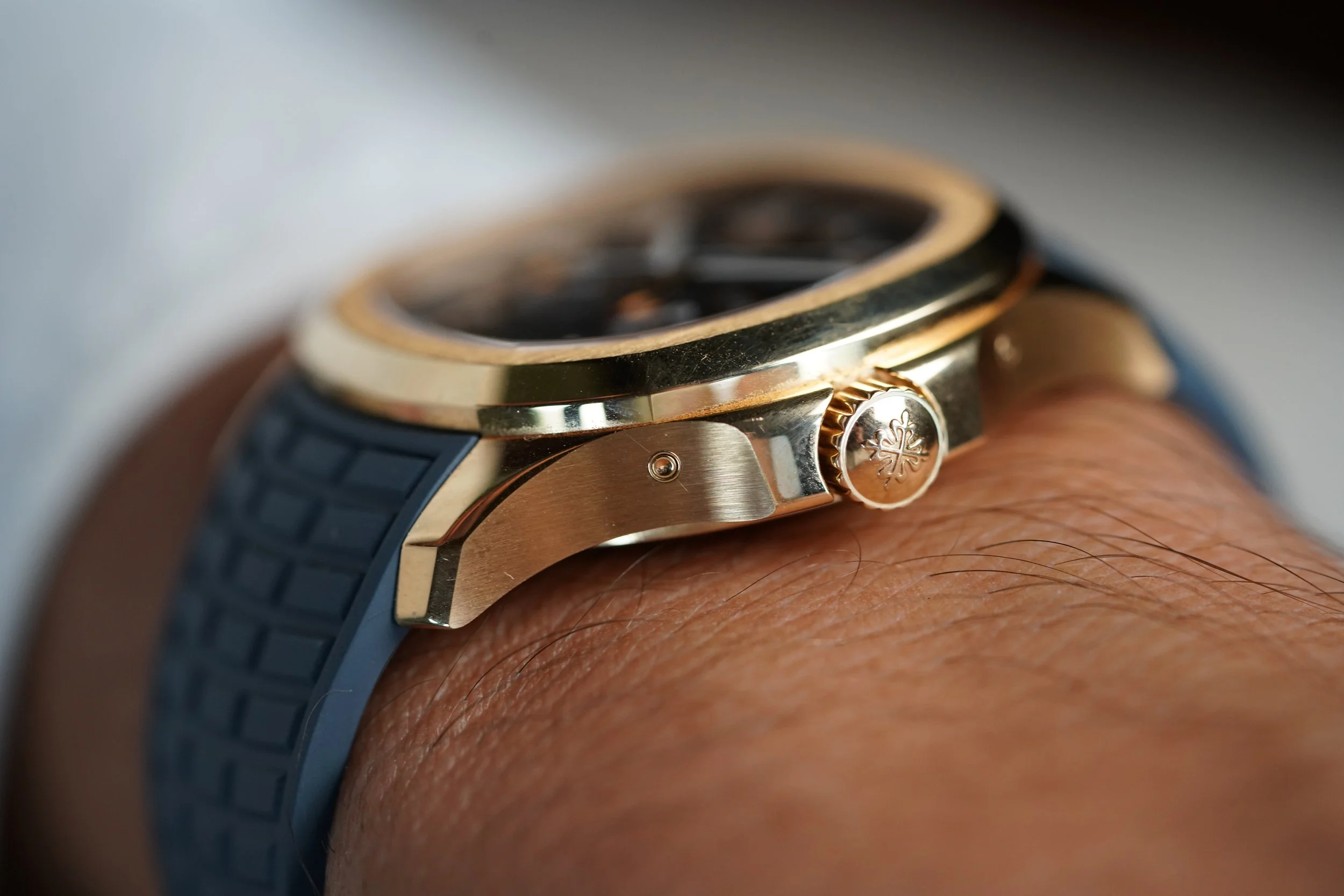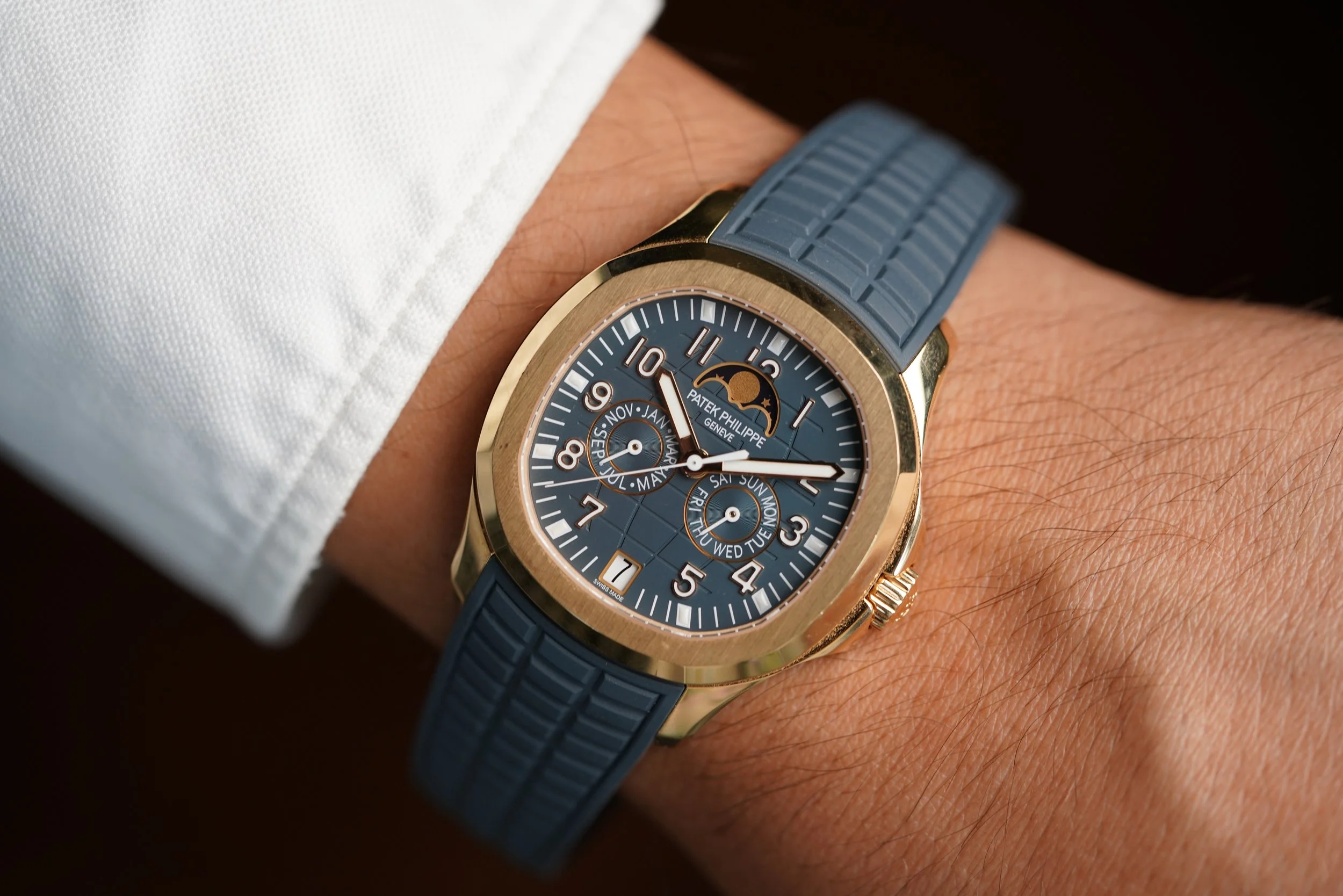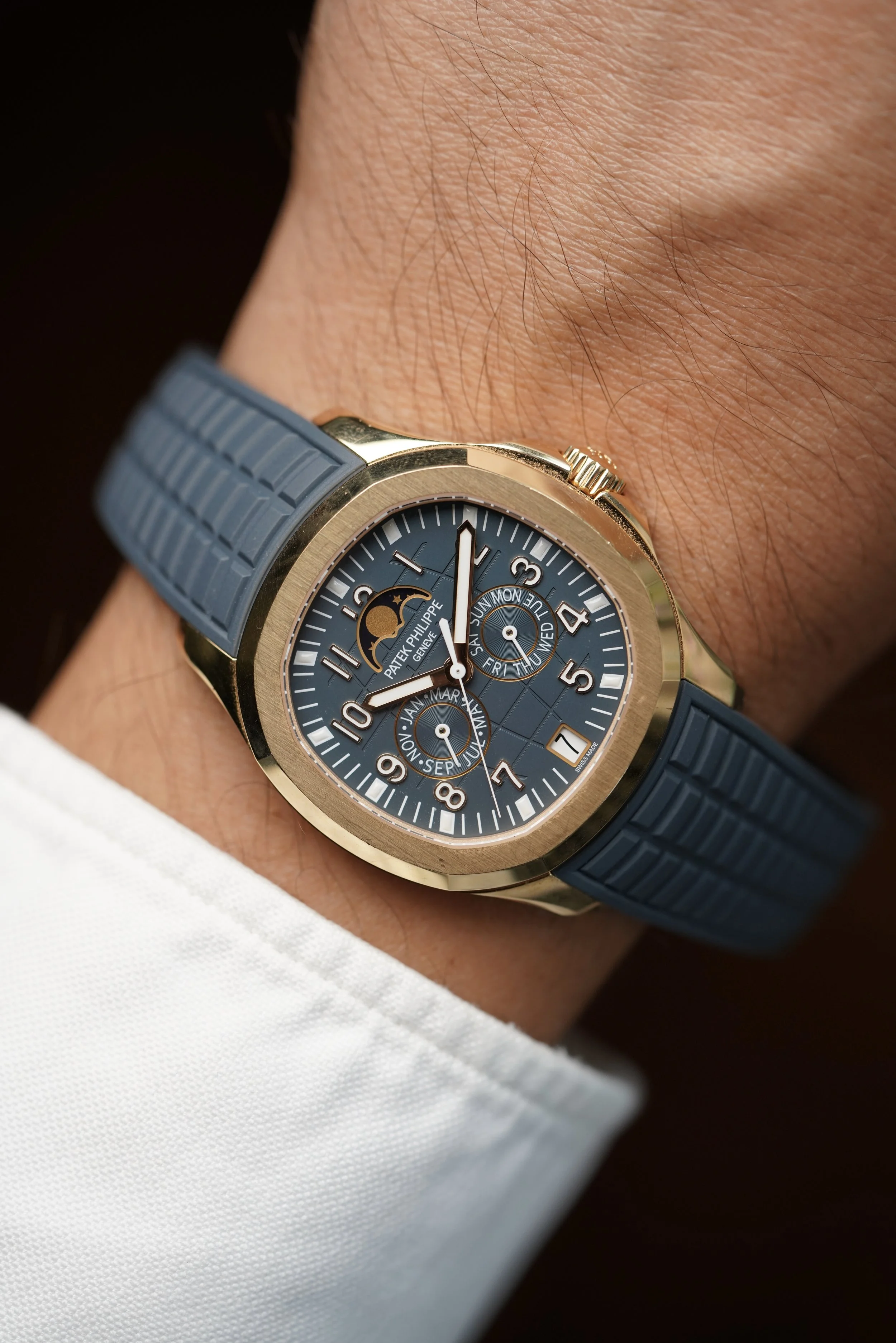 The Patek Philippe Aquanaut is one of the most desired sports watches on the planet, and this 5261R-001 is a spectacular complicated iteration on the model. The combination of the 18K rose gold case and dial/strap color create a vibrant and youthful look and is part of the “Luce” line.