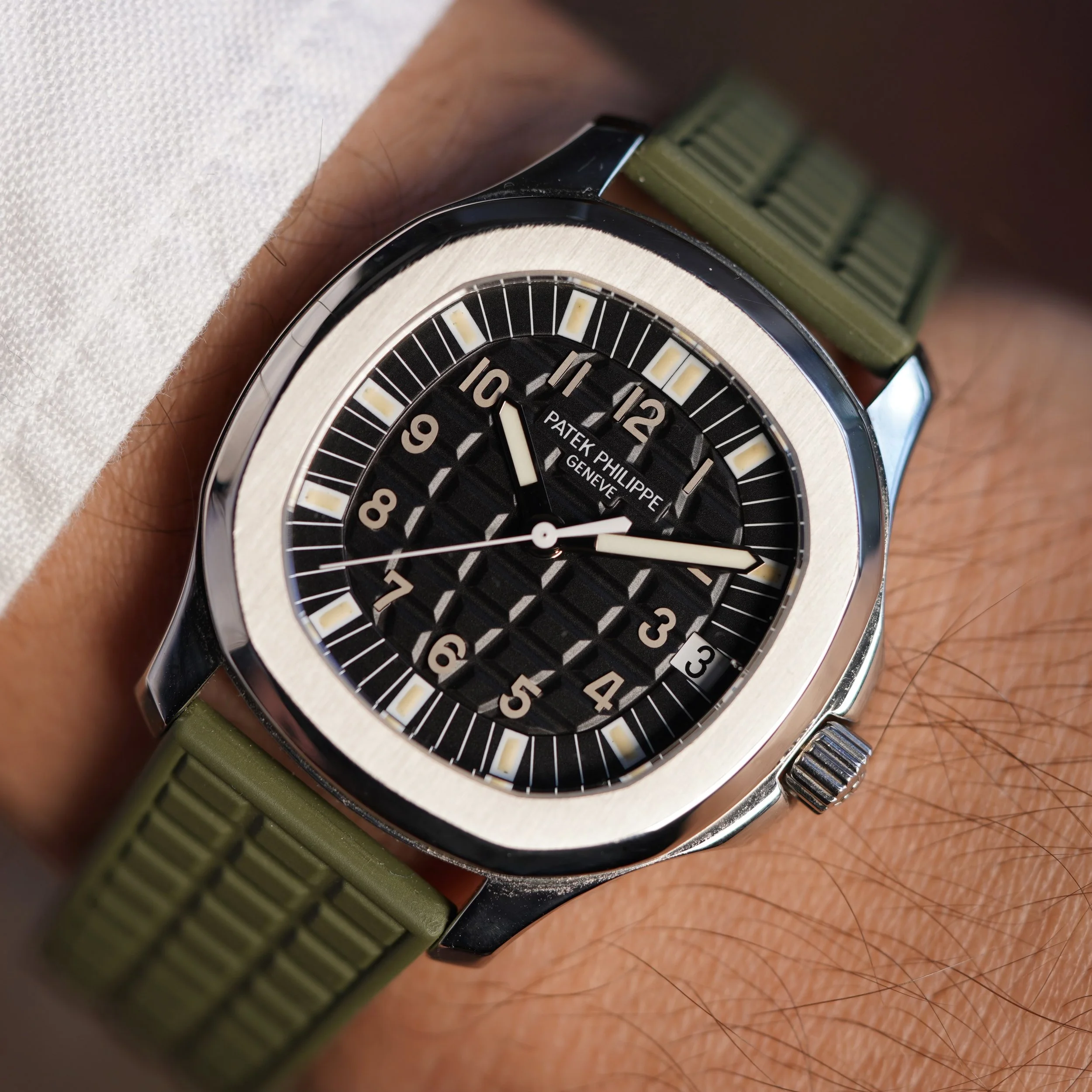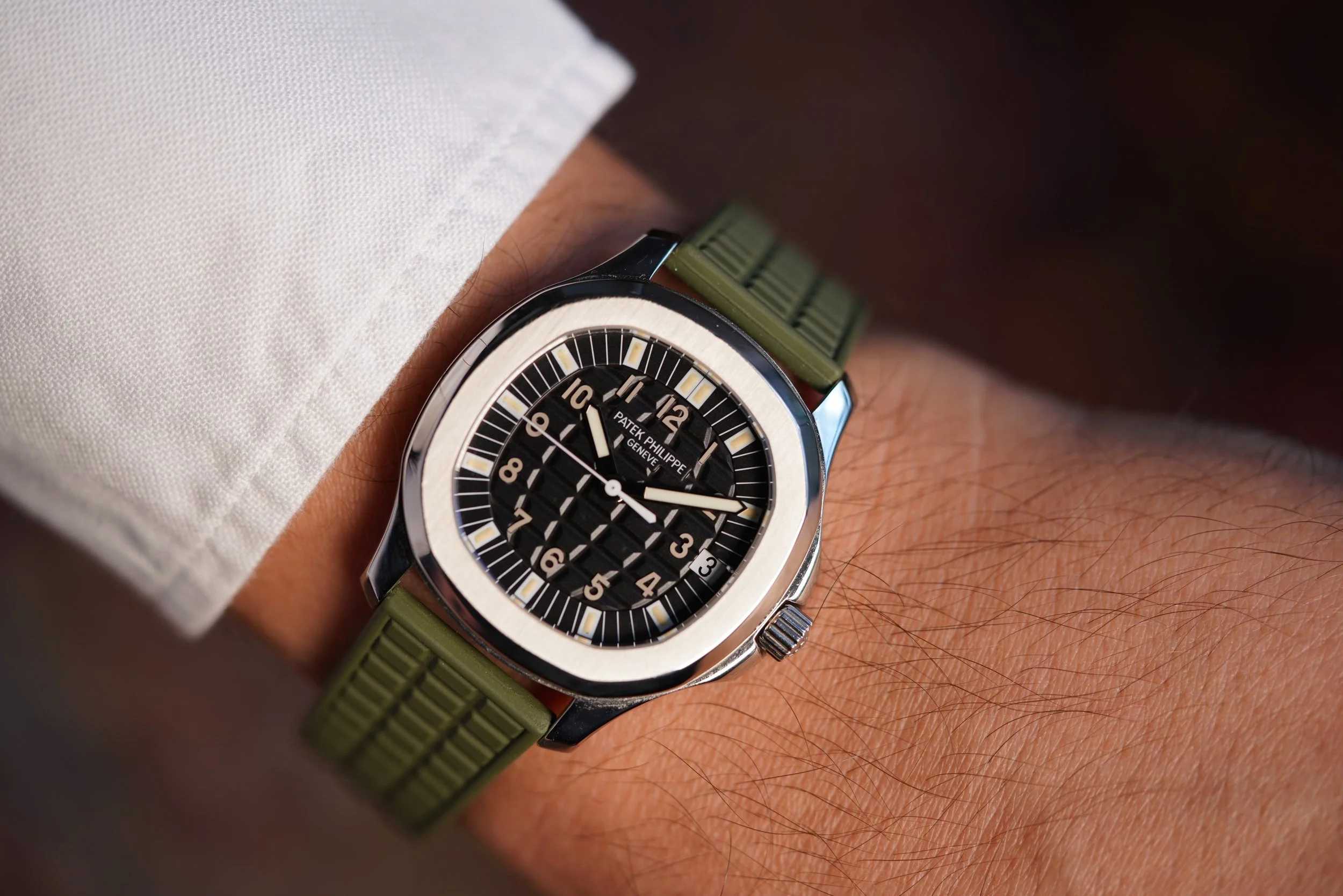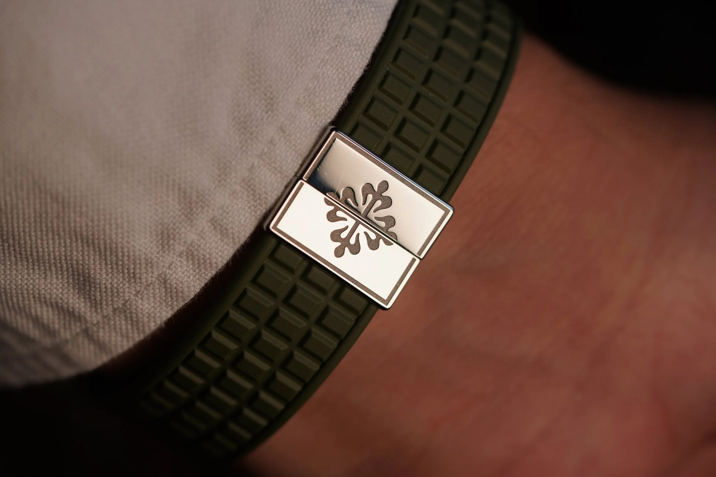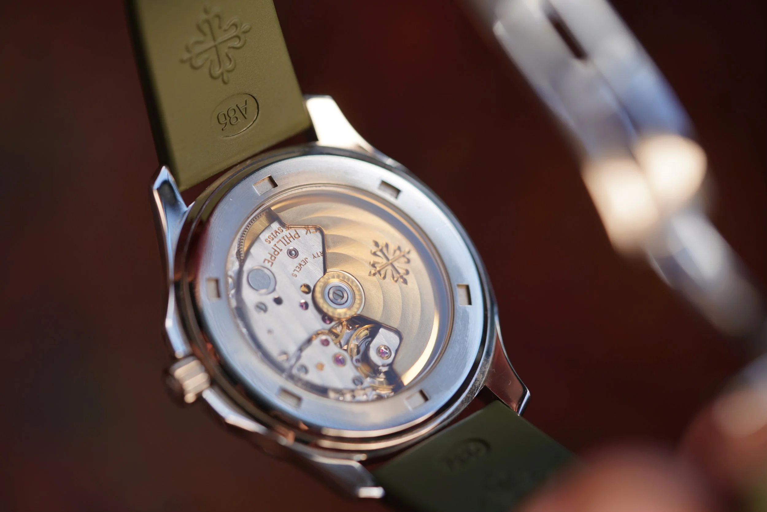 It is powered by the calibre 330 SC and is on view through its exhibition caseback. The watch features the desirable PP khaki-green rubber (tropical) strap.