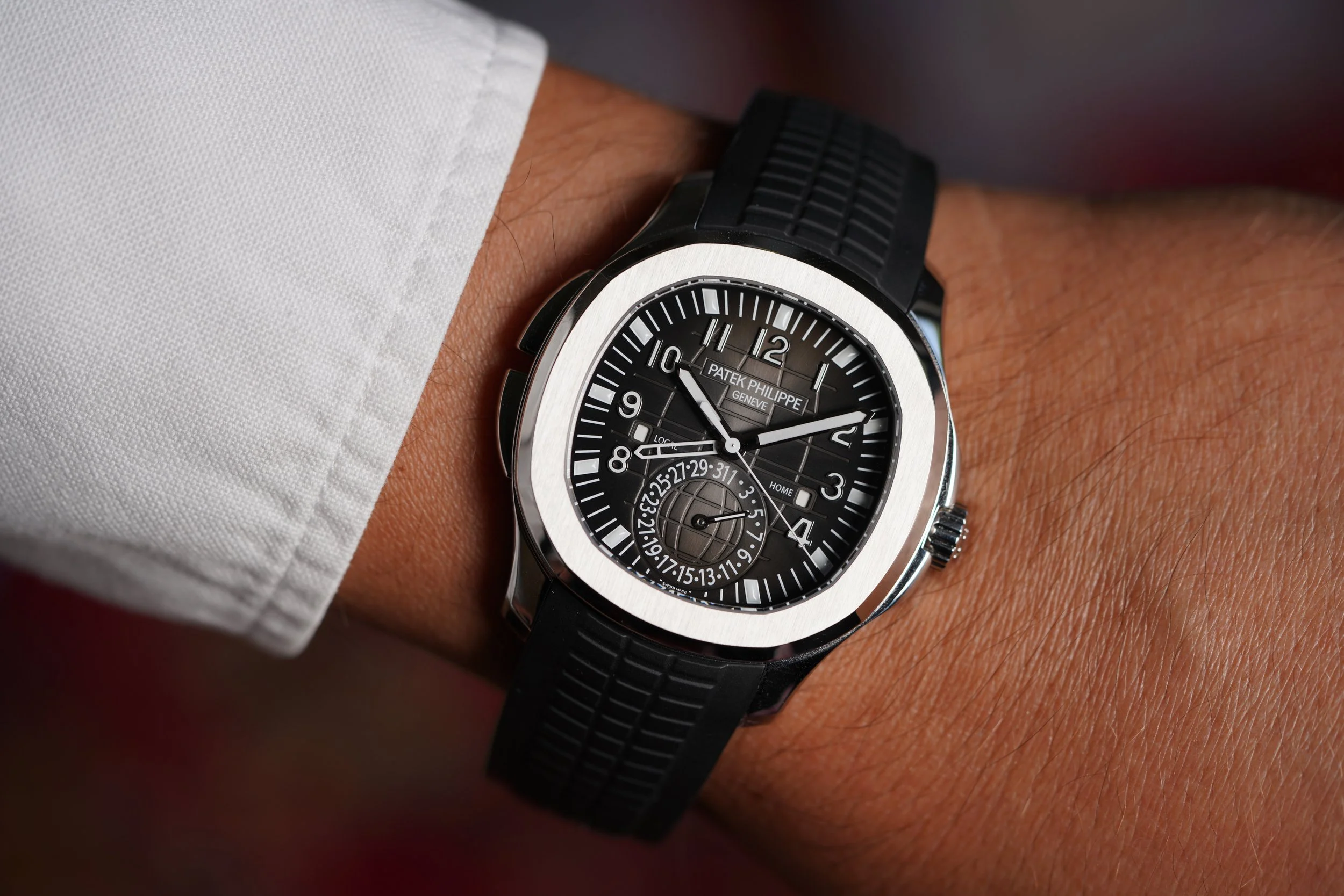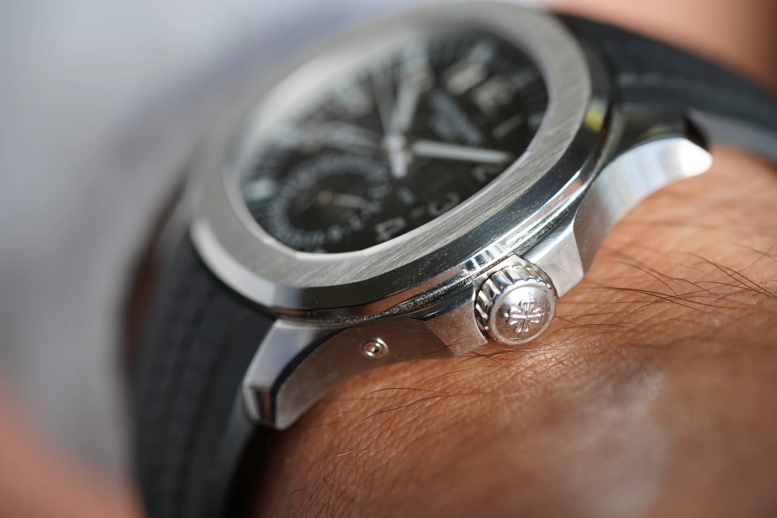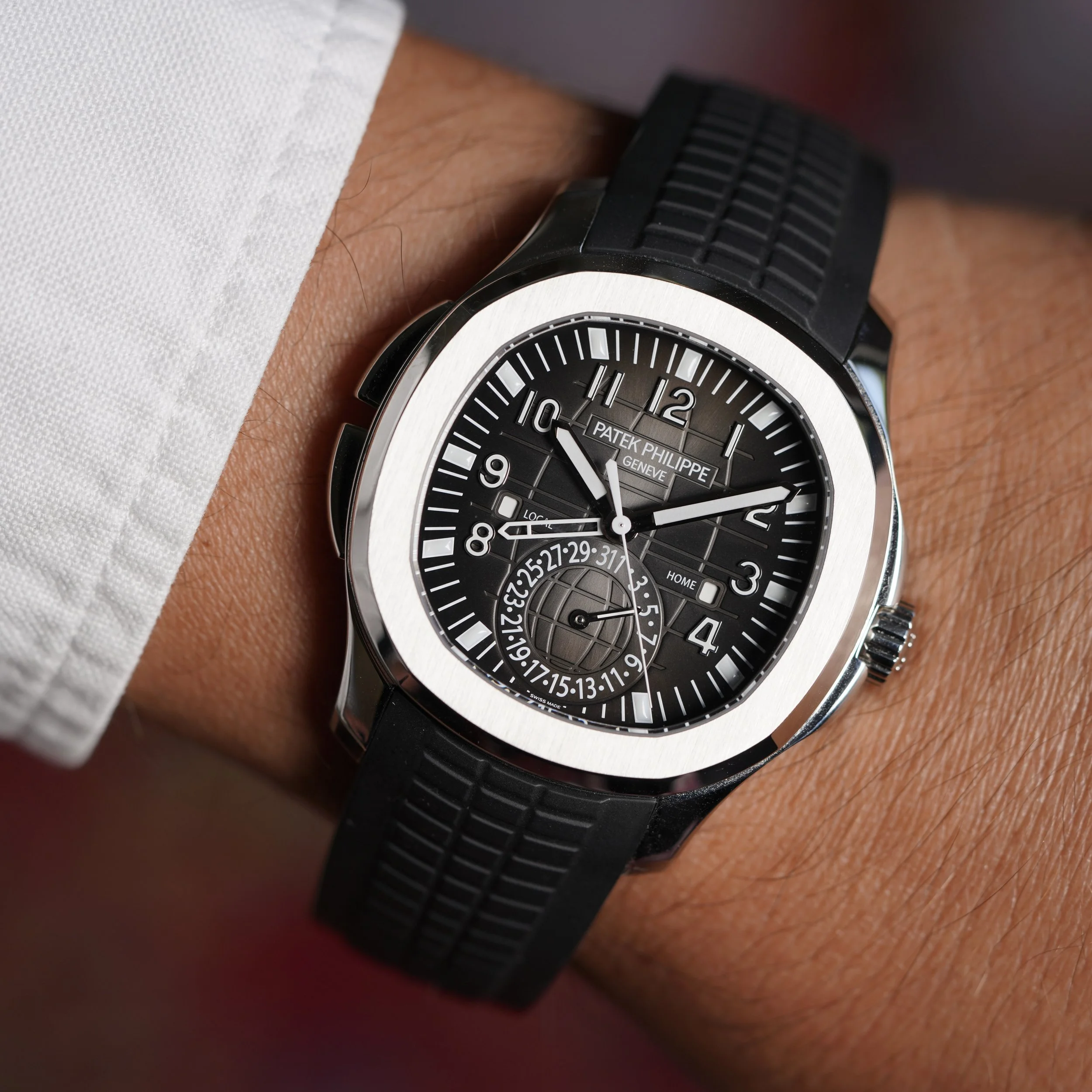 This Patek Philippe Aquanaut reference 5164A is a spectacular complicated sports watch from the leading name in watchmaking. The travel-time complication is powered by the 26-330 S C FUS allowing the owner to simplify a second reference time while away from home. The case is in fantastic condition and remains unpolished.
