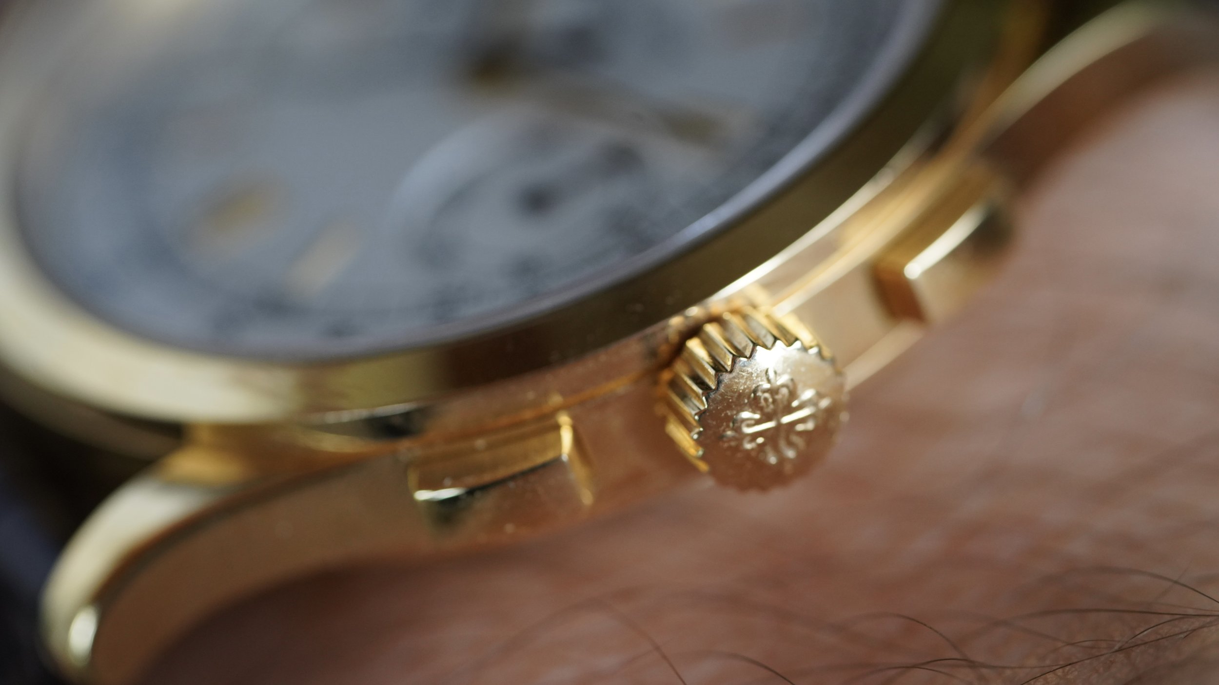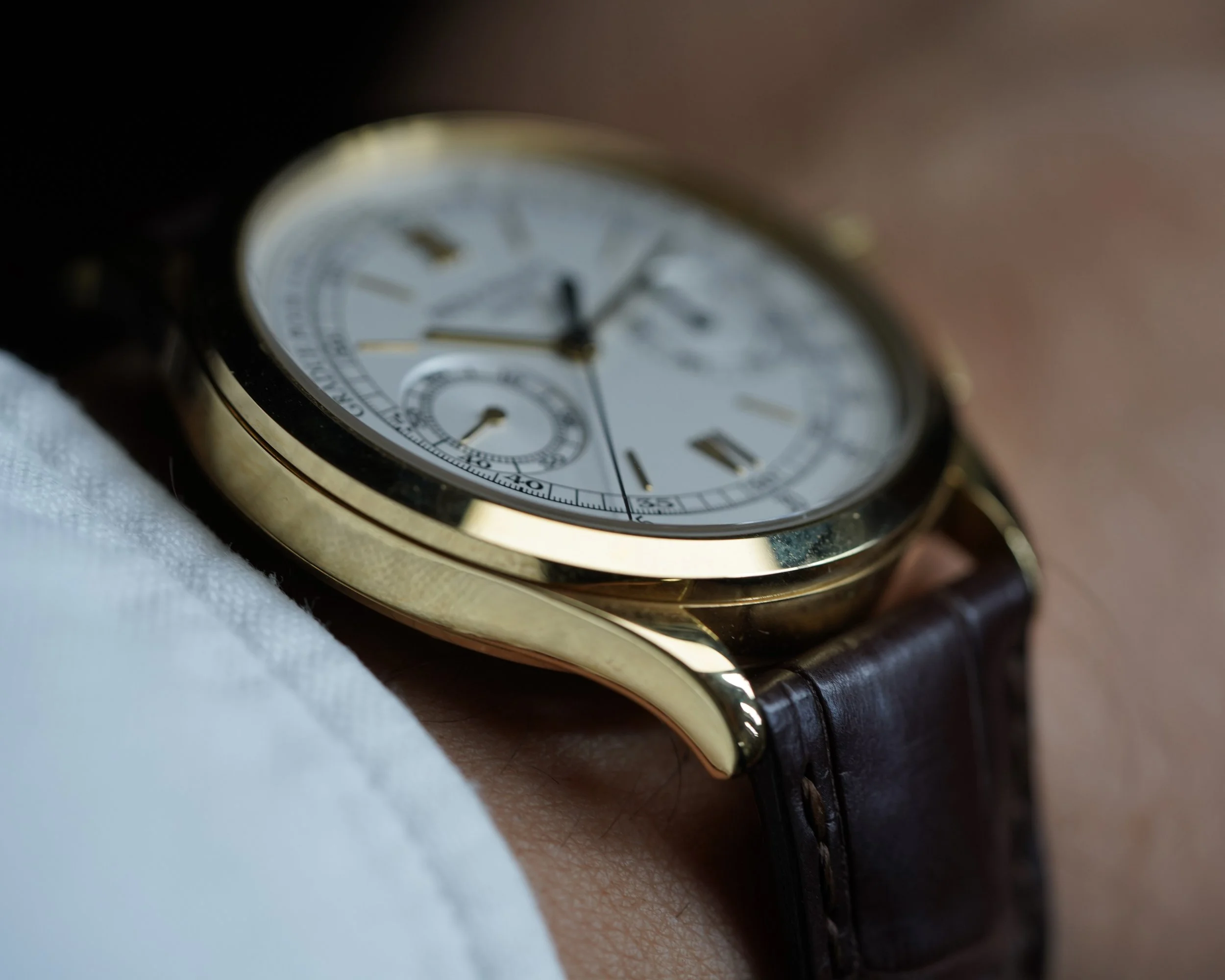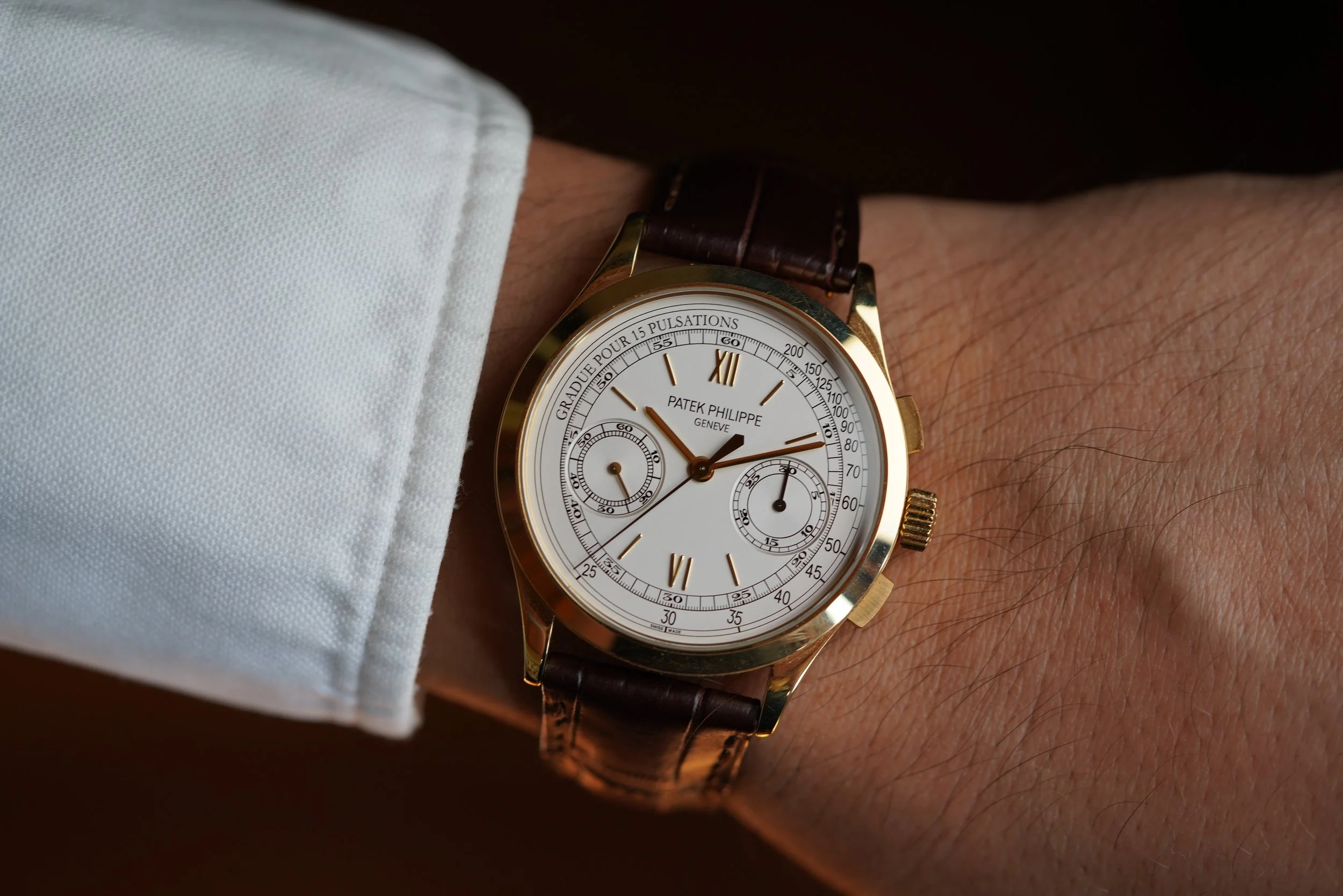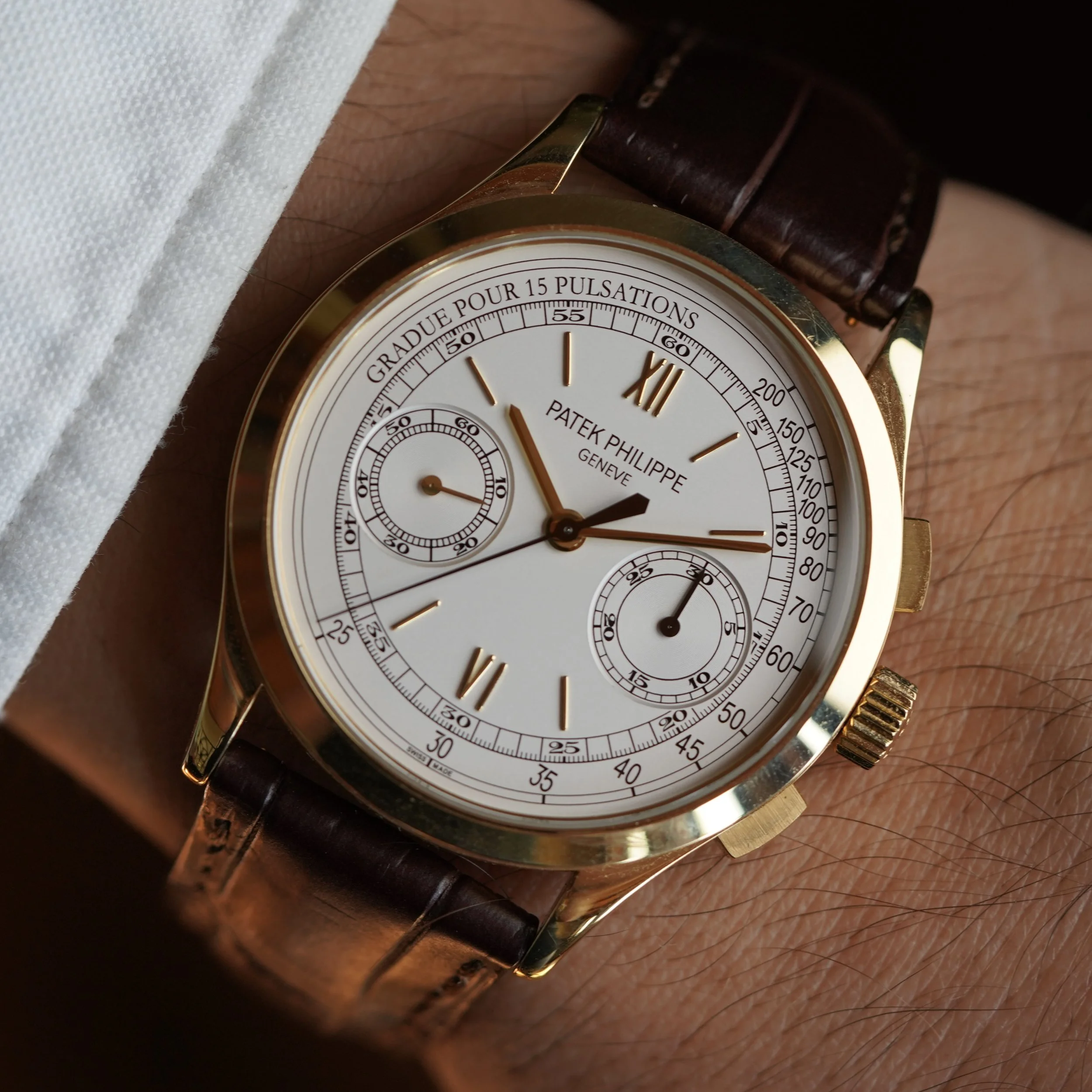This Patek Philippe chronograph reference 5170J-001 is a spectacular timepiece. It features a beautiful pulsations dial. The case is made of 18K yellow gold. It measures approximately 39mm in diameter. The case appears to be unpolished. This example dates to circa 2012.