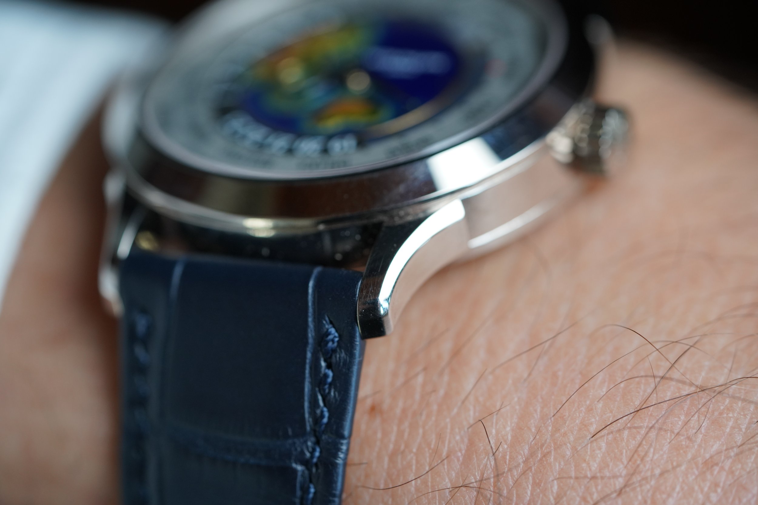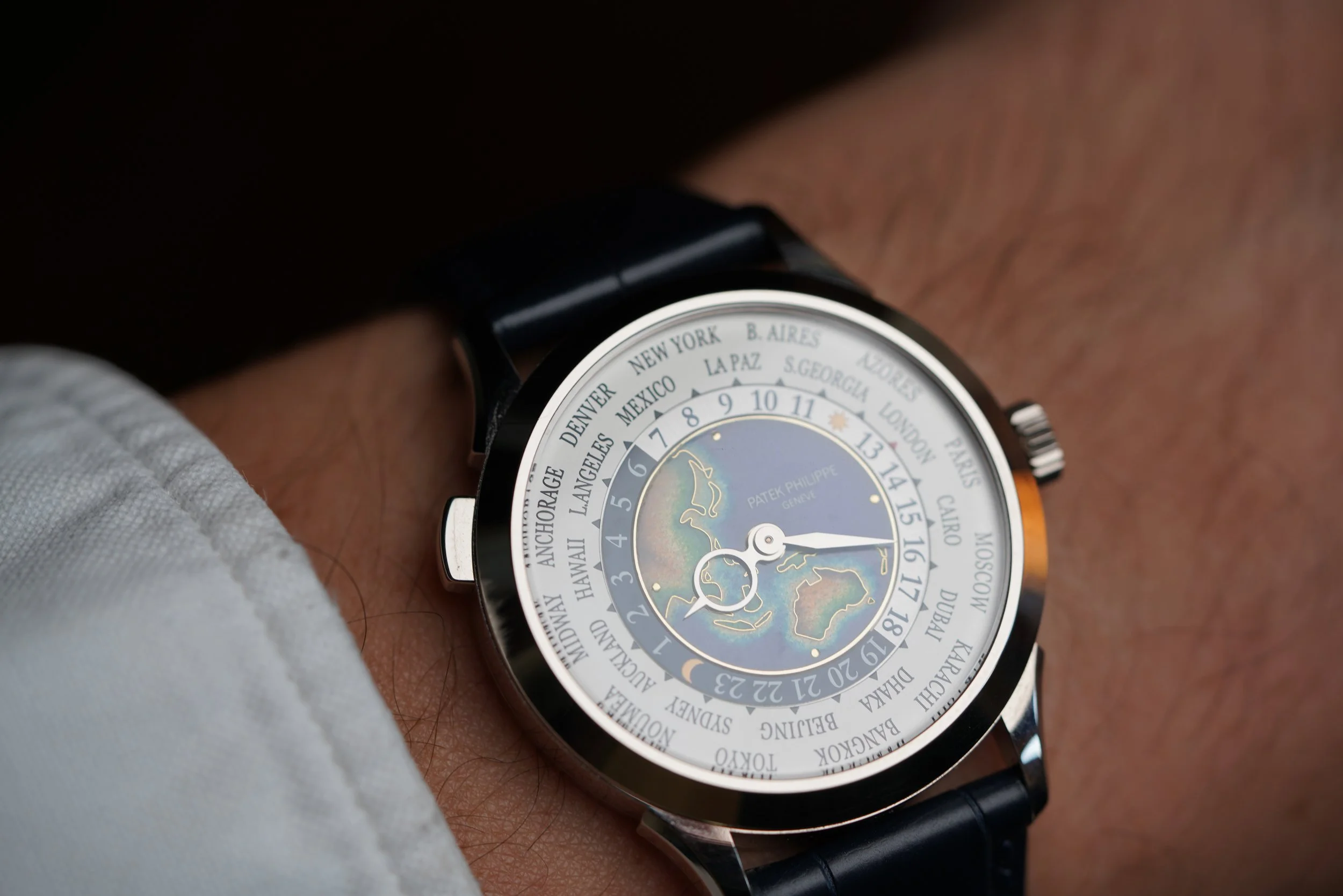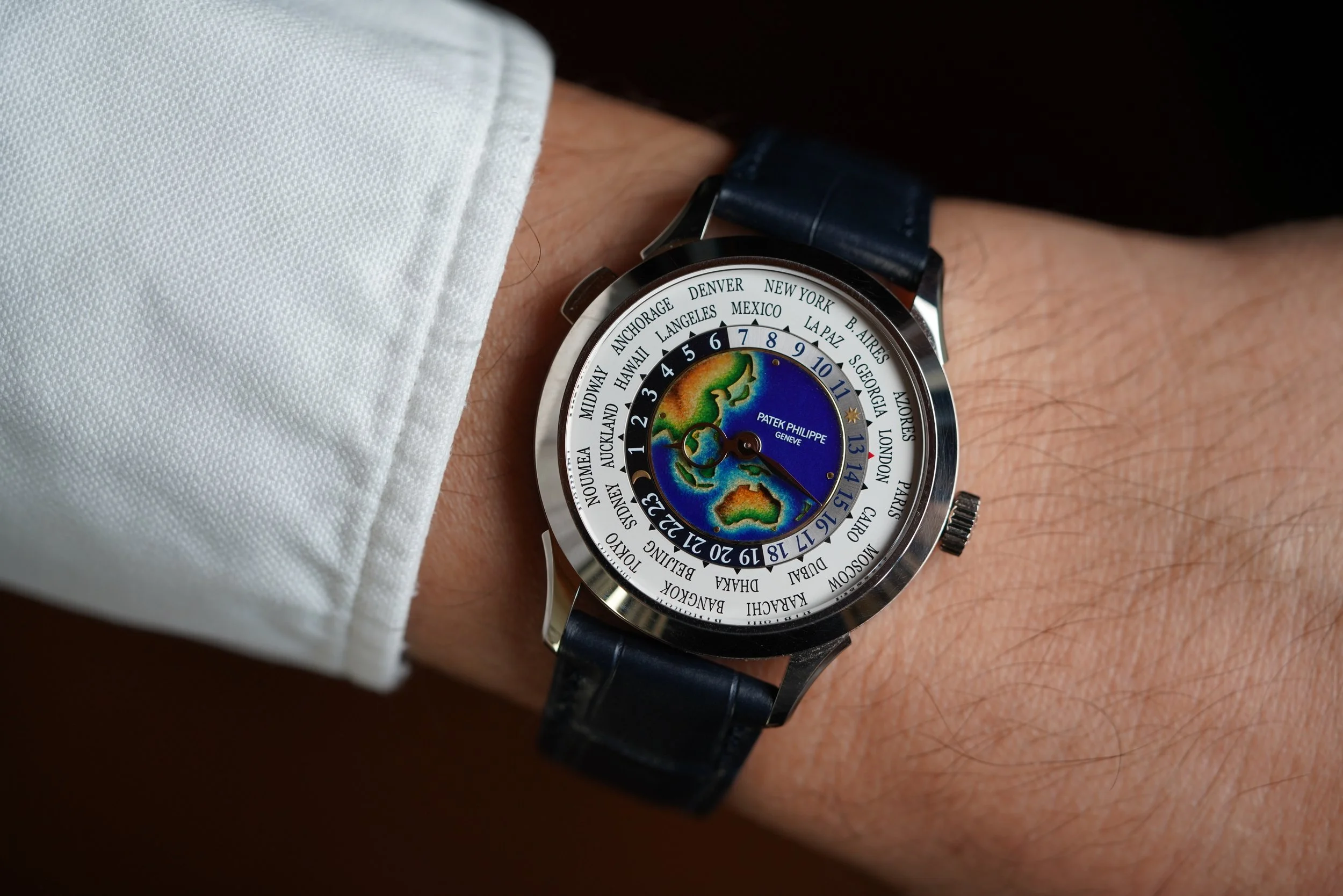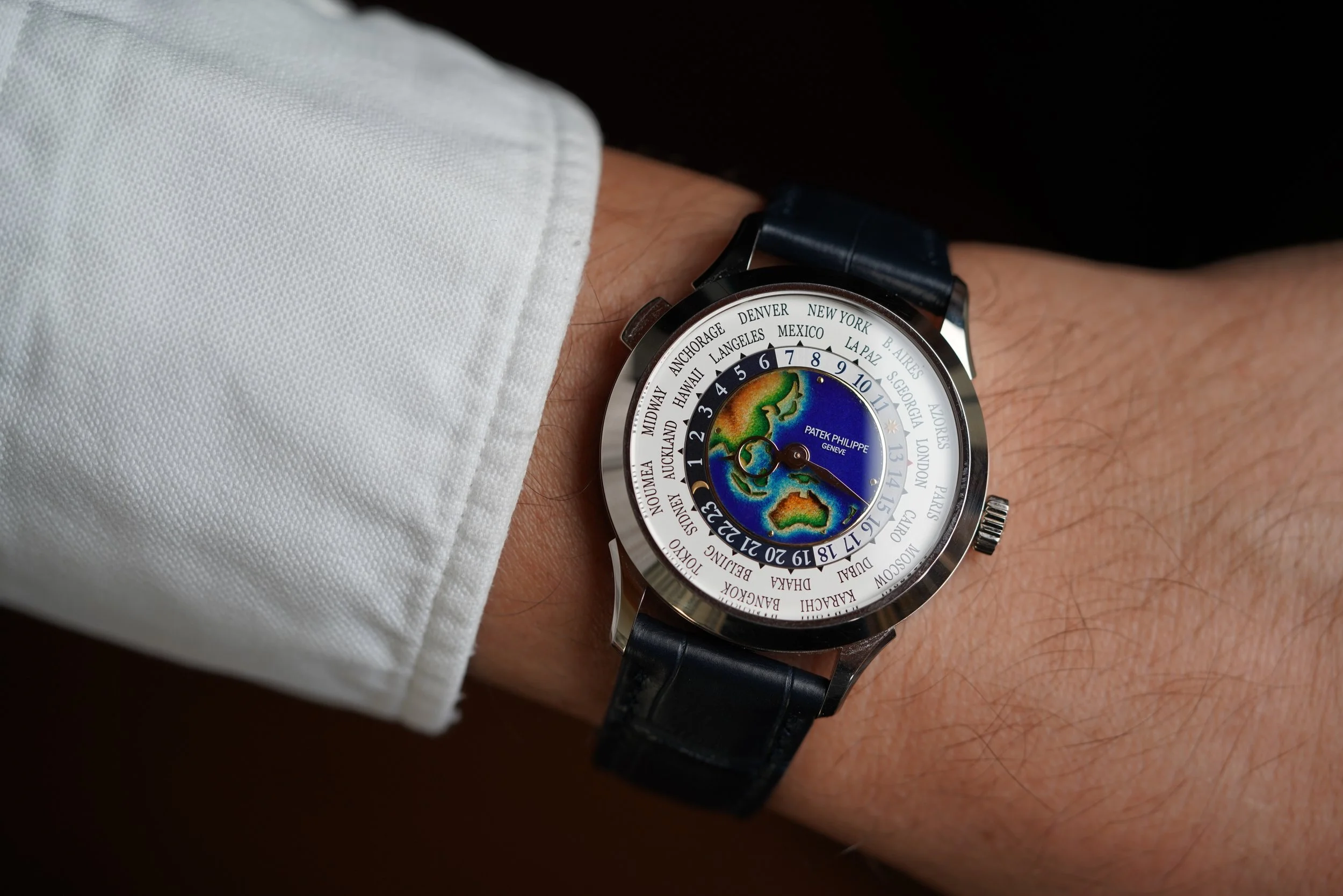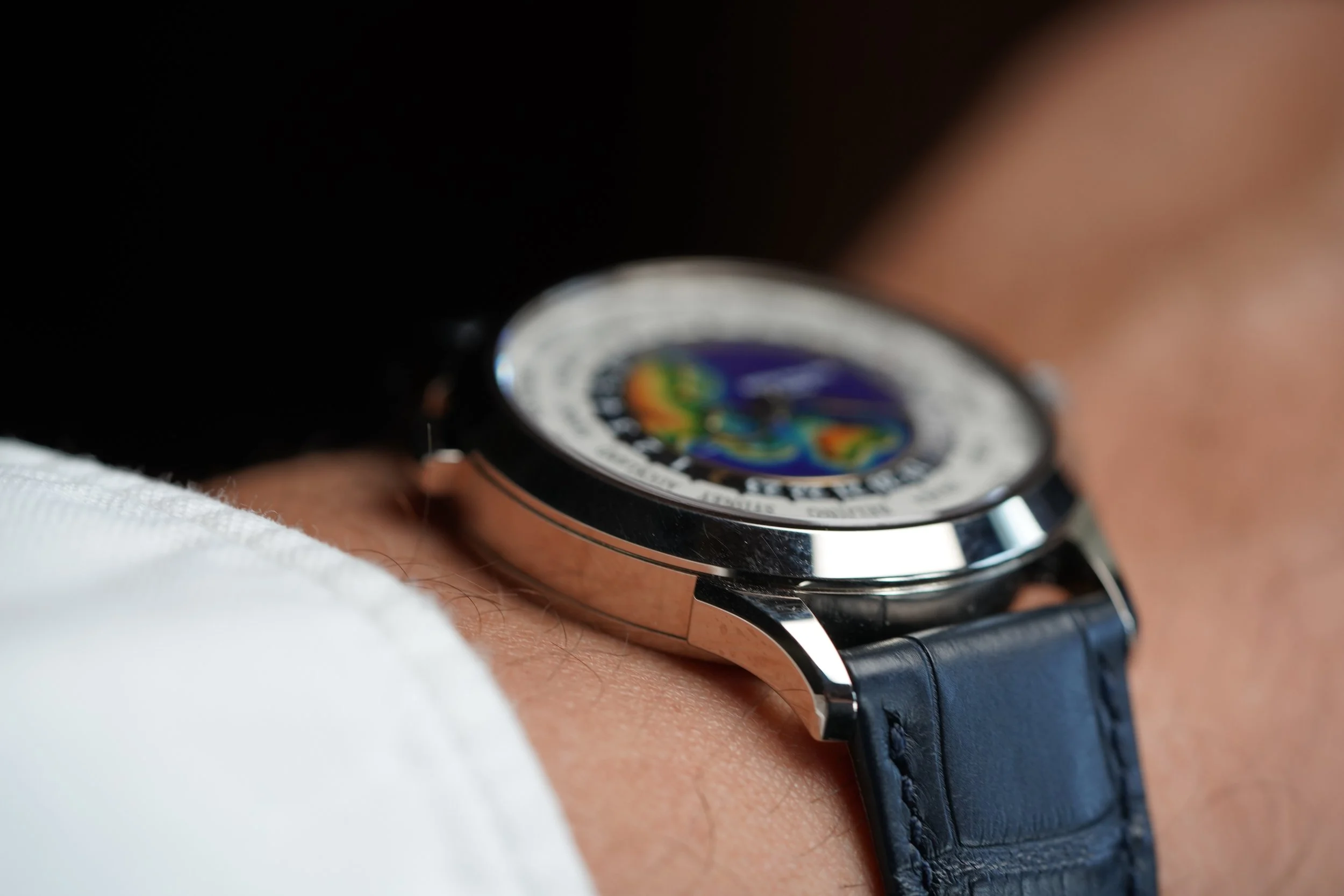 This Patek Philippe World Time reference 5231G-001 is an incredibly special timepiece. The dial is cloisonné Grand Feu enamel depicting Southeast Asia and Oceania. The colors are tremendous in these dials and a beautiful scene each time you look at the time. The watch is powered by the calibre 240 HU - an ultra-thin self-winding movement with a 24-hour disc to set the time for any major city you travel to. The 18k white gold case appears to be unpolished. It features beautiful lozenge hands with the classic World Time hour hand. The watch debuted in 2022 and is one of the most sophisticated Patek Philippe references in the catalog. It measures 38.5mm in diameter, 47mm lug-to-lug and 10mm thick This watch retails for $117,507 before taxes.