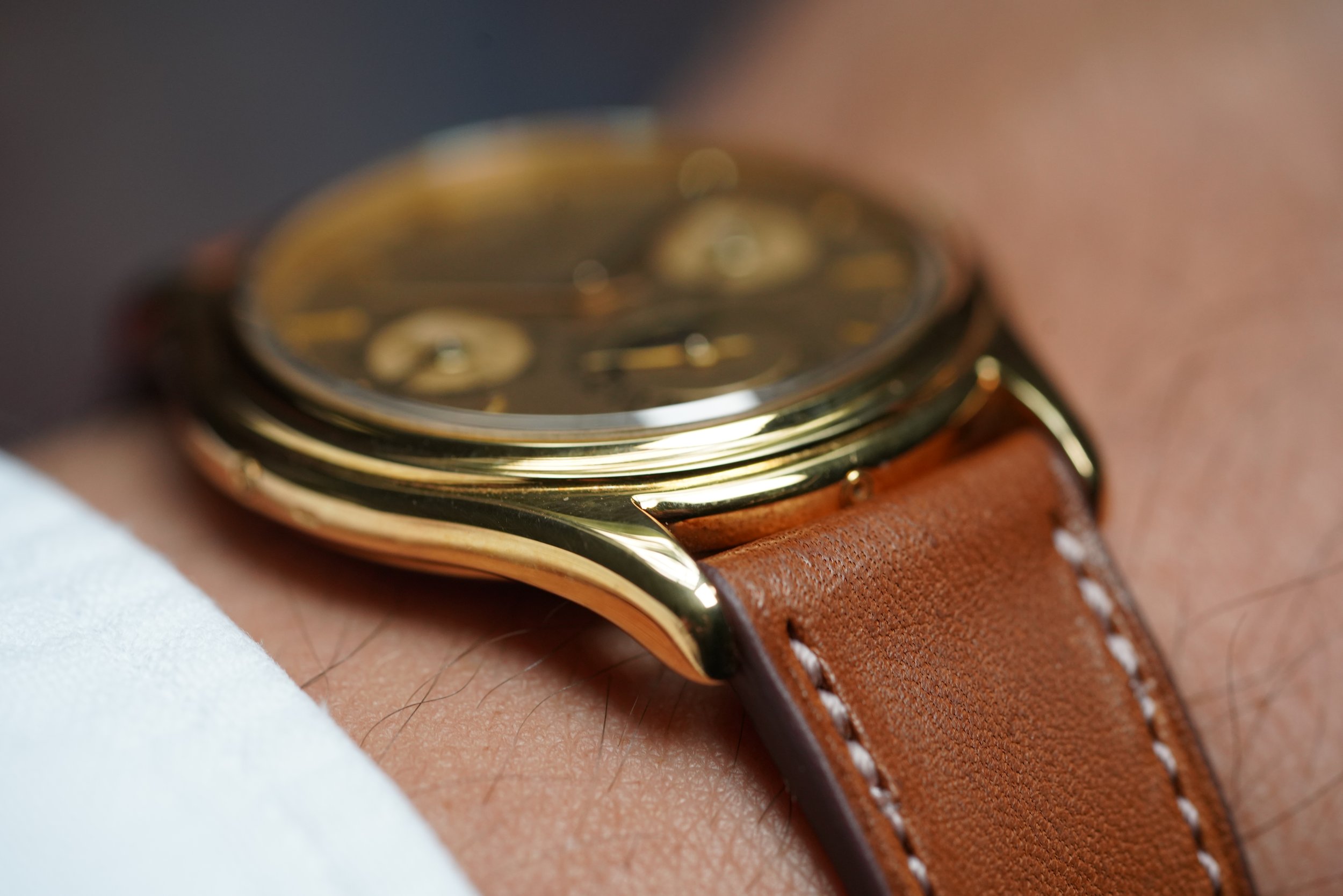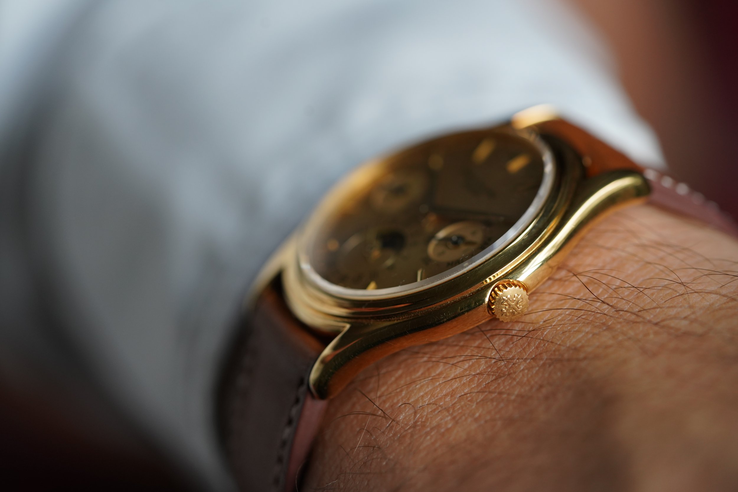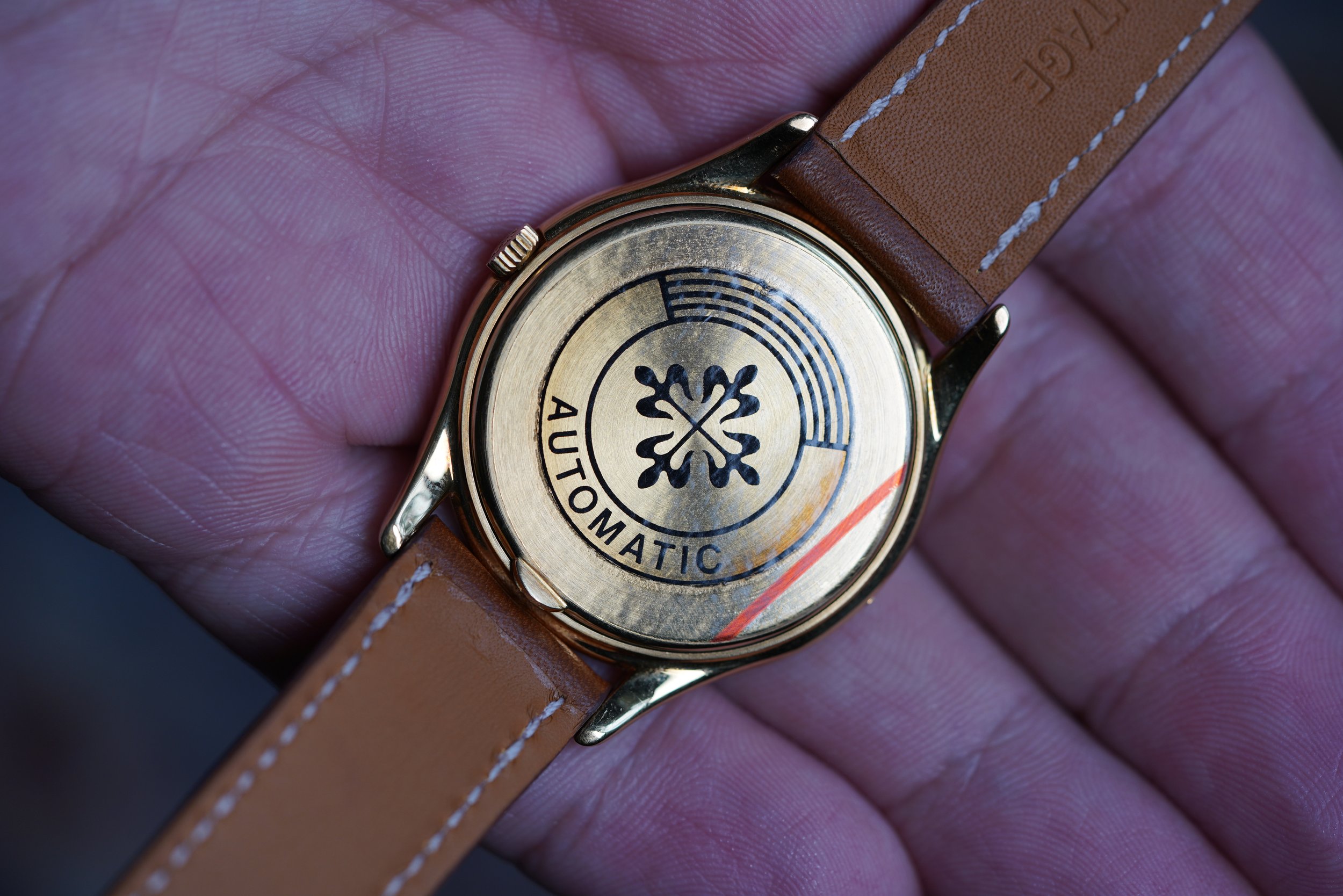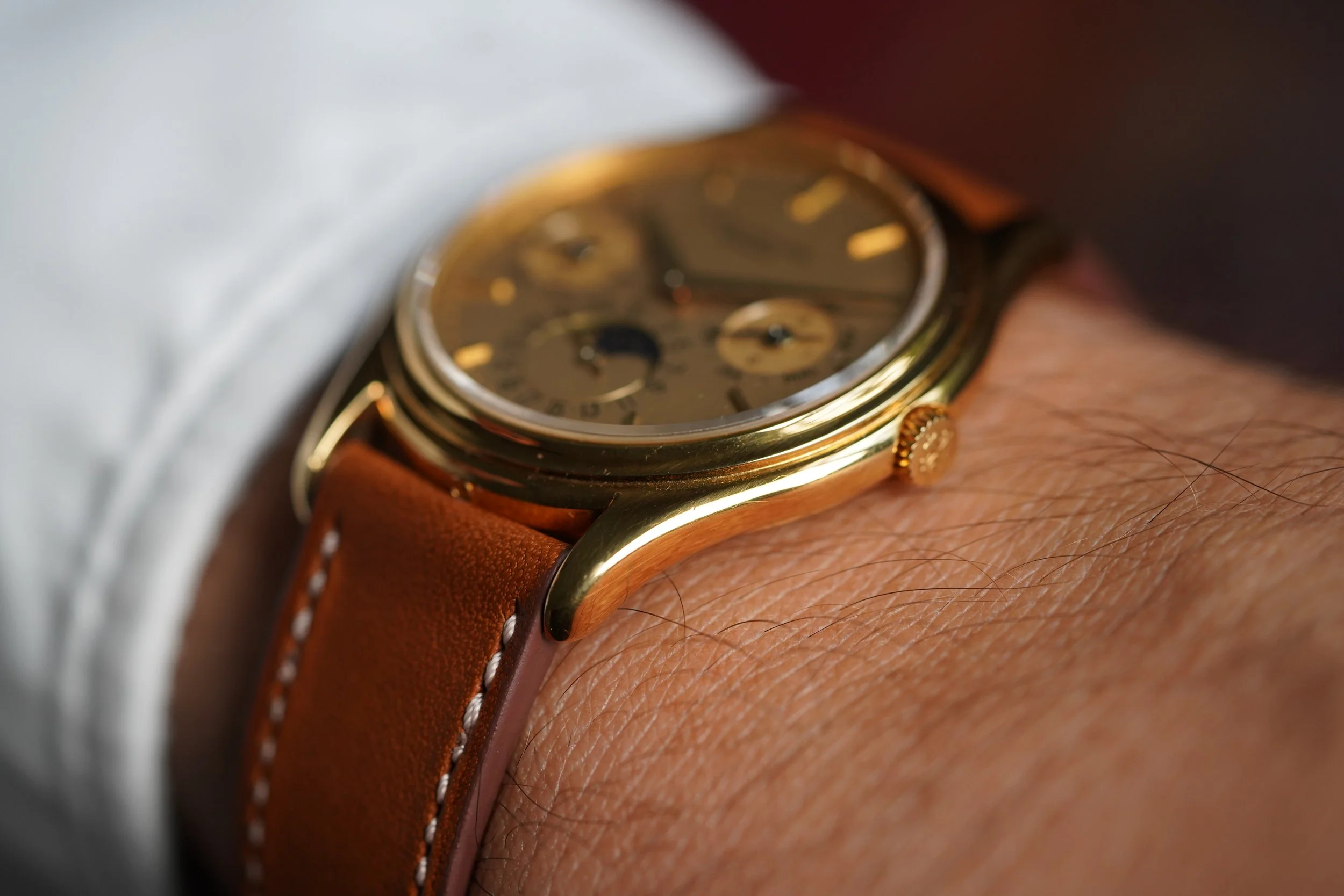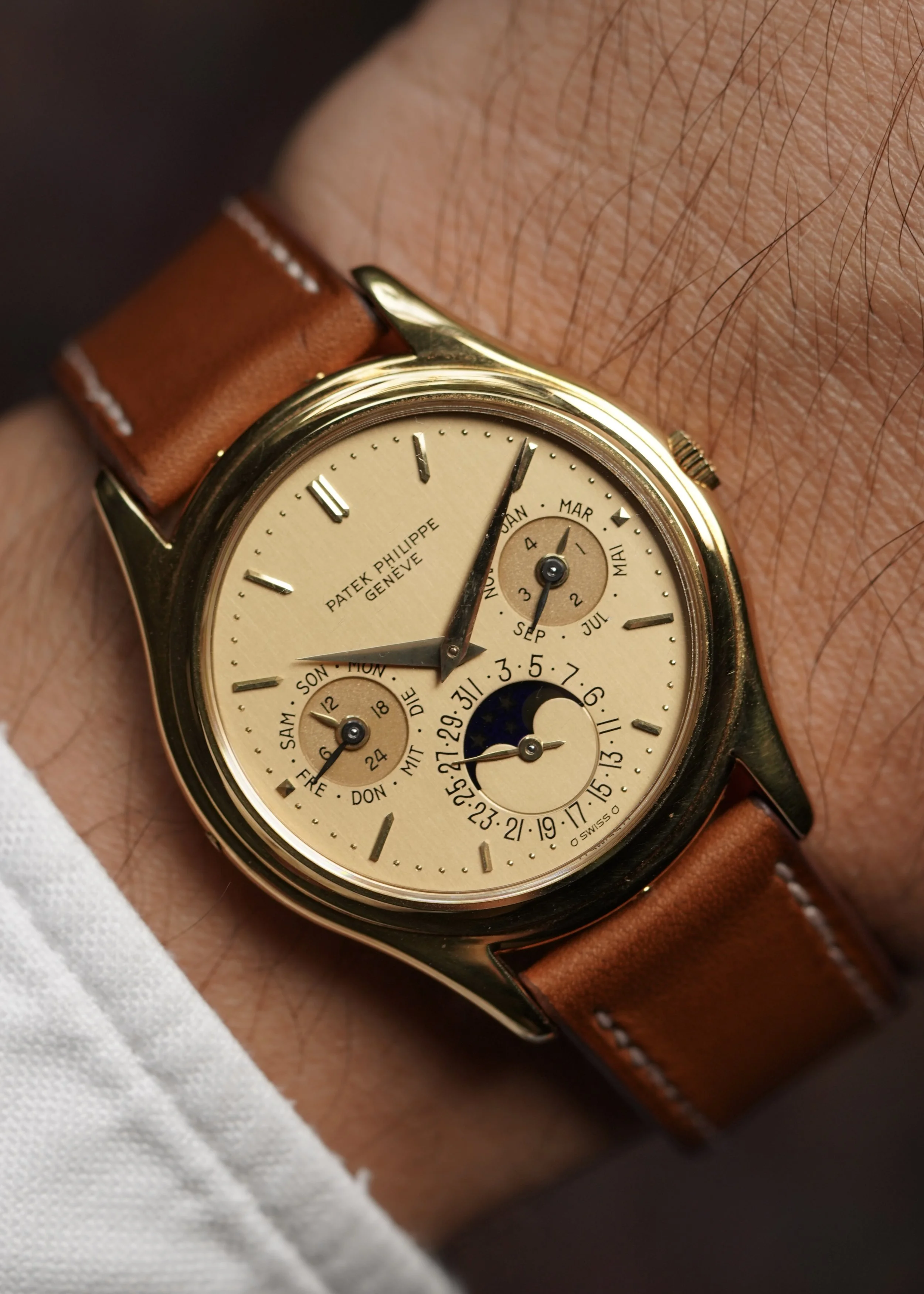 The references 3940 is arguably the most elegant Patek Philippe watches made over the last 40 years. The watch is powered by the self-winding calibre 240Q with microrotor, which when released was the thinnest automatic perpetual calendar movement available. The case is 36mm, and it comes on tan strap. We believe the case remains unpolished. The watch shows little wear and features crisp hallmarks, which is extremely rare for reference 3940s. The dial is a very beautiful "dorè" dial. It is confirmed by the Extract stating “gilded dial”
