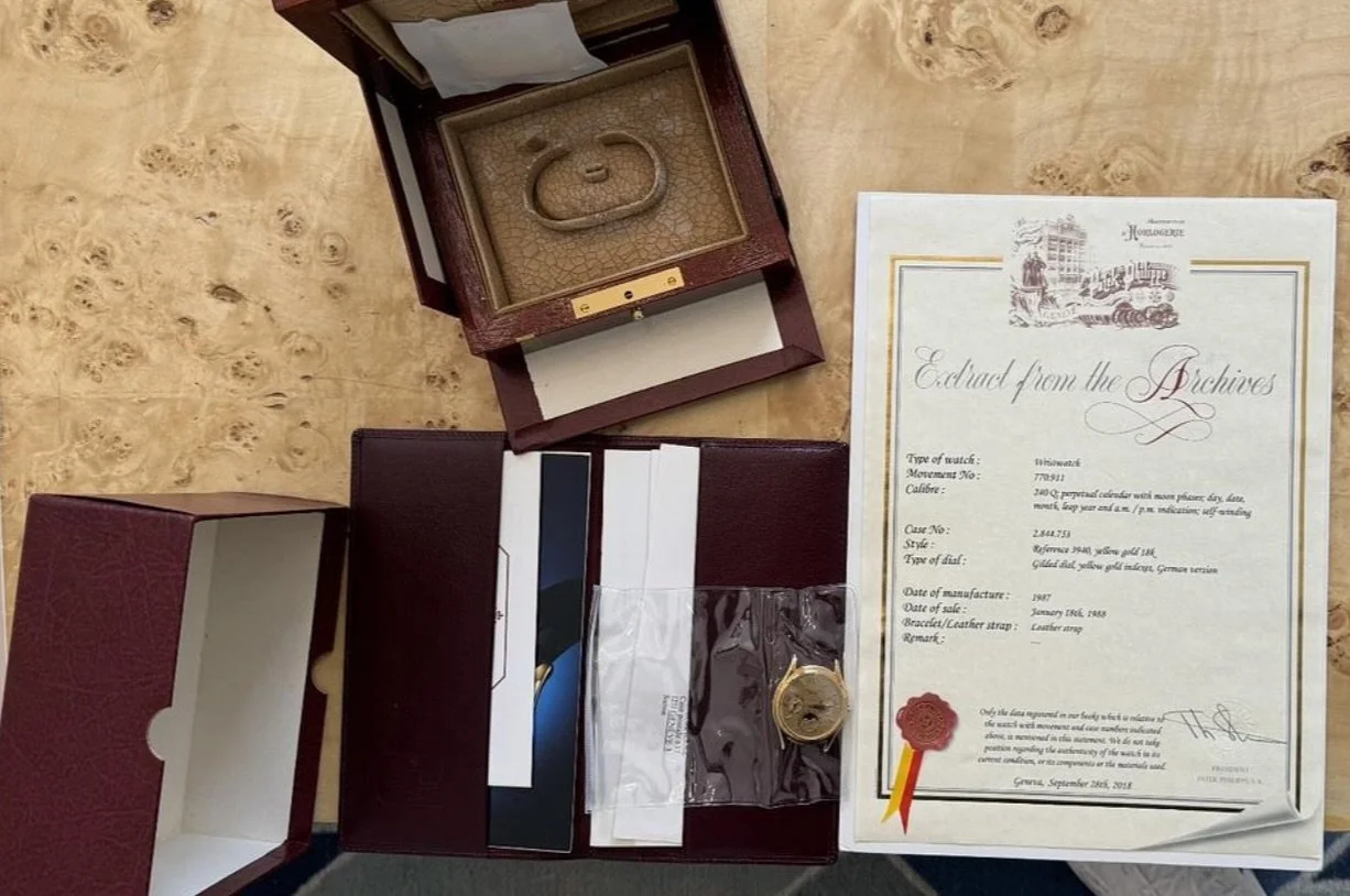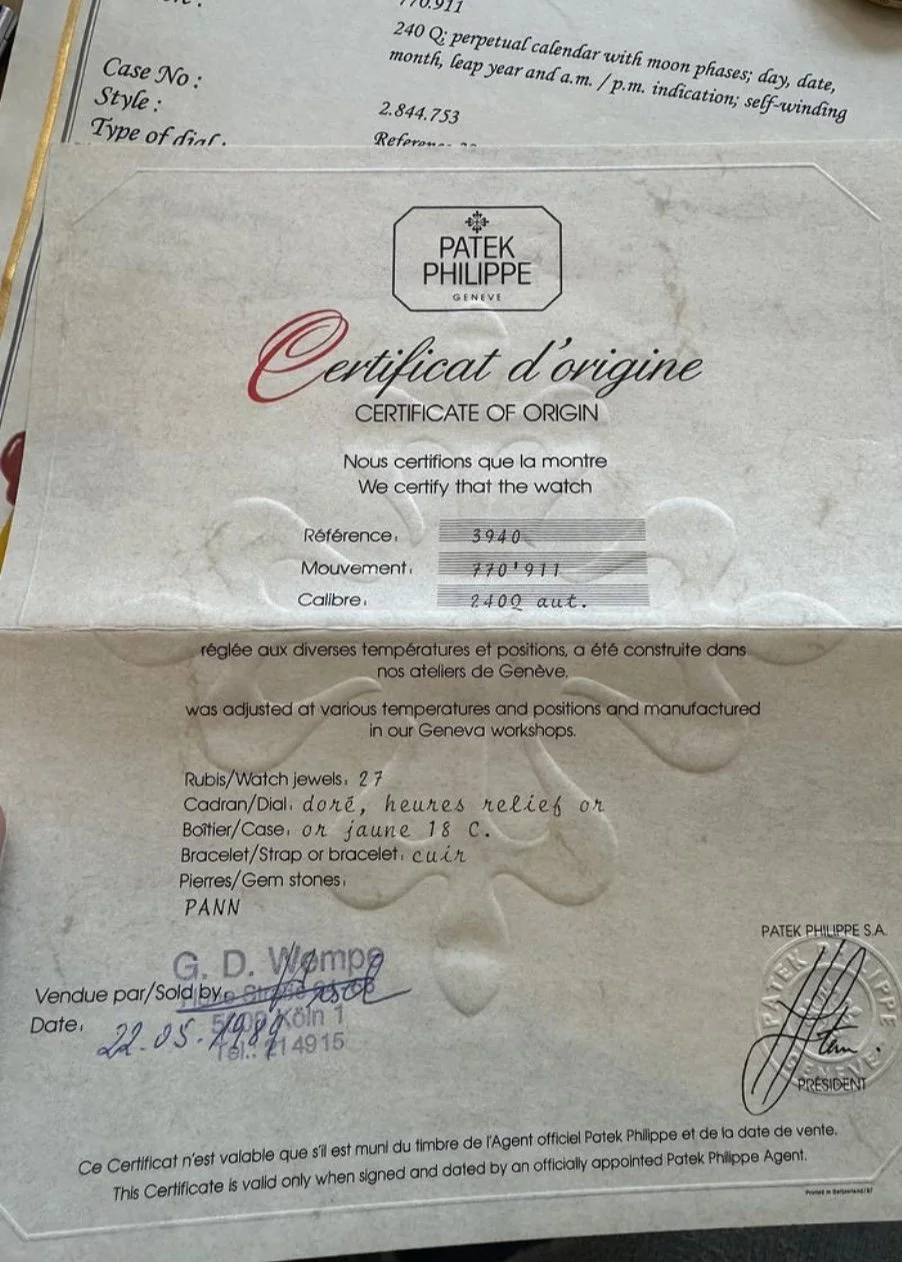 Patek Philippe "Dorè" Dial Reference 3940J Unpolished Full Set Certificate of Origin & Extract