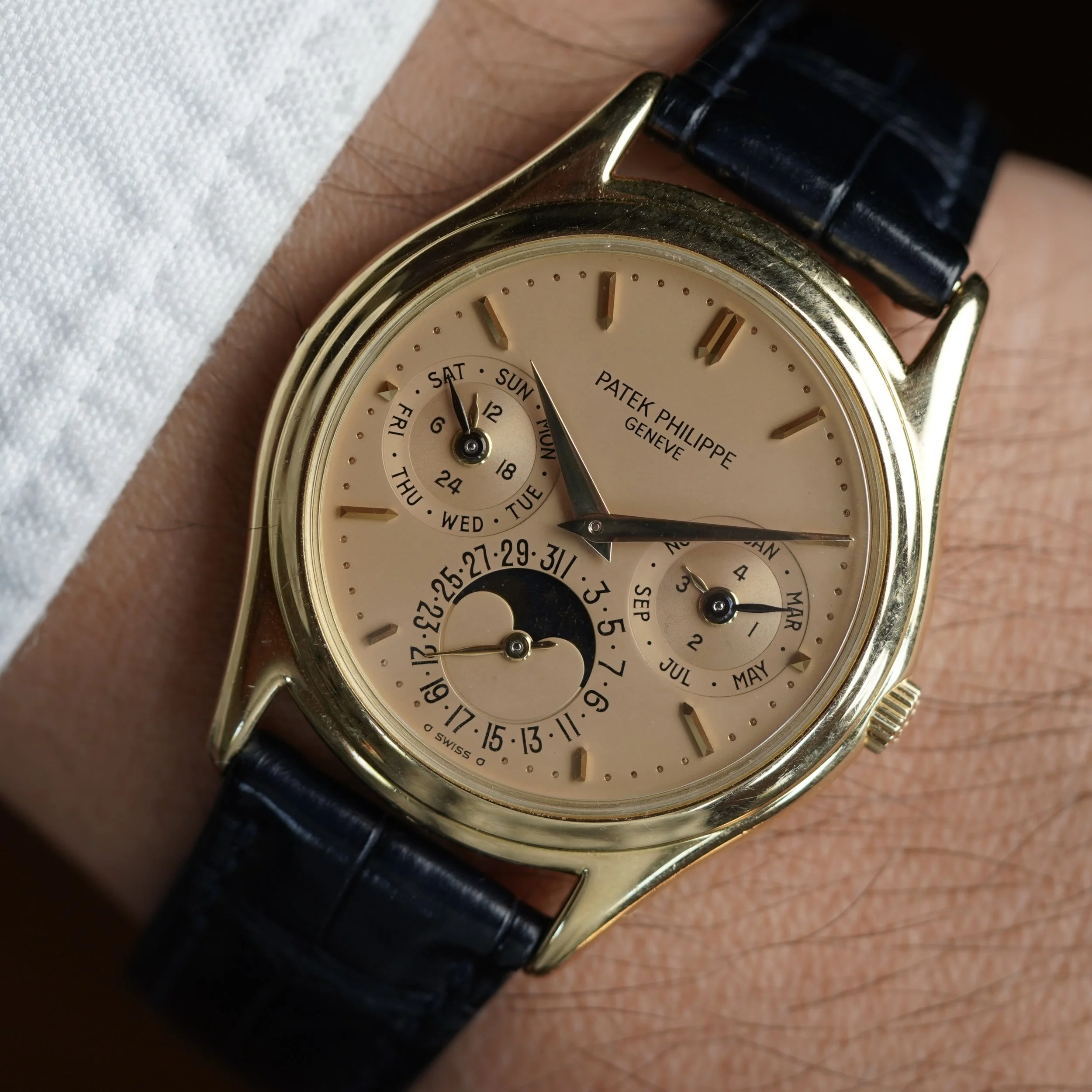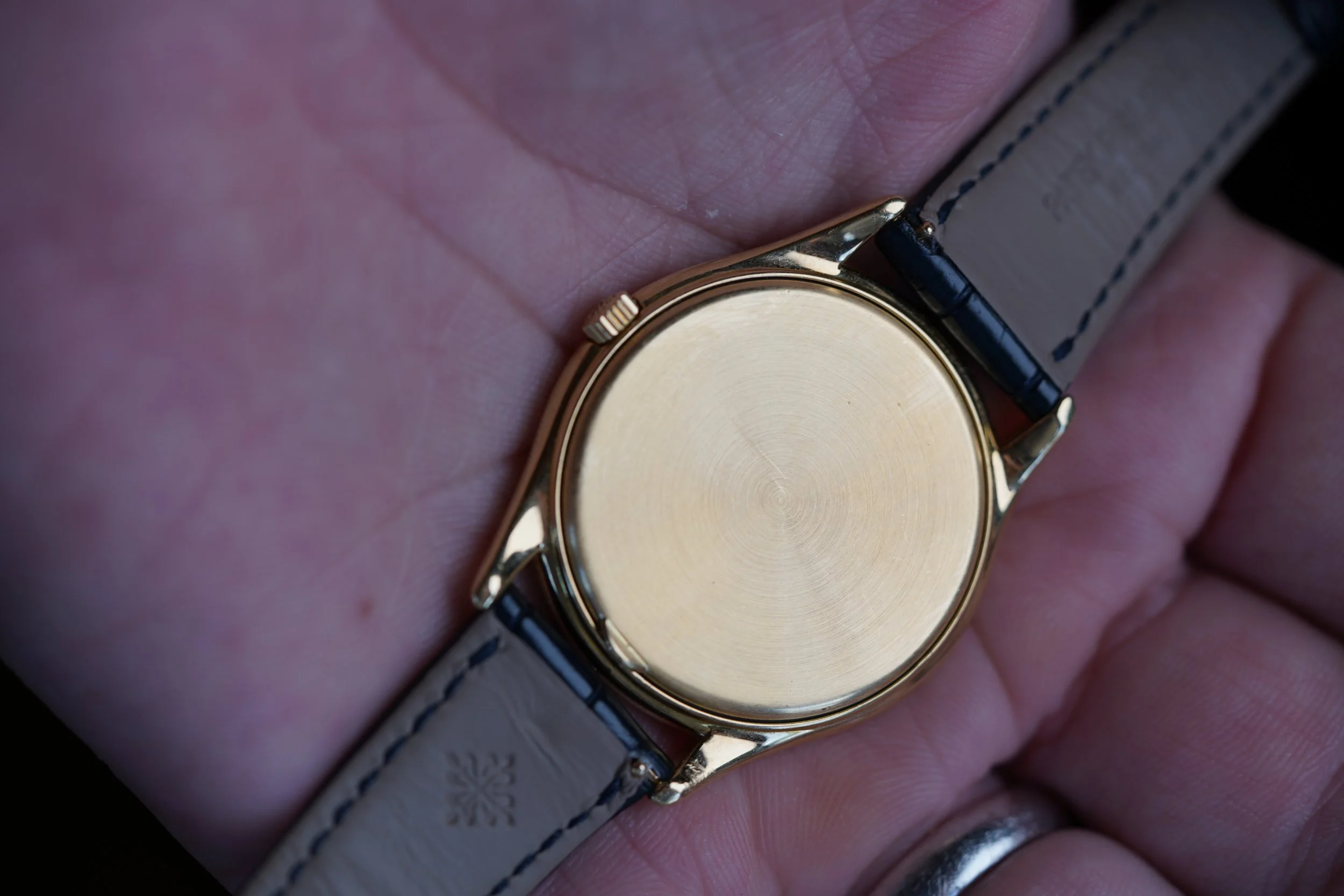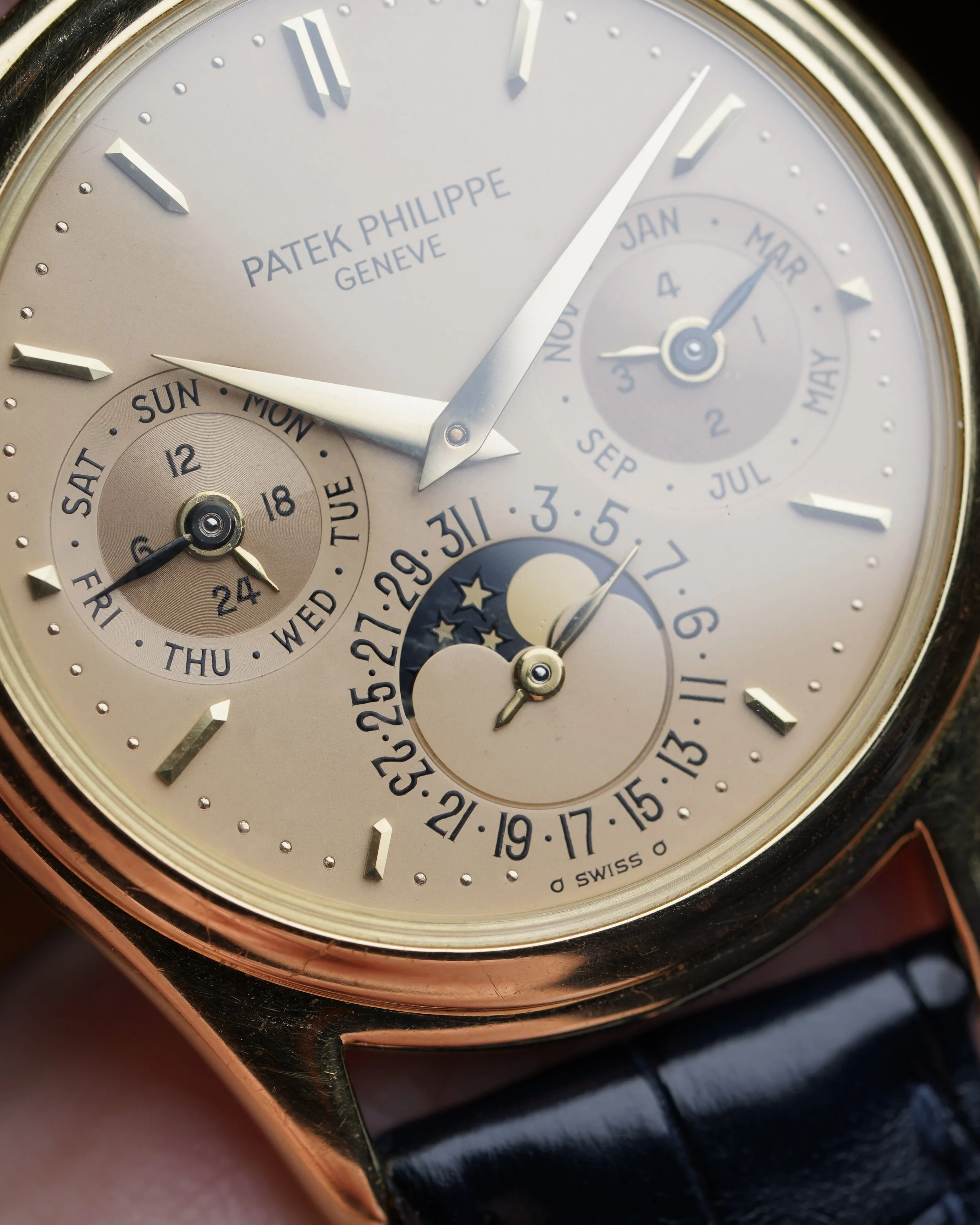 This early example with the early dial featuring the more vintage PATEK PHILIPPE font is probably rarer than those 25 examples with Beyer dials. For some collectors, having the cleaner dial without a retail signature is preferred. These early doré dials are truly sensational and a bit more metallic than later doré dials we have sold, although we would not turn down any of them!