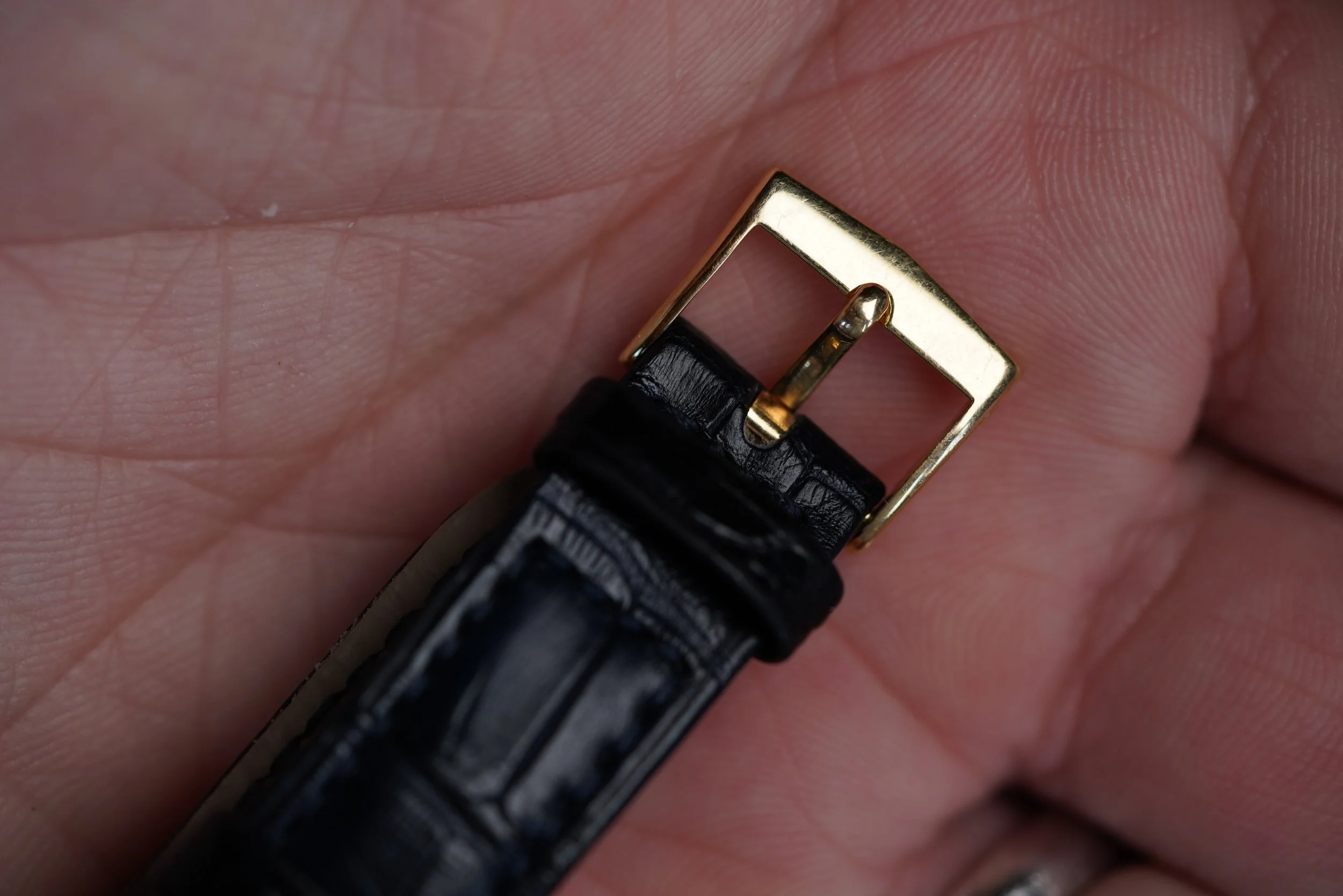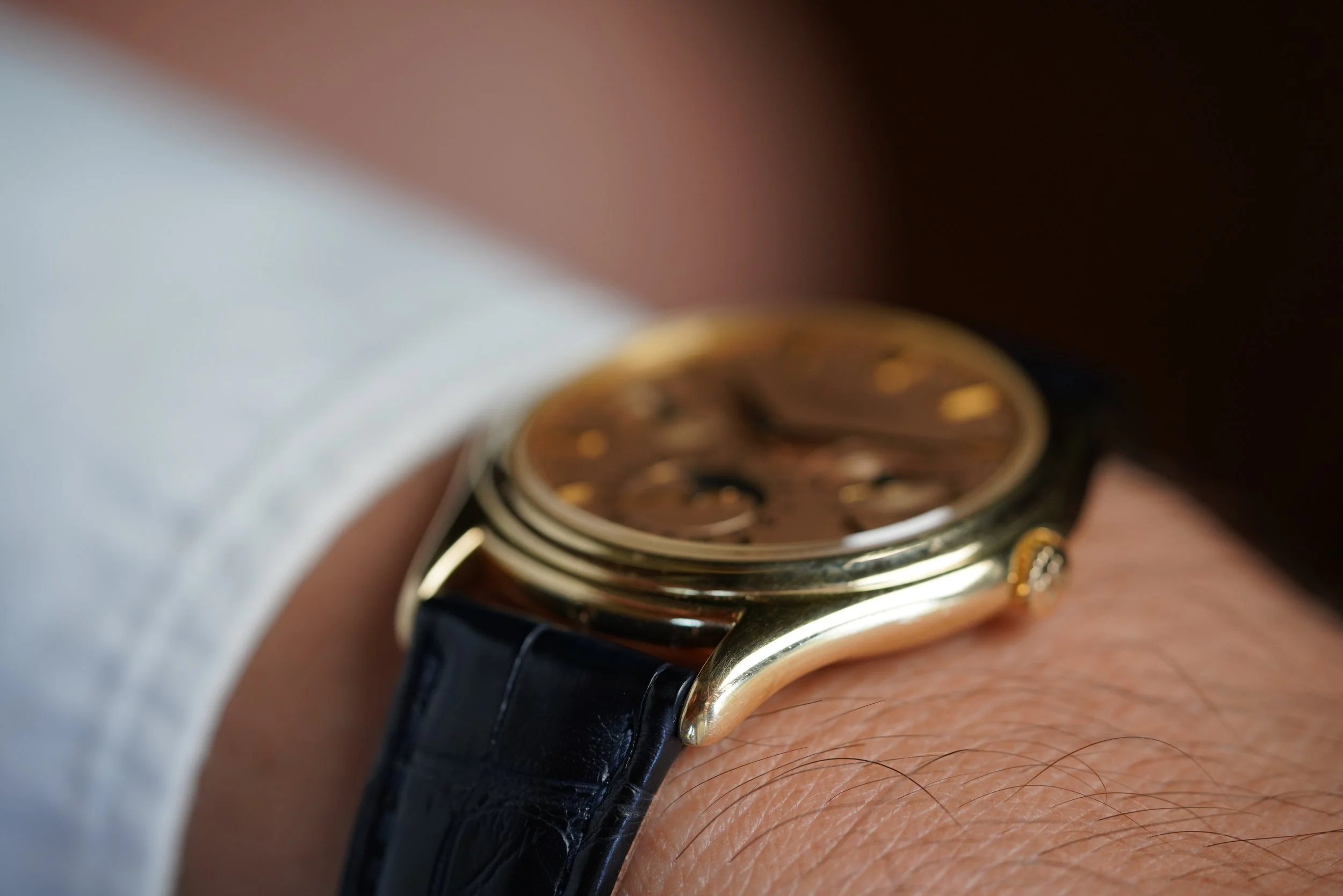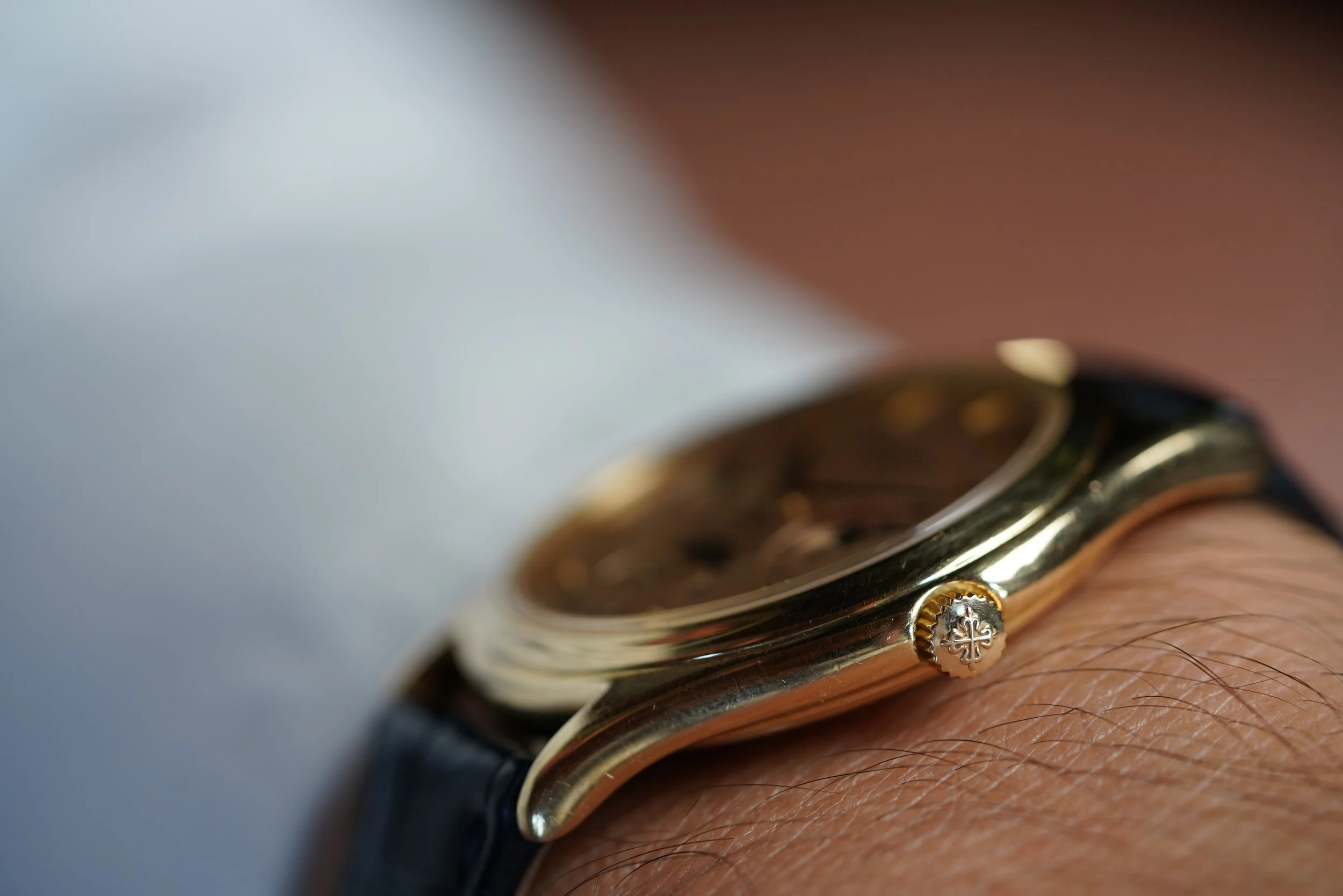 This early example with the early dial featuring the more vintage PATEK PHILIPPE font is probably rarer than those 25 examples with Beyer dials. For some collectors, having the cleaner dial without a retail signature is preferred. These early doré dials are truly sensational and a bit more metallic than later doré dials we have sold, although we would not turn down any of them!
