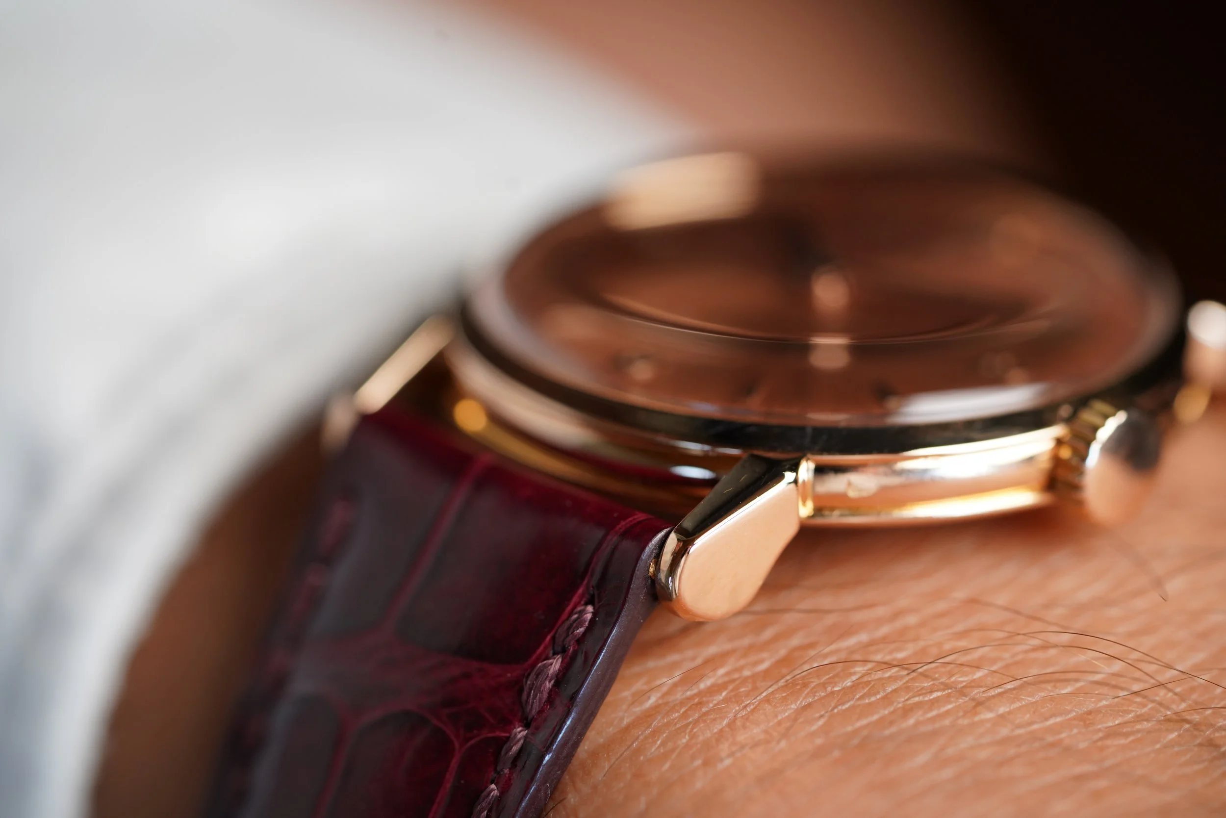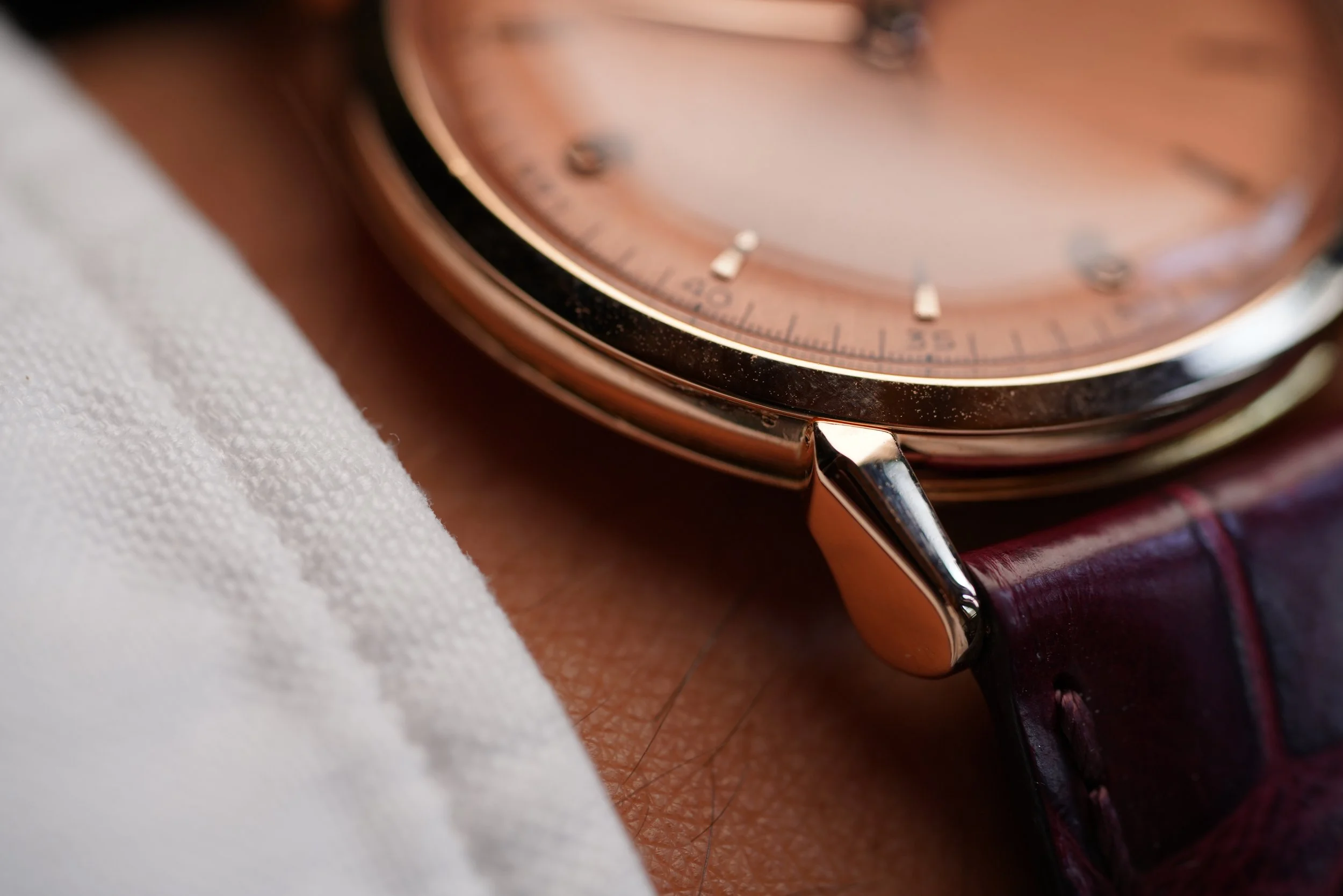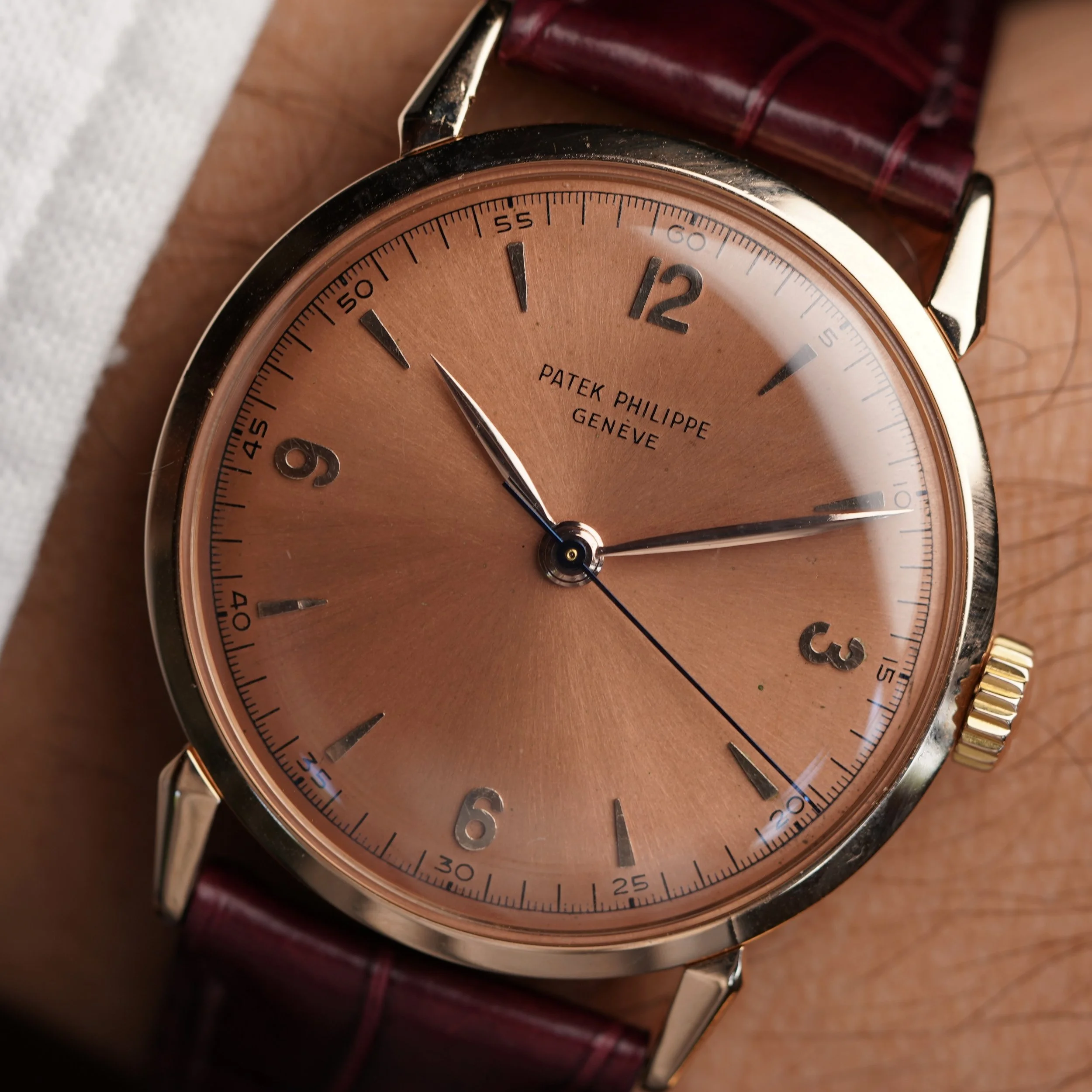 This Patek Philippe reference 1578 an amazing model 18k rose gold. The case measures 35.5mm in diameter (40.5mm lug to lug) and has been lightly polished. The dial features a hard enamel Patek Philippe signature and seconds track and an amazing 3, 6, 9, and 12 applied Arabic numeral layout with central seconds. It appears to be untouched. It also features an incredible pink sunburst finish which is out of this world.