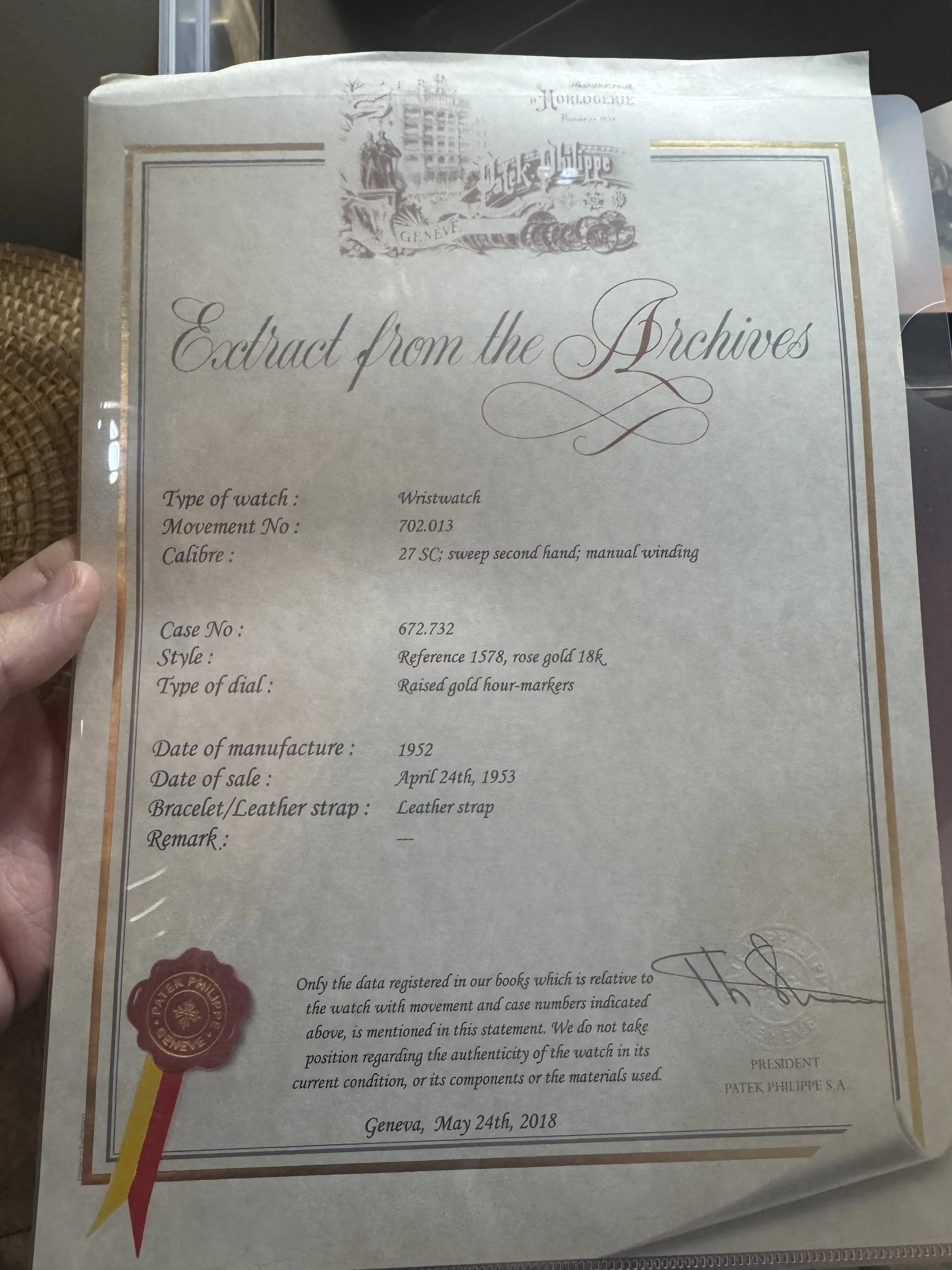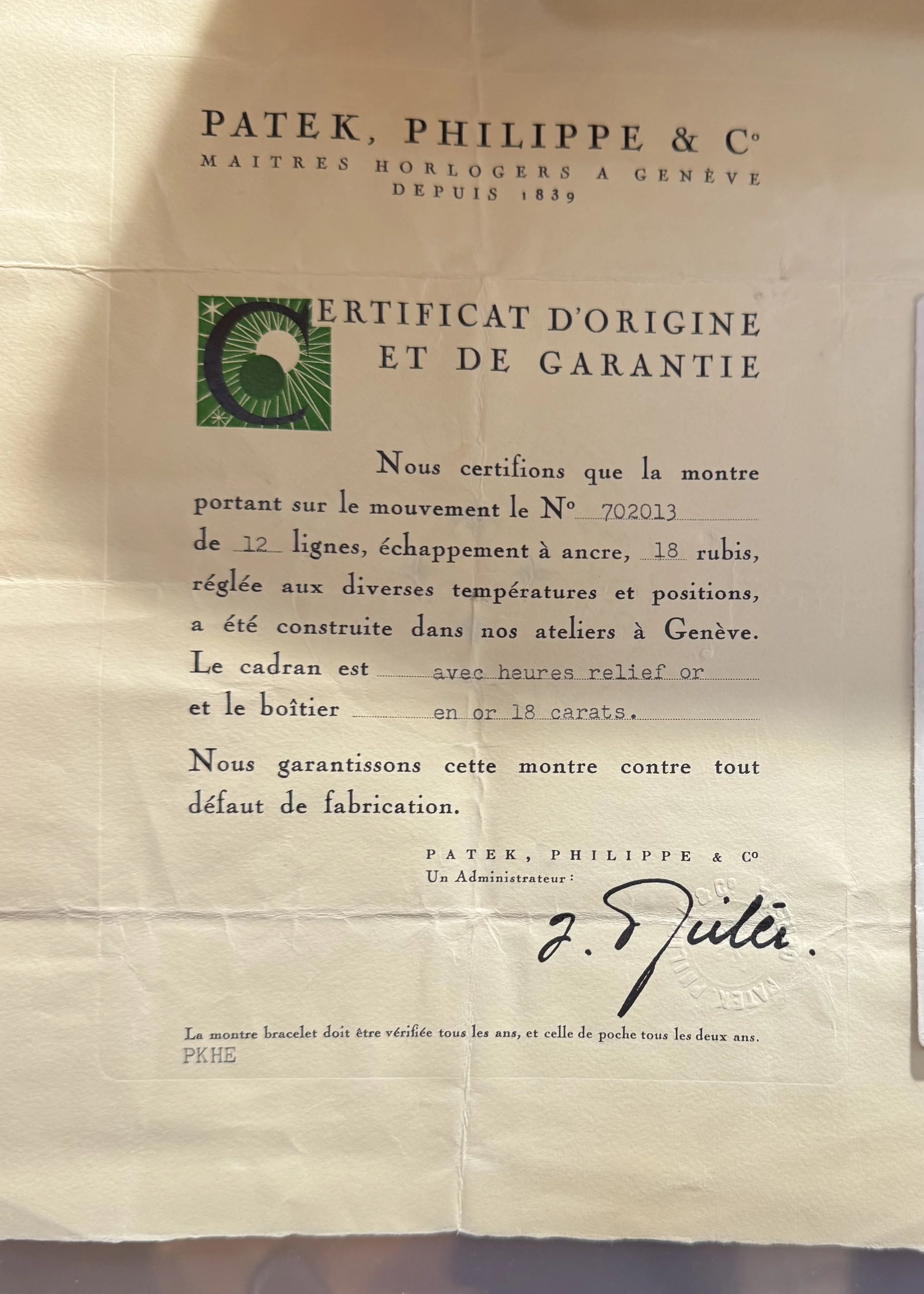 It does not come with box. The timepiece dates to 1952 and was sold in 1953. It does come with the Certificate of Origin & Extract from the Archives! The secret Patek Philippe code PKHE on the Certificate of Origin corresponds to 0453, also reflecting April 1953 as noted on the Extract from the Archives of Patek Philippe. We do not know the service history, but it is running well.