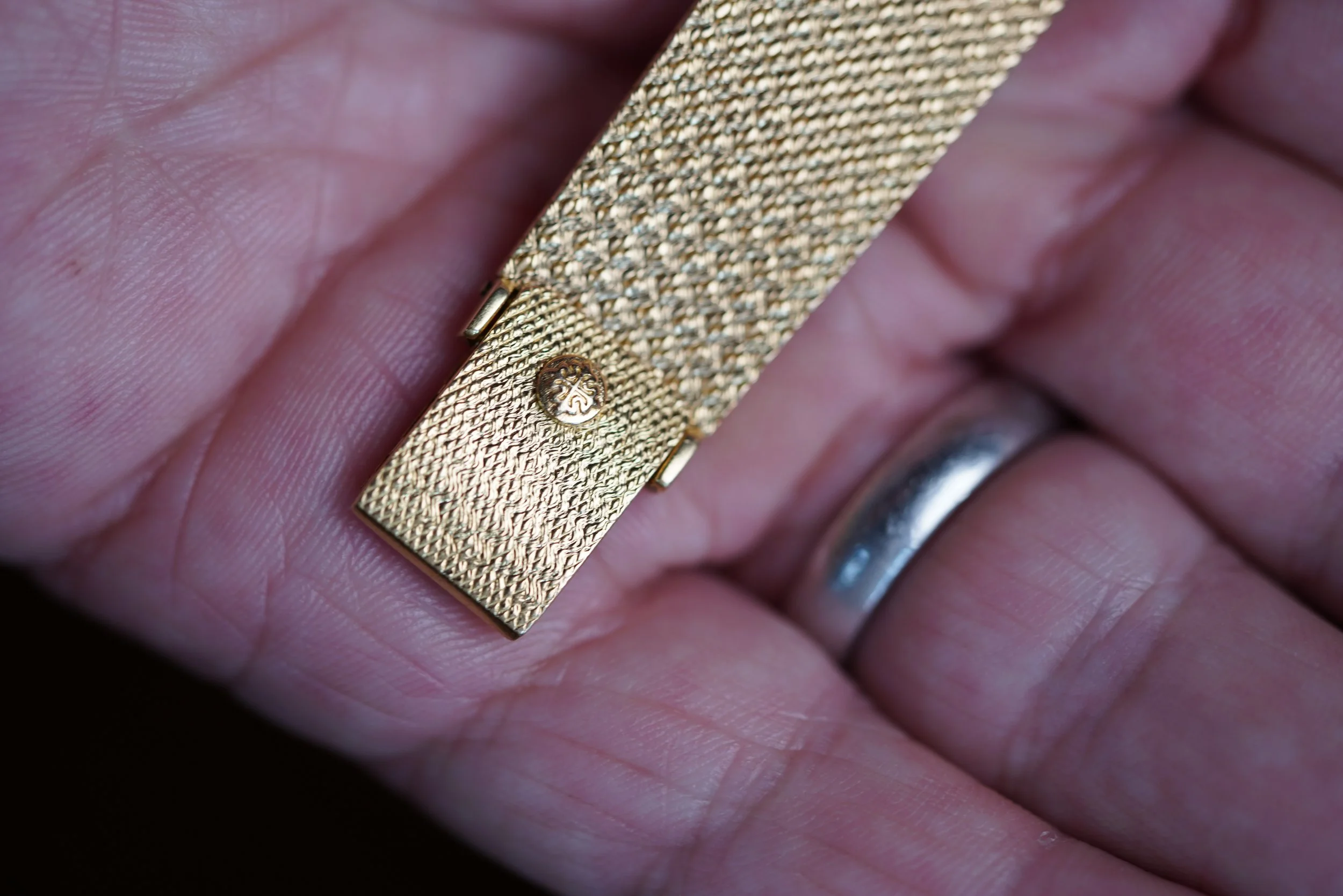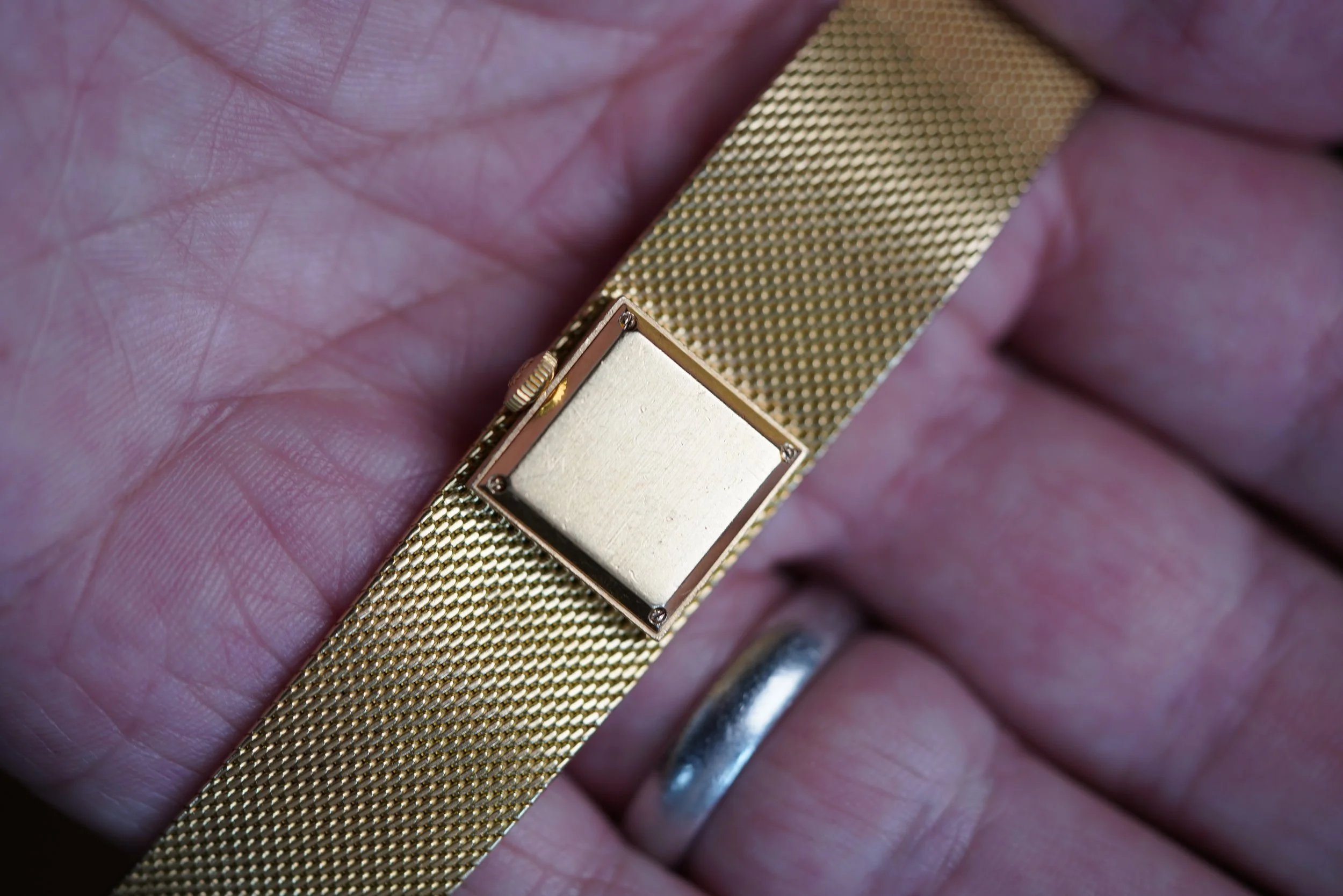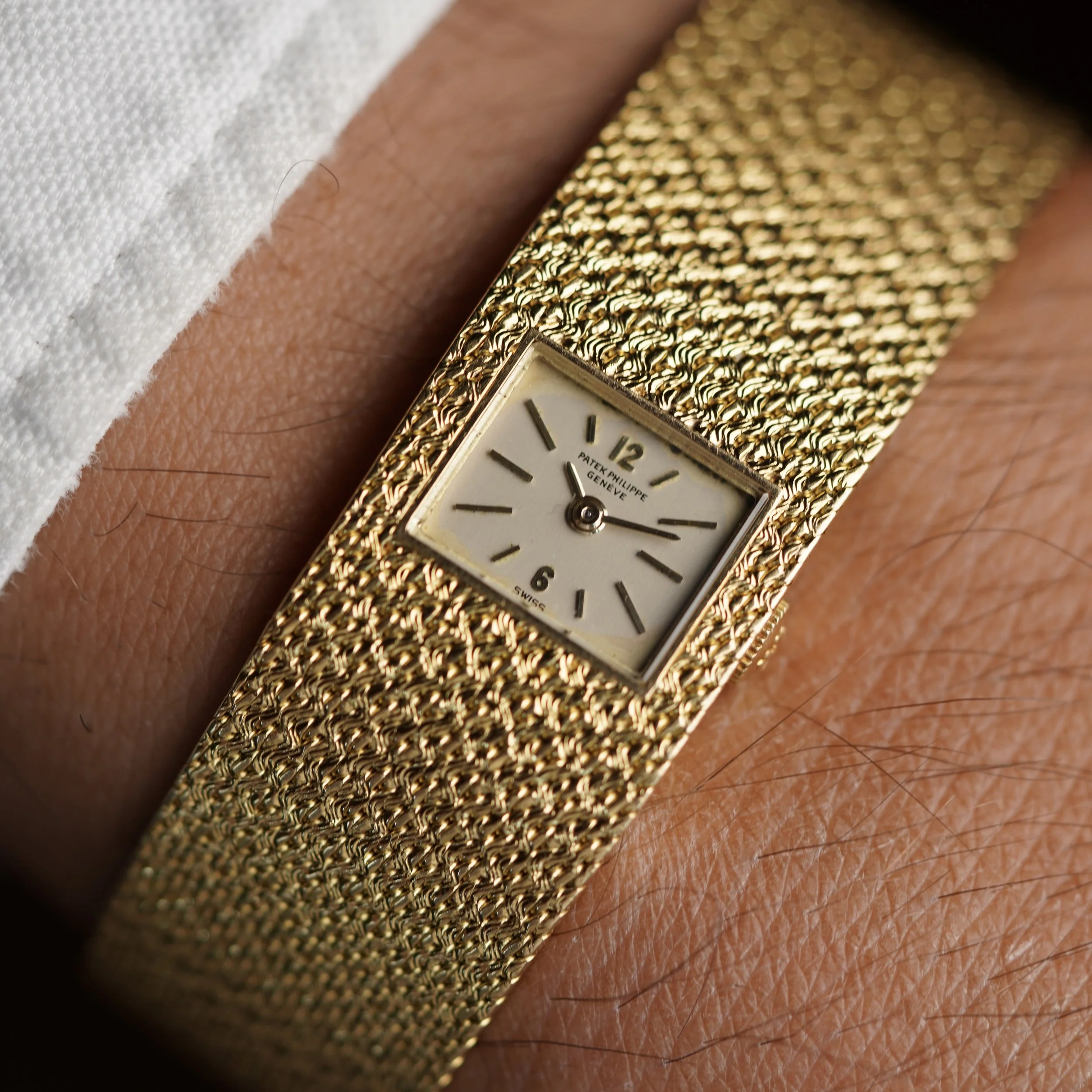 This Patek Philippe in 18k yellow gold is a very elegant ladies’ wristwatch. The watch features a beautiful mesh bracelet that measures just shy of 19mm at the widest point and tapers down to approximately 15mm near the clasp. The bracelet also features intricate finishing that plays with the light. It is a manual winding watch. It appears to be unpolished. It will fit a wrist approximately 6 inches in circumference.