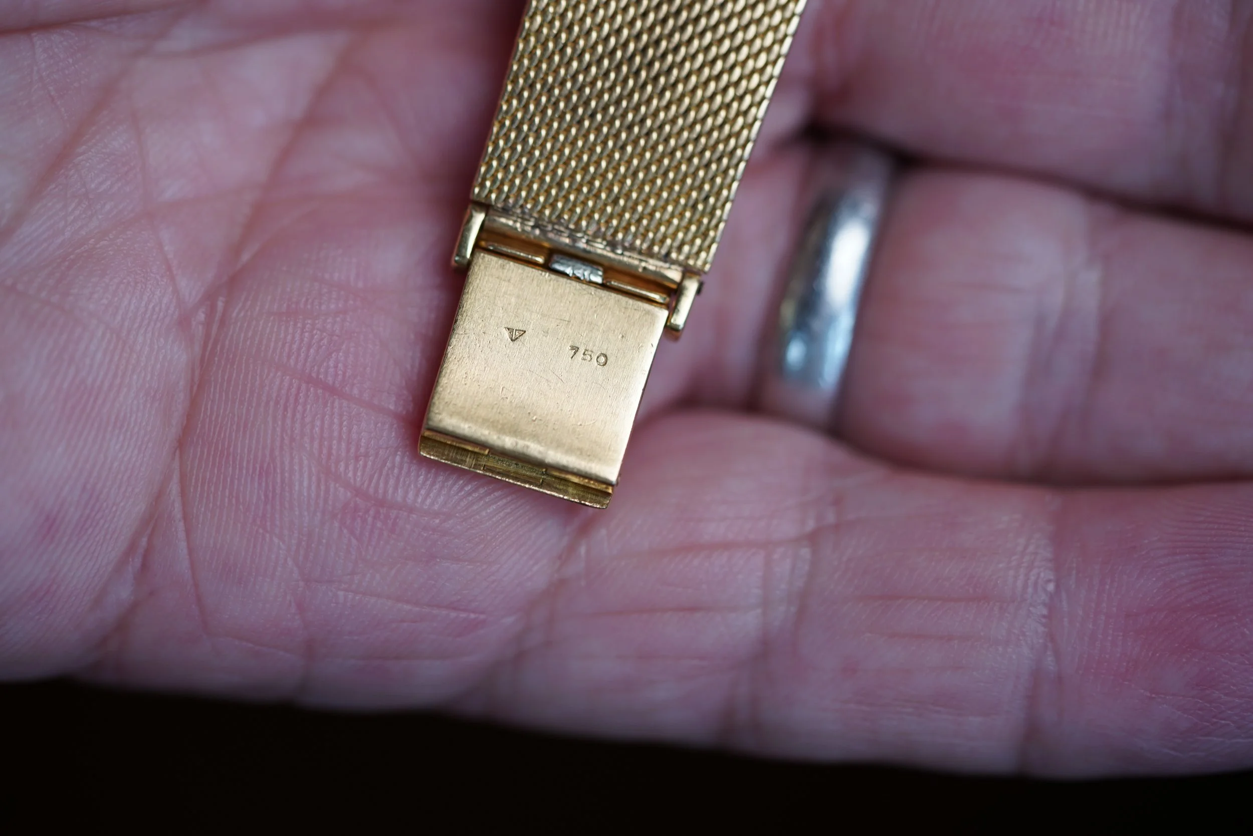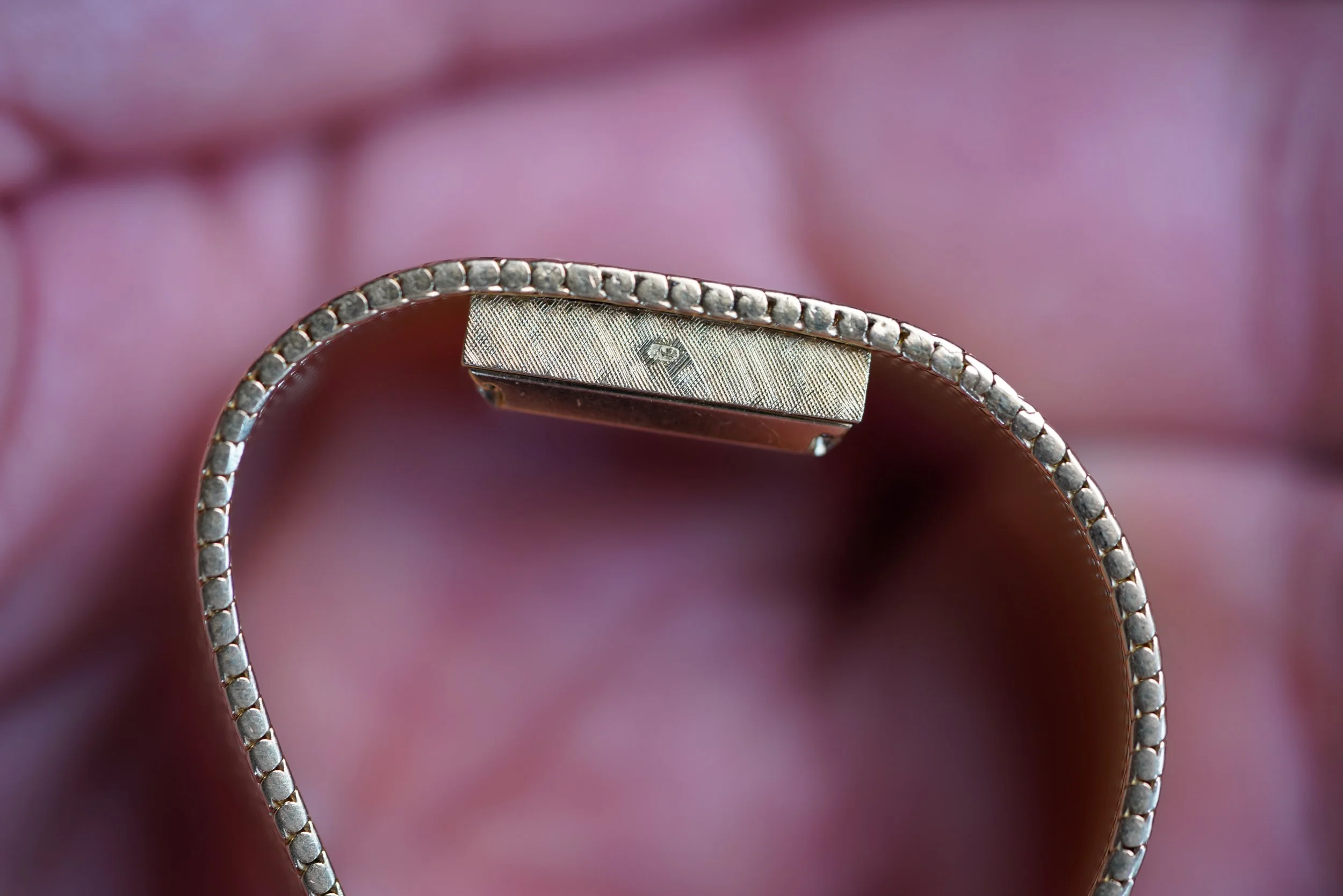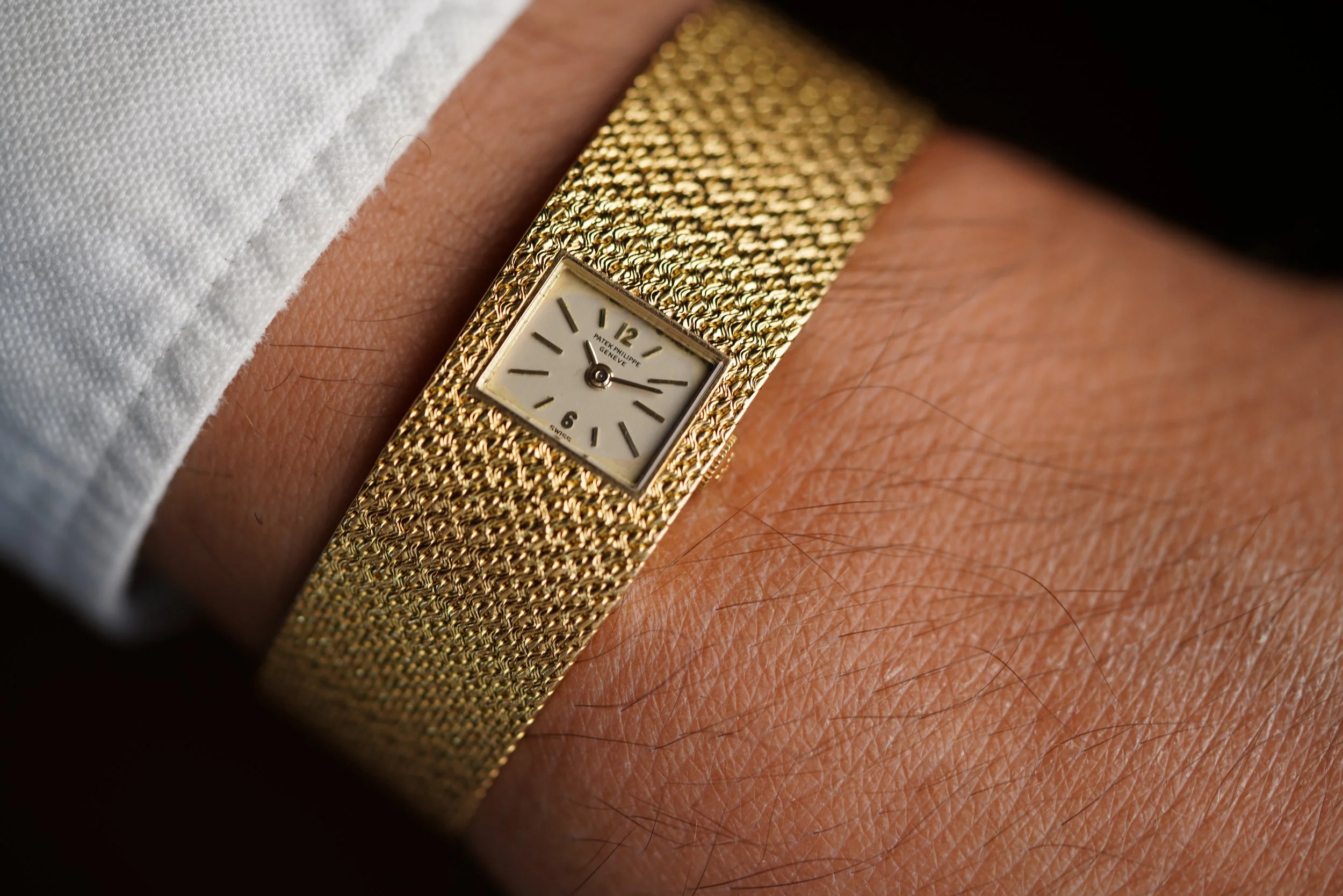 This Patek Philippe in 18k yellow gold is a very elegant ladies’ wristwatch. The watch features a beautiful mesh bracelet that measures just shy of 19mm at the widest point and tapers down to approximately 15mm near the clasp. The bracelet also features intricate finishing that plays with the light. It is a manual winding watch. It appears to be unpolished. It will fit a wrist approximately 6 inches in circumference.