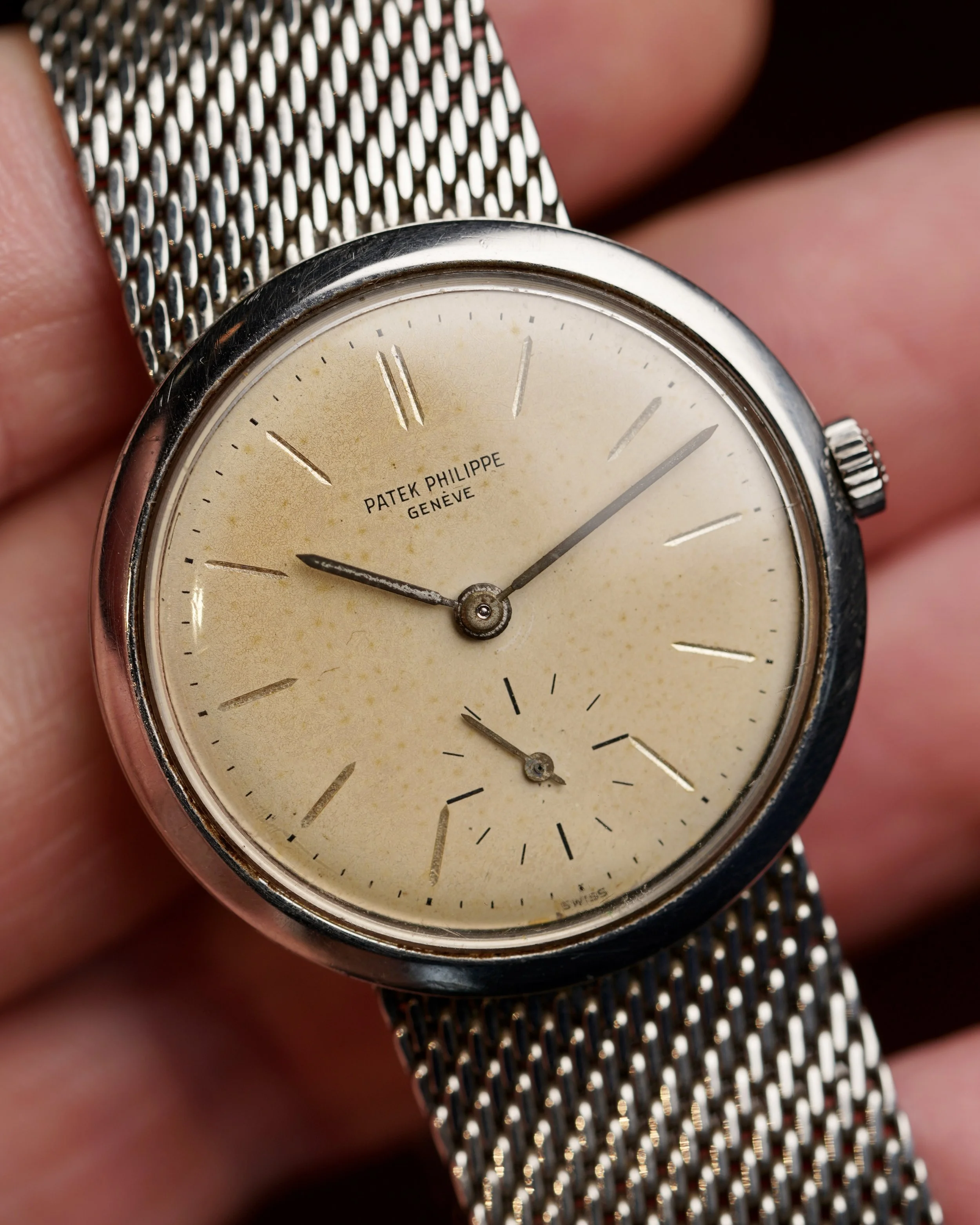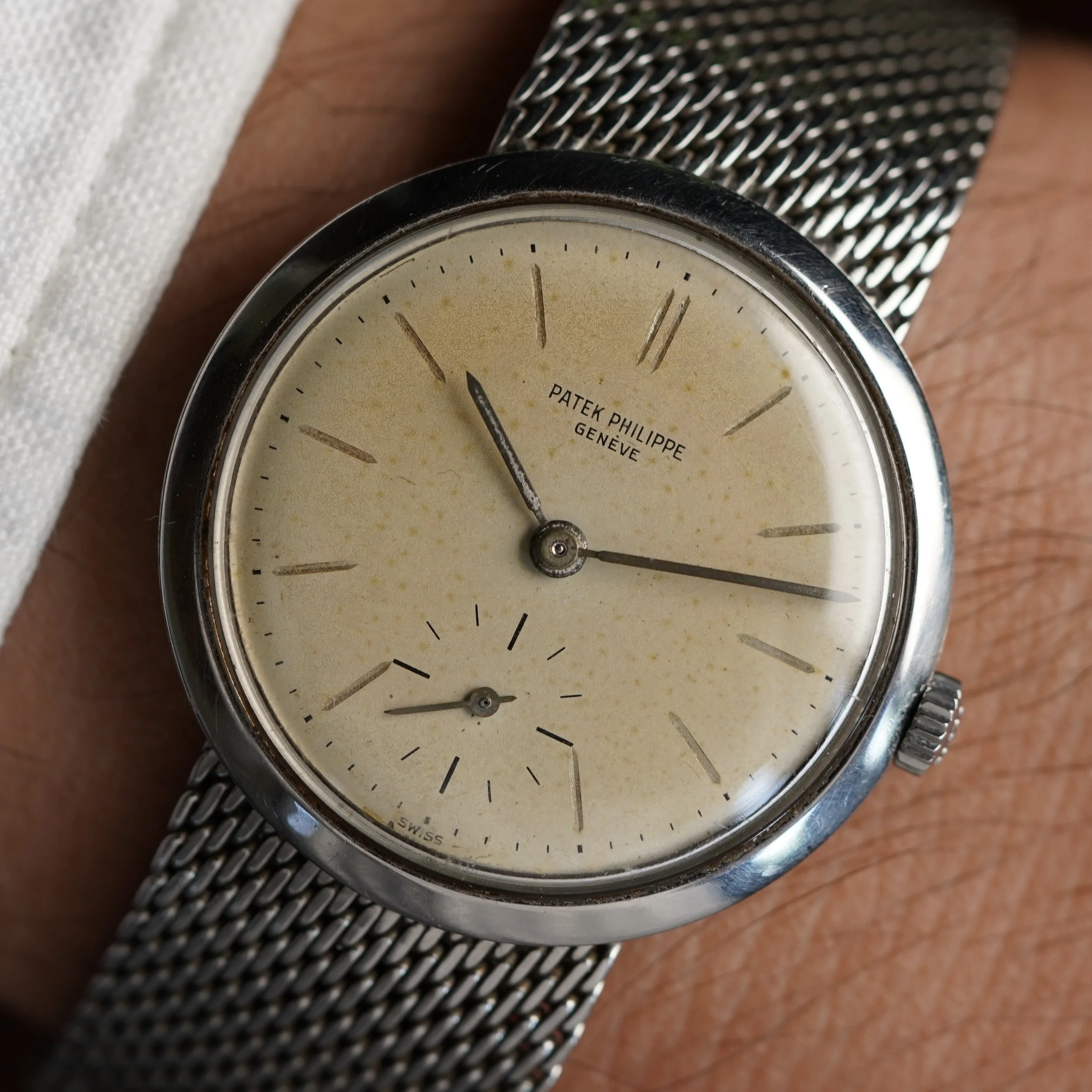 This Patek Philippe reference 3418 is a very cool and uncomon timepiece in stainless steel and was initially launched in 1958. It features a “convertible case” that allows for additional lugs to be swapped for the Milanese belt-buckle integrated bracelet. It features the original Unroc bracelet by Cornu & Cie. The watch features a silver dial with patina and a subsidiary seconds dial. The case measures approximately 34.5mm in diameter. It has been lightly polished.