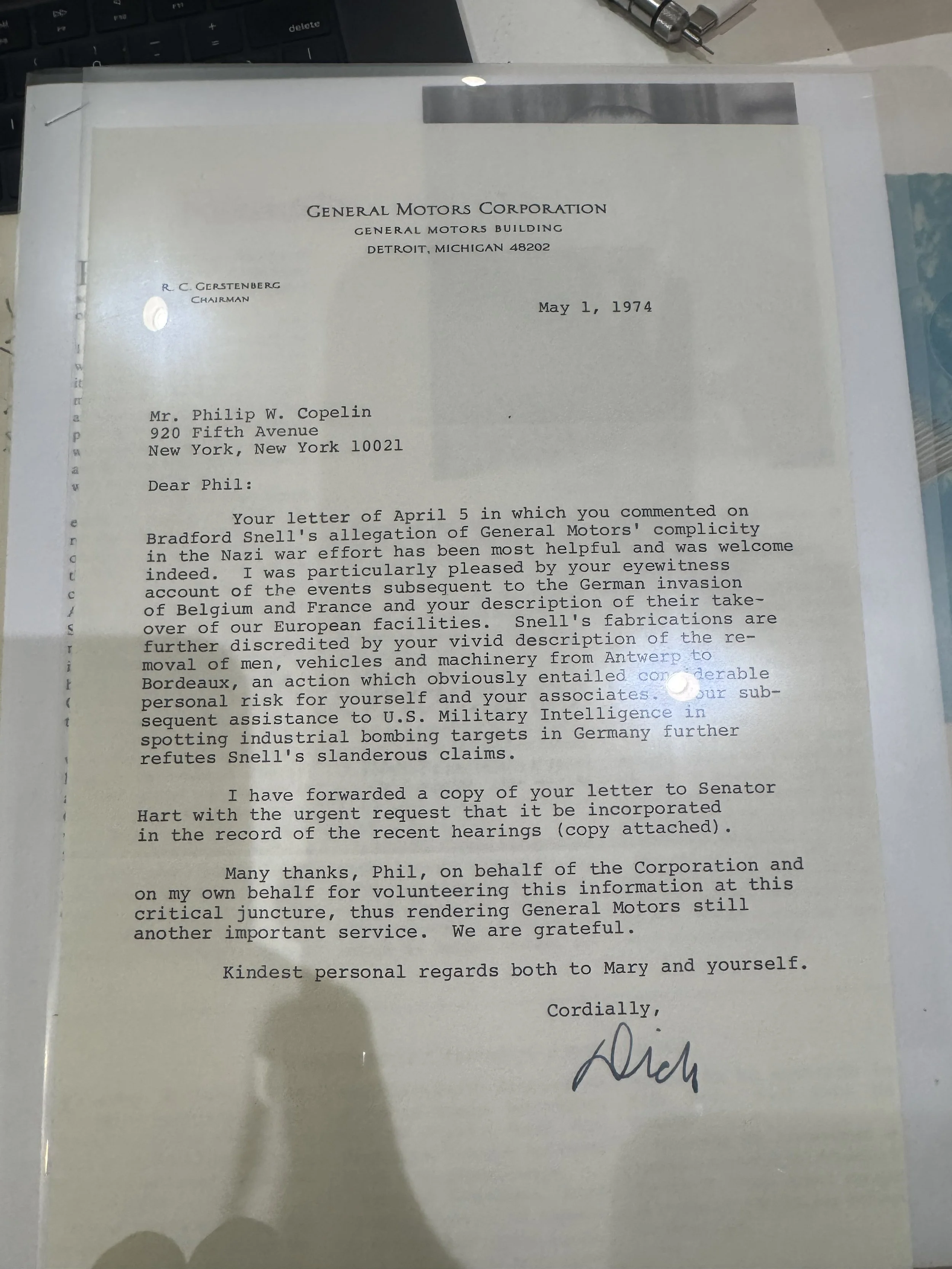 It also comes with many terrific and rare materials, including photographs of the original owner with President Nixon, various letters with the GM Chairman and other documents, including a copy of the virtually never seen Henri Stern Watch Agency yellow card from New York reflecting when it was first ordered from Patek Philippe by GM. The original owner, Philip W. Copelin, is also featured in Maurice Platt’s great book ‘An Addiction to Automobiles: The occupational autobiography of an engineer and journalist’, a copy of which is also included.