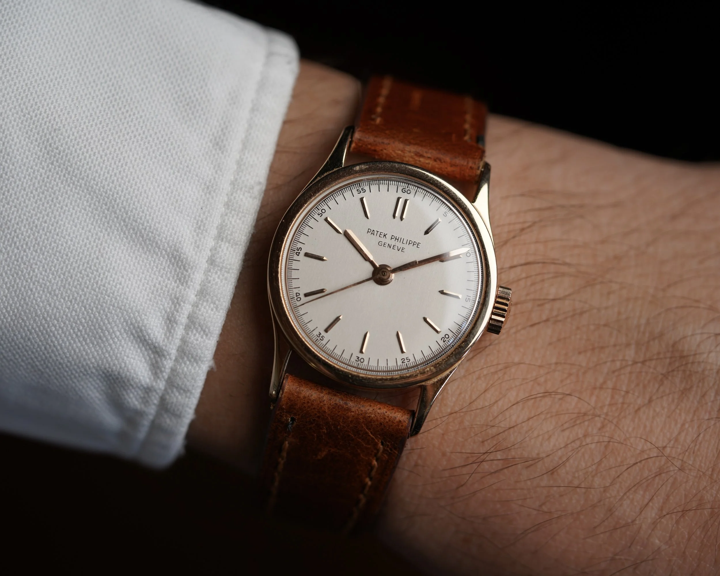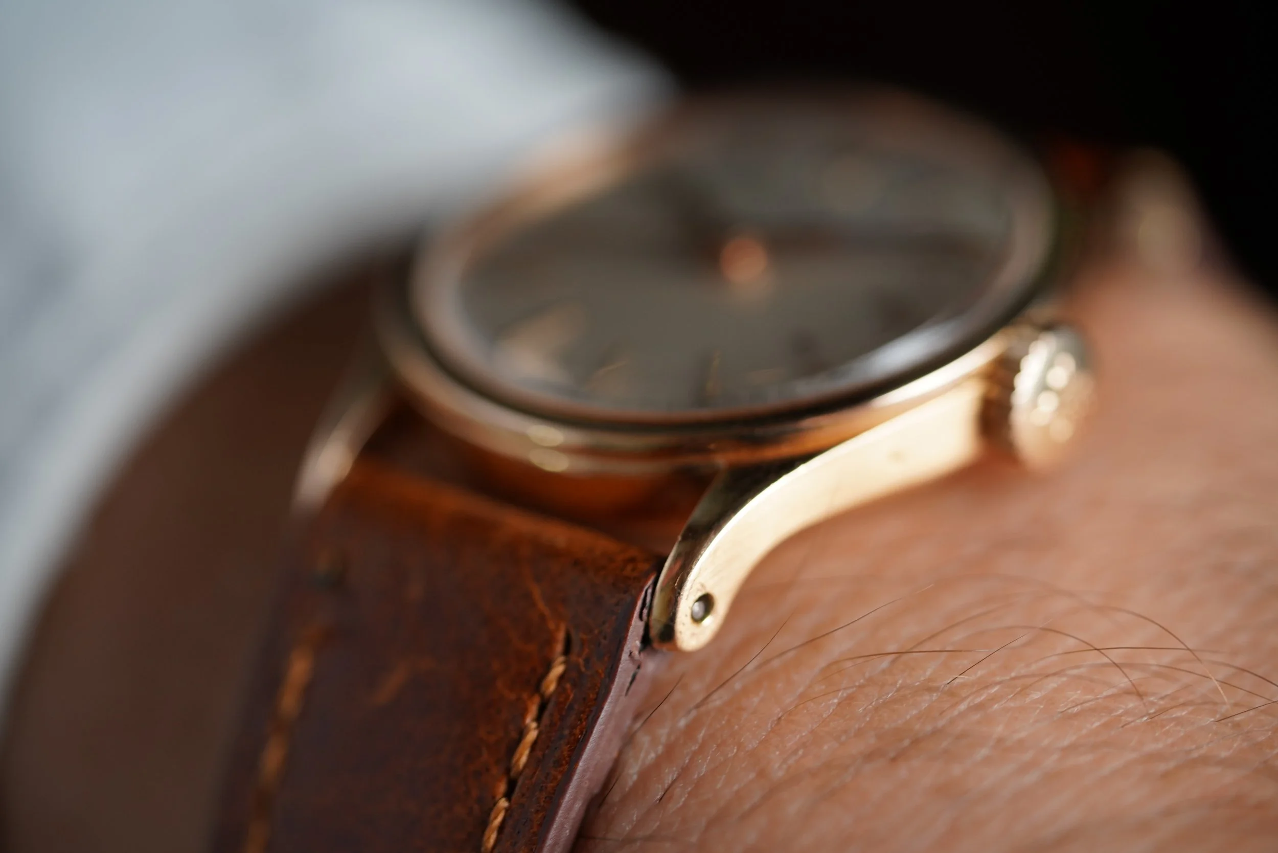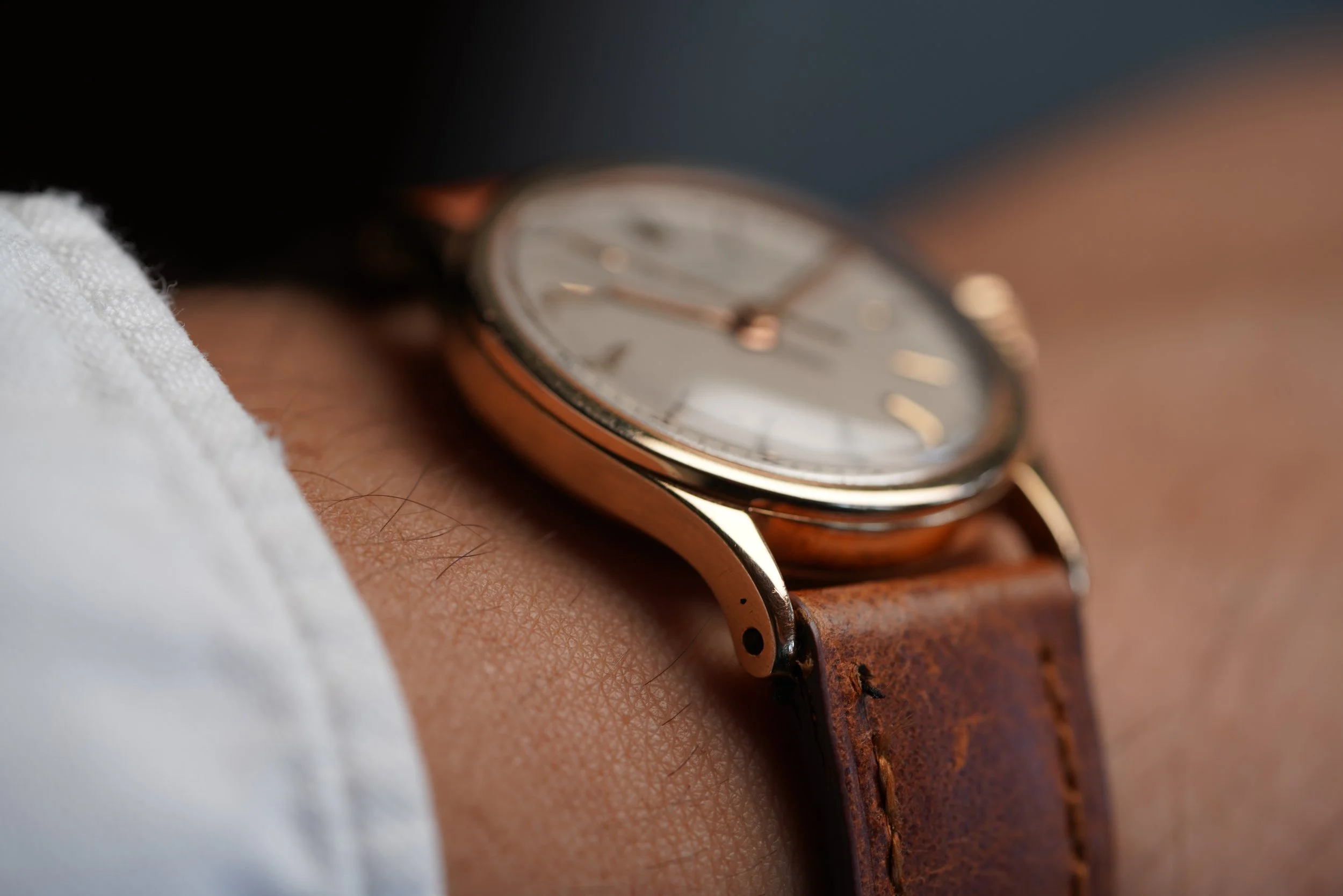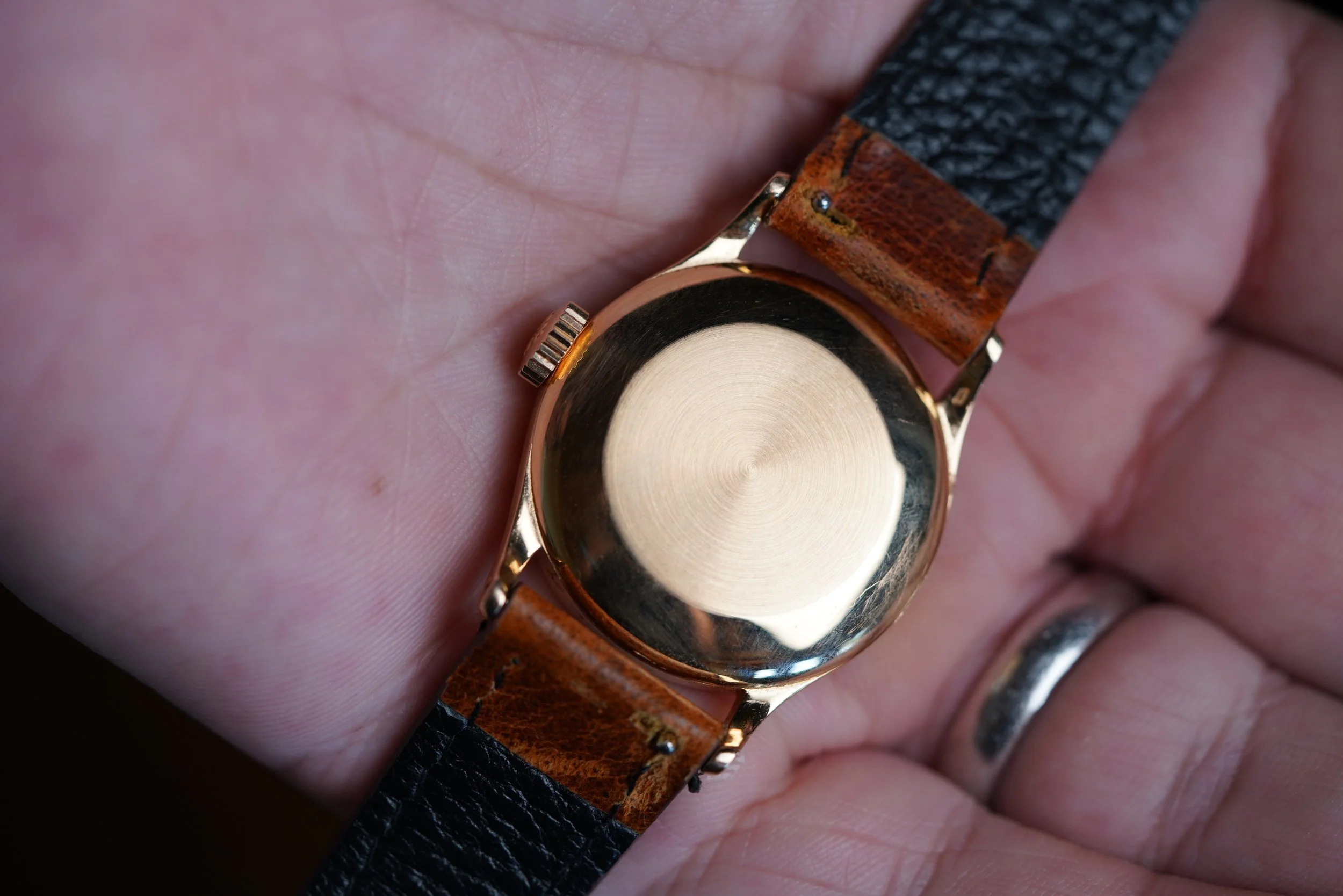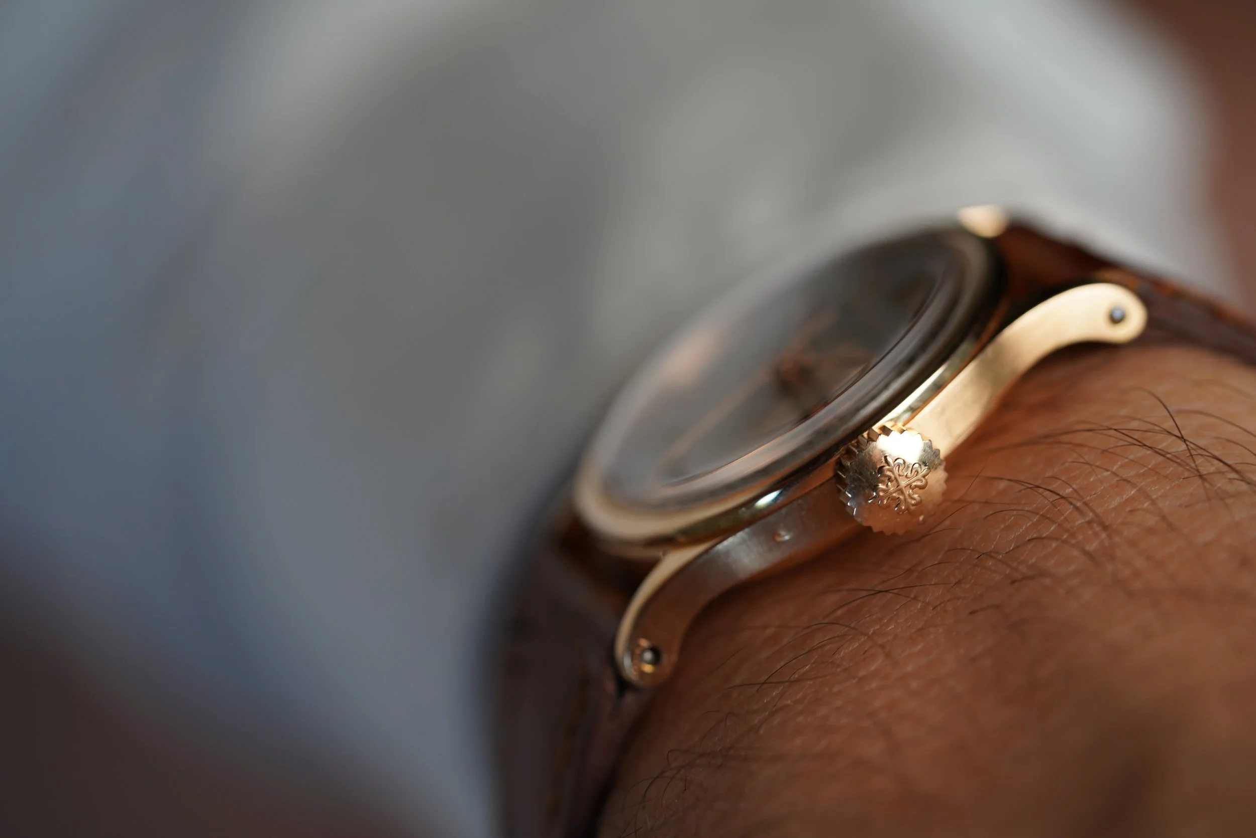 This is a very attractive Patek Philippe reference 2457. The reference 2457 is a successor to the reference 96. This example is made of 18K rose gold. This metal is quite rare for the model. The case has been lightly polished. It measures 31mm in diameter and 39mm lug to lug. It is powered by the calibre 27 SC. The watch dates to 1950.
