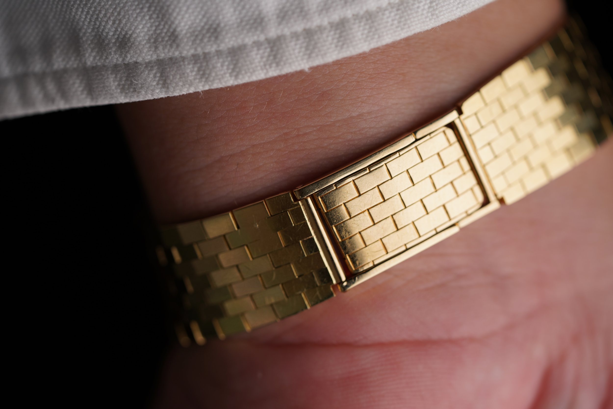 It is paired on a very beautiful 18k yellow gold brick bracelet..