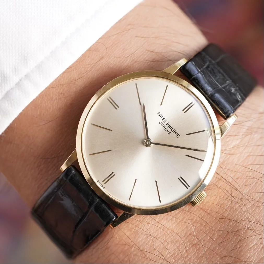 This Patek Philippe Reference 3468 is a very elegant dress watch dating to circa 1970. It is the perfect thin and elegant watch for black-tie events as it does not have a seconds hand. It is paired on its original Patek Philippe alligator strap and the watch is in “like new” condition. The case measures approximately 33mm in diameter, but wears larger. It was just serviced as it sat for so many decades unworn.