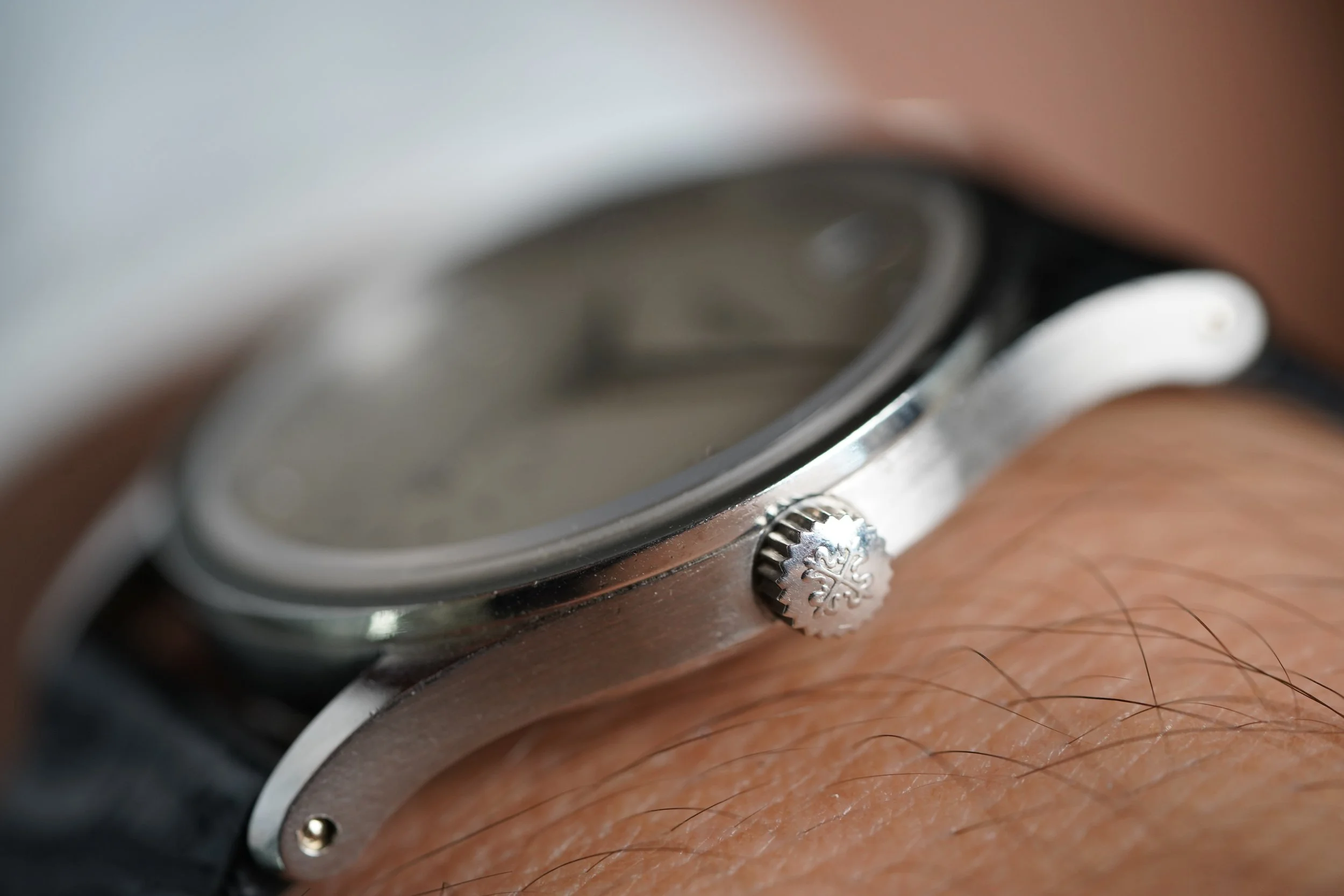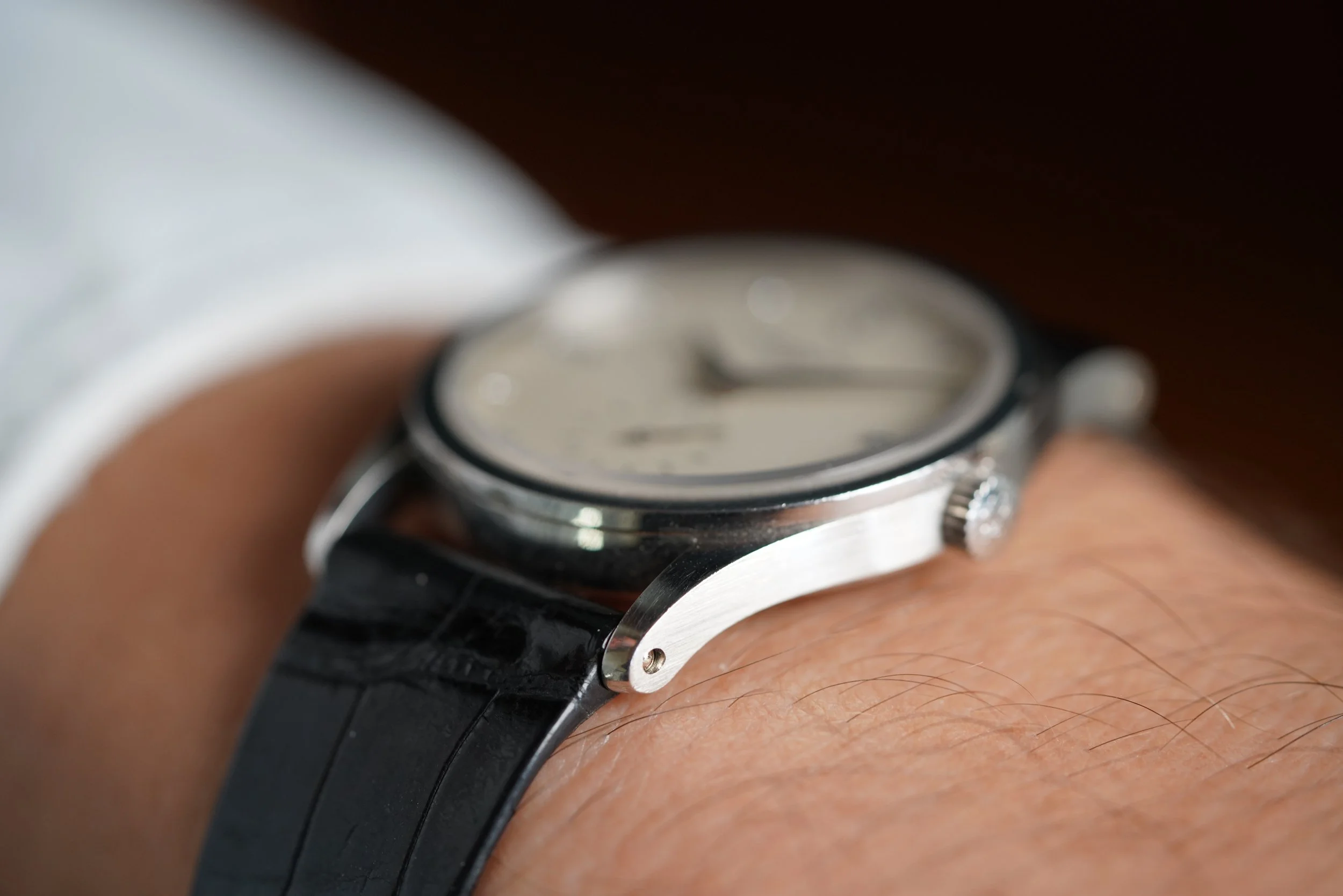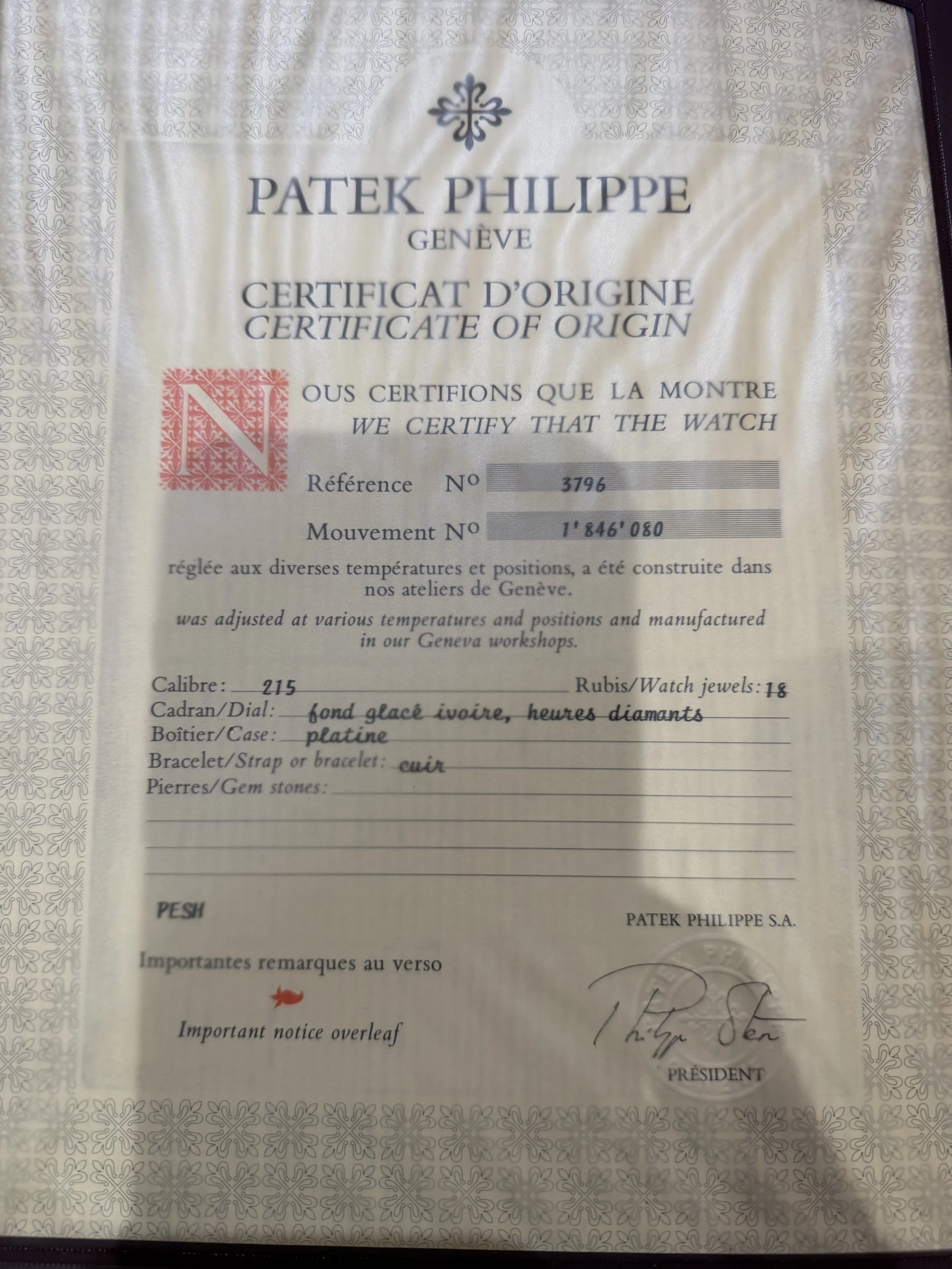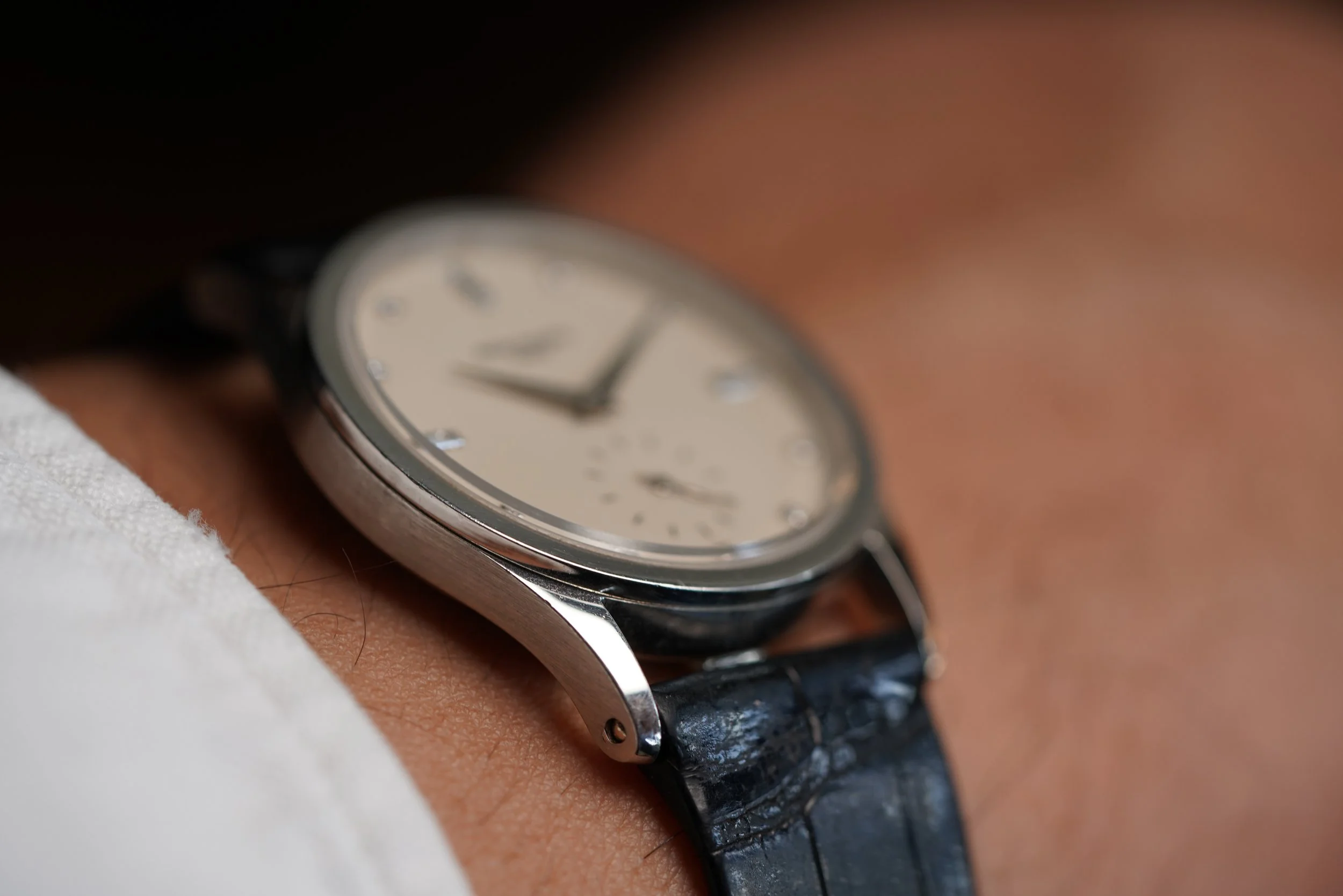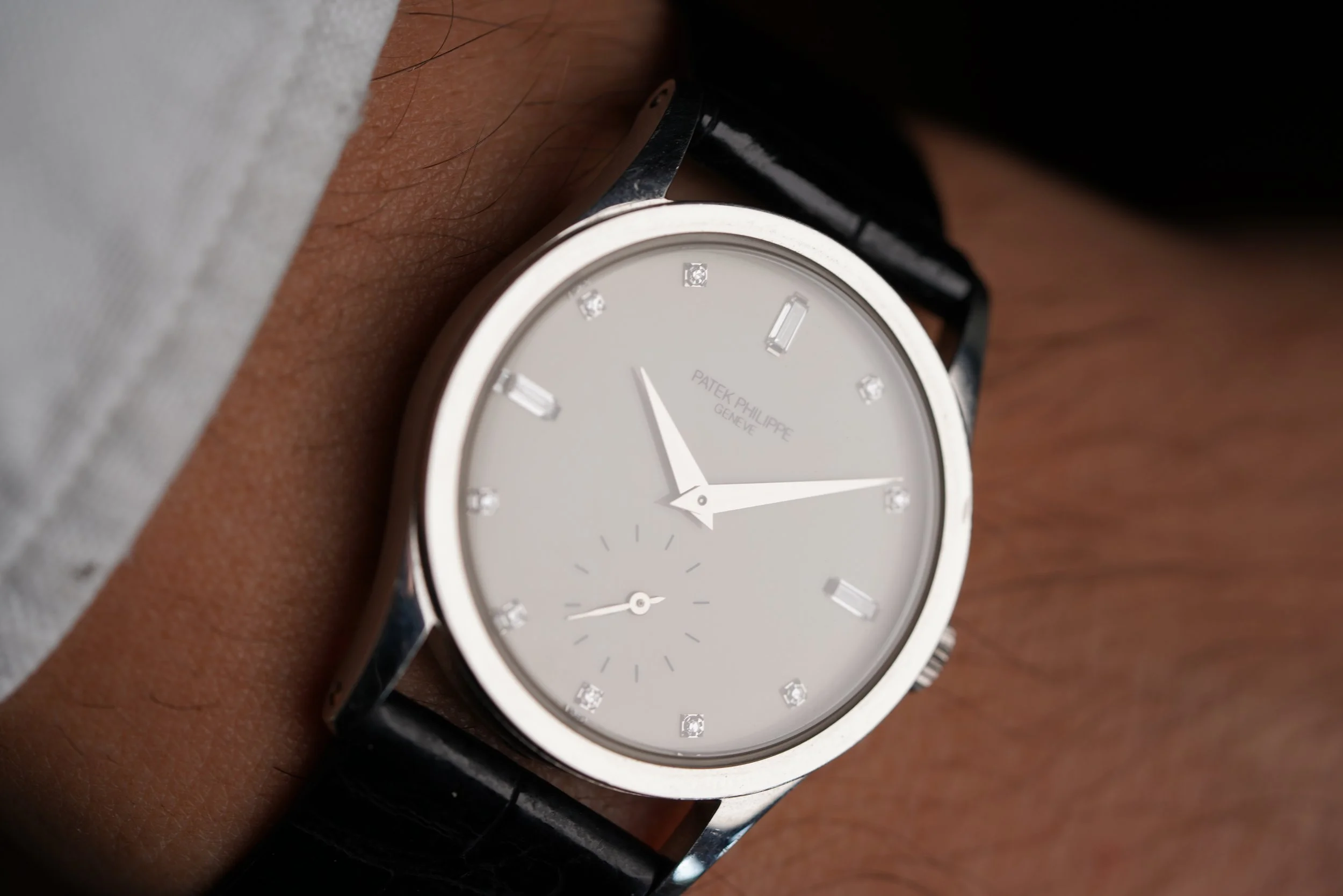 This Patek Philippe reference 3796 is a stunning Calatrava in platinum. It measures 31mm in diameter and approximately 38.5mm lug-to-lug. The reference 3796 was a model exclusively produced for the Japanese market. The platinum case has been lightly polished. The watch features a cream dial with diamond indices in the form of baguettes at 12, 3, and 9 and solitaires in the other positions. It features a subsidiary seconds at 6 o’clock.