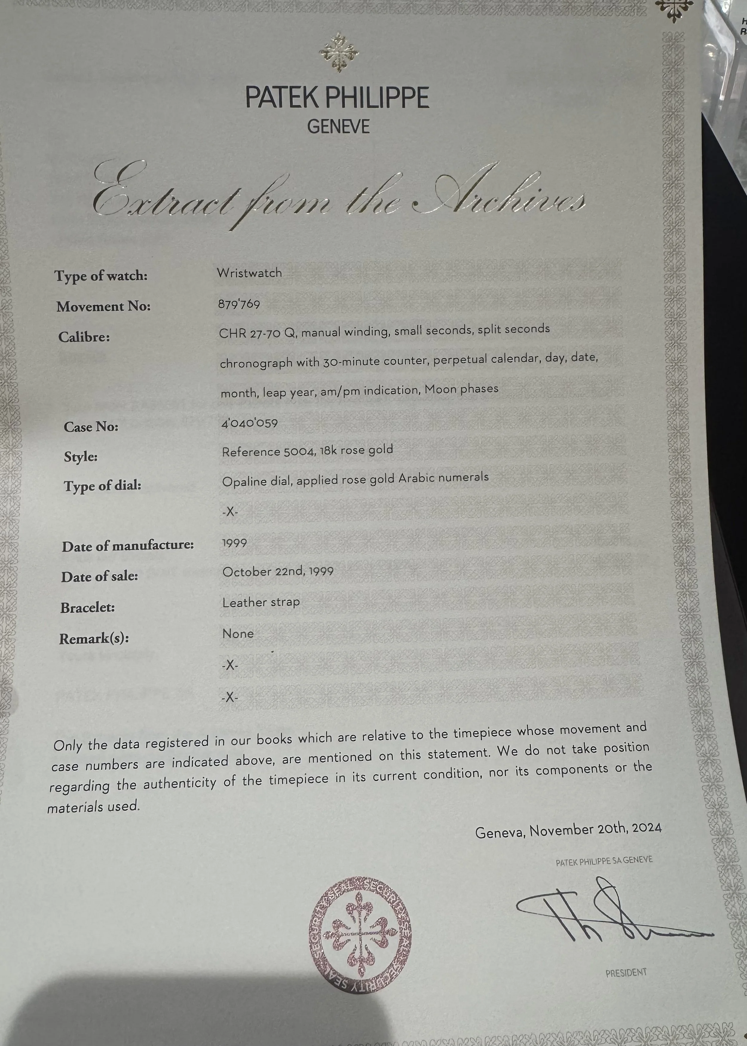 Patek Philippe Reference 5004R w/ Extract from the Archives As New