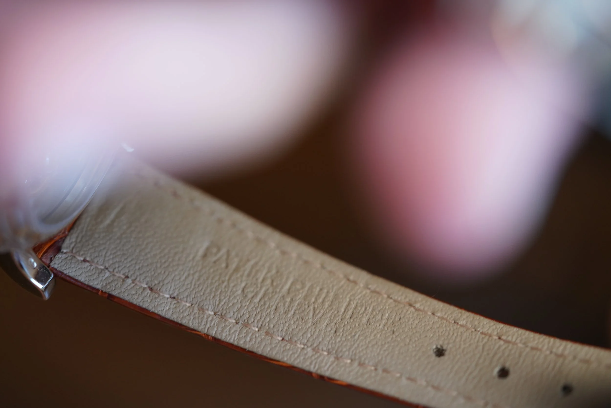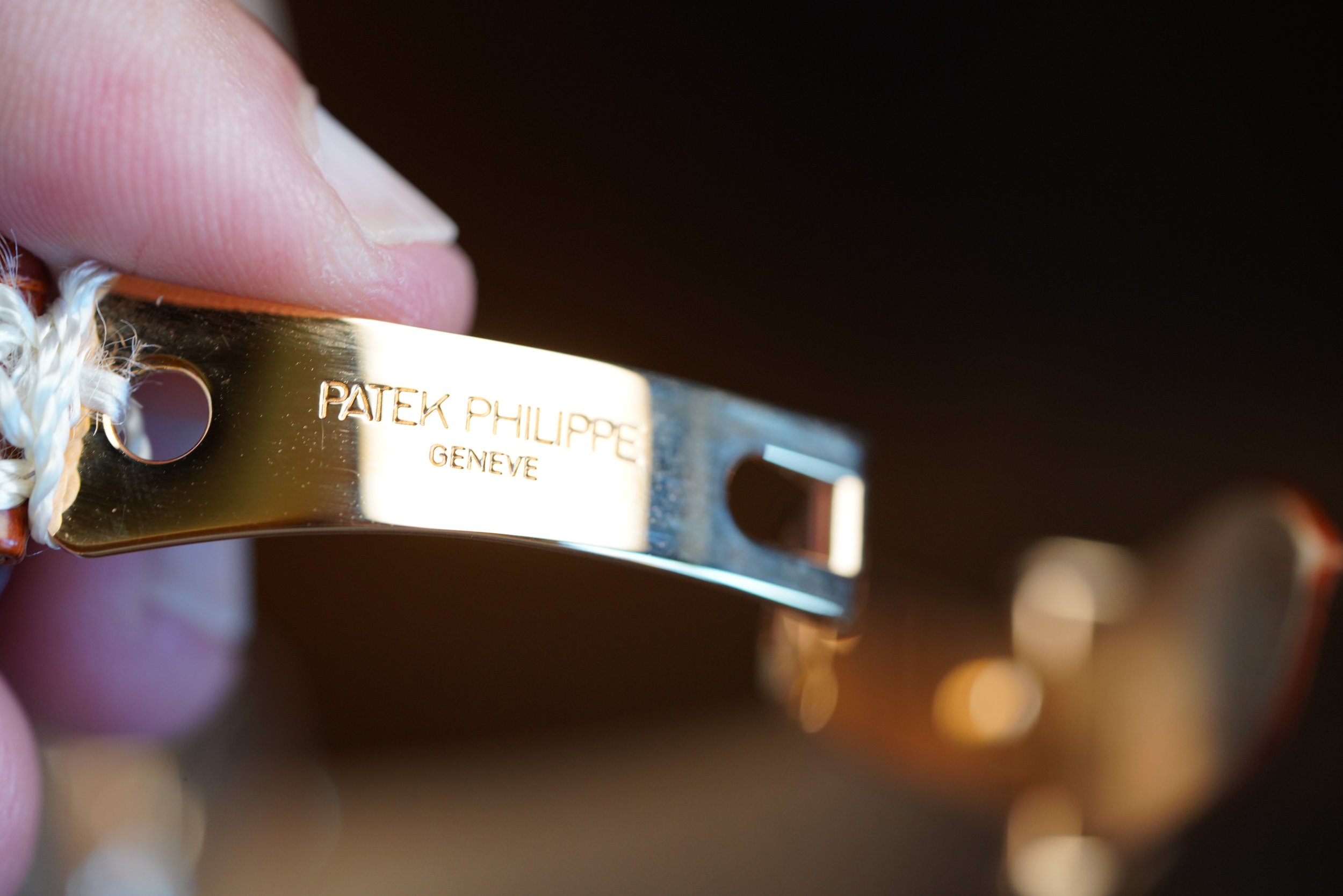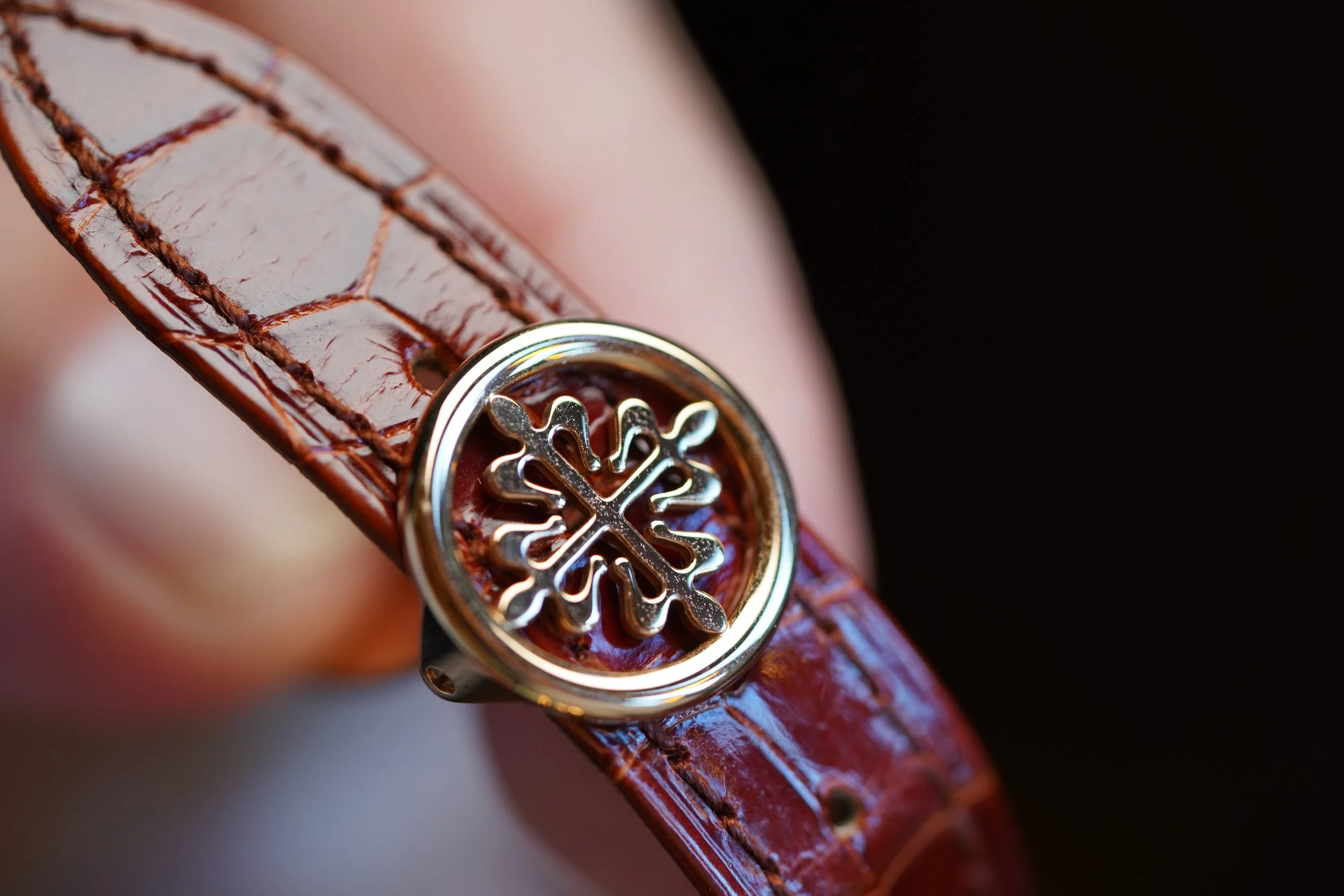 The lug width is 19mm and it comes with a Patek Philippe pin buckle in 18k rose gold on the original leather strap.