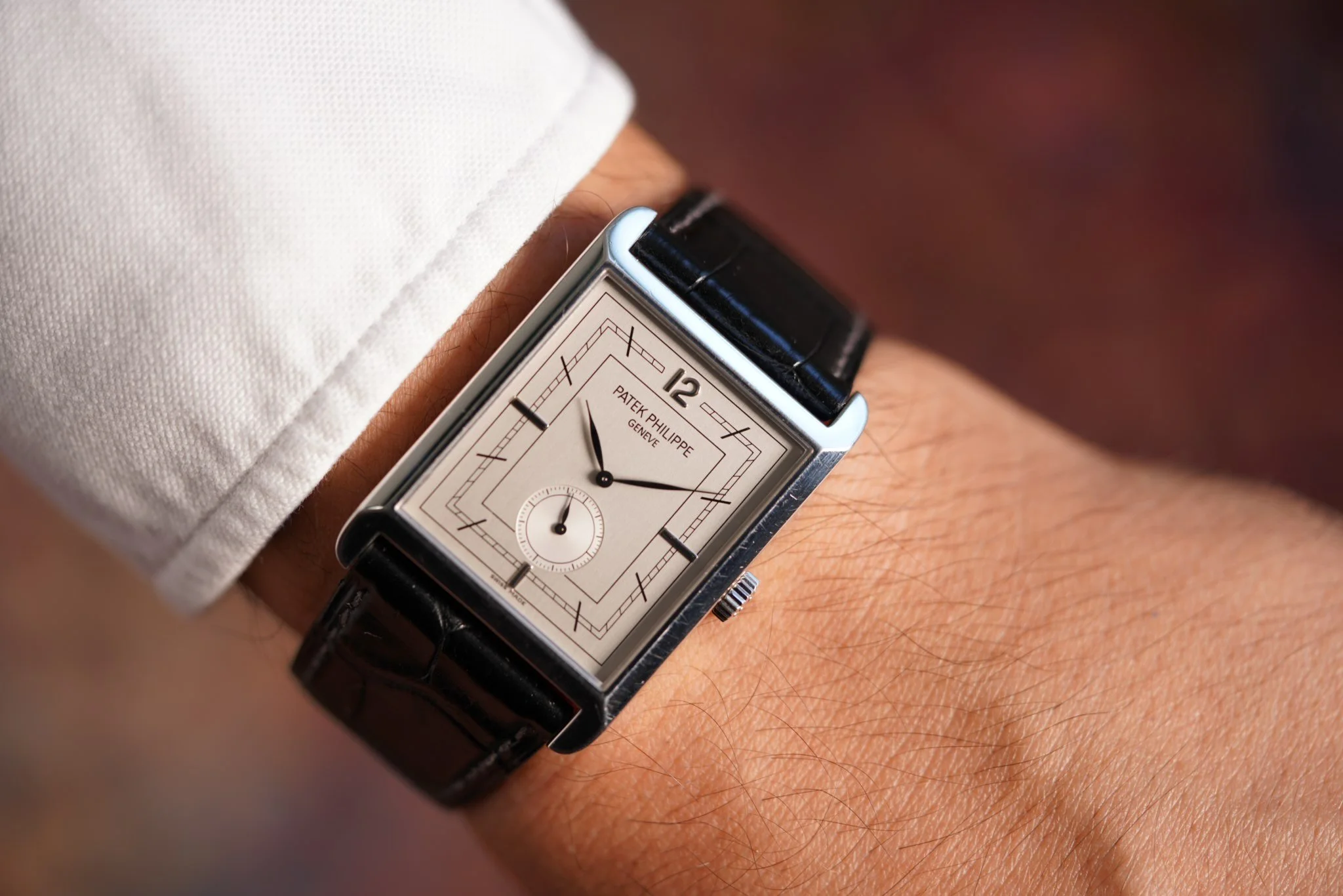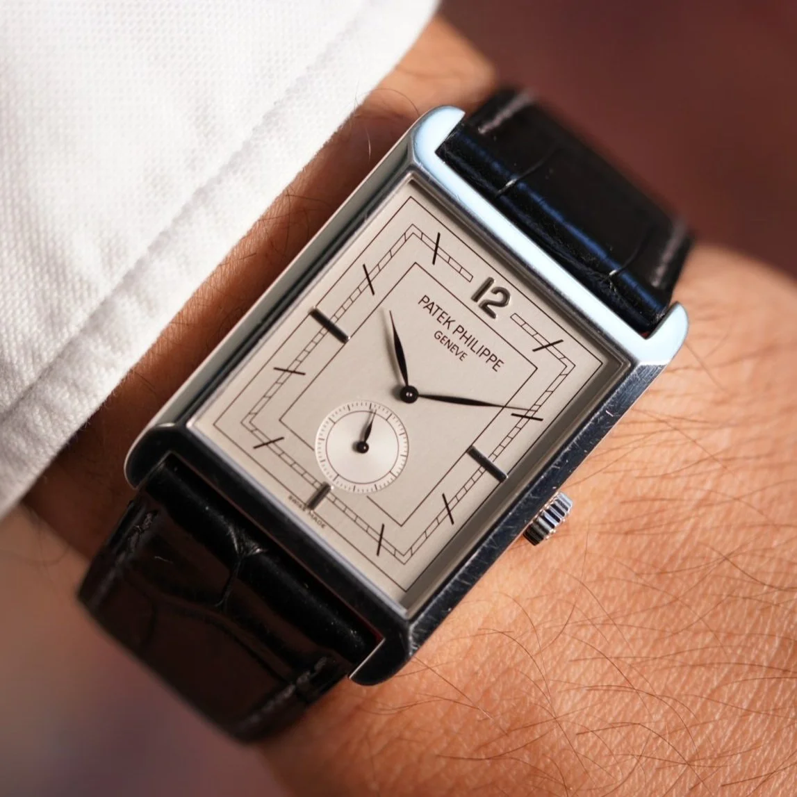 The Patek Philippe Gondolo reference 5109 began production in the early 2000s. This particular model is the less common platinum model dating to circa 2006 - the reference 5109P. The watch is powered by the calibre 215 PS and features a 44-hour power reserve. The case measures 43mm lug-to-lug by 30mm in diameter (excluding the crown). The case appears to be unpolished with light wear. Located between the 6:00 lugs is a diamond embedded as is standard practice for Patek Philippe platinum watches on straps now.
