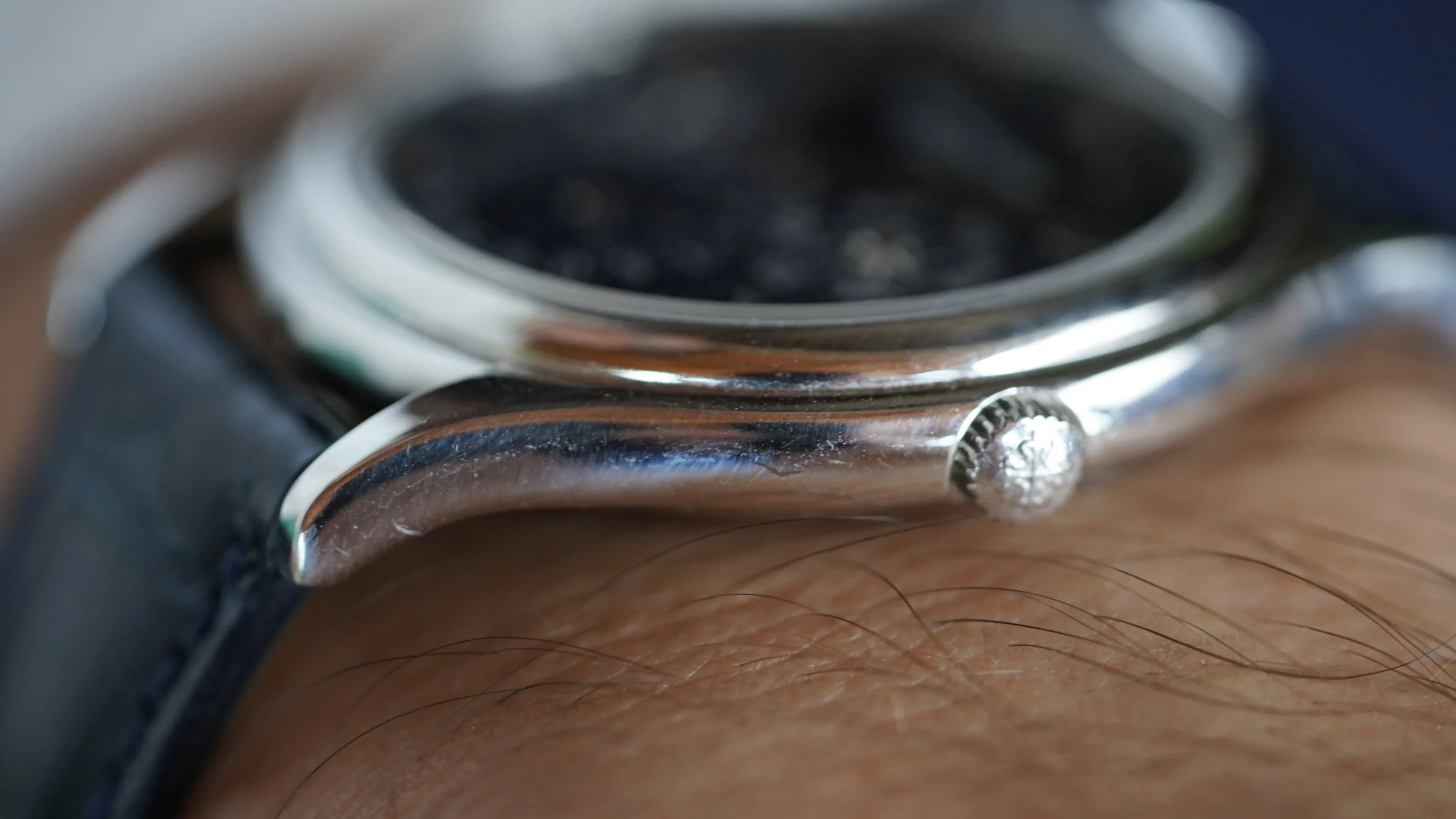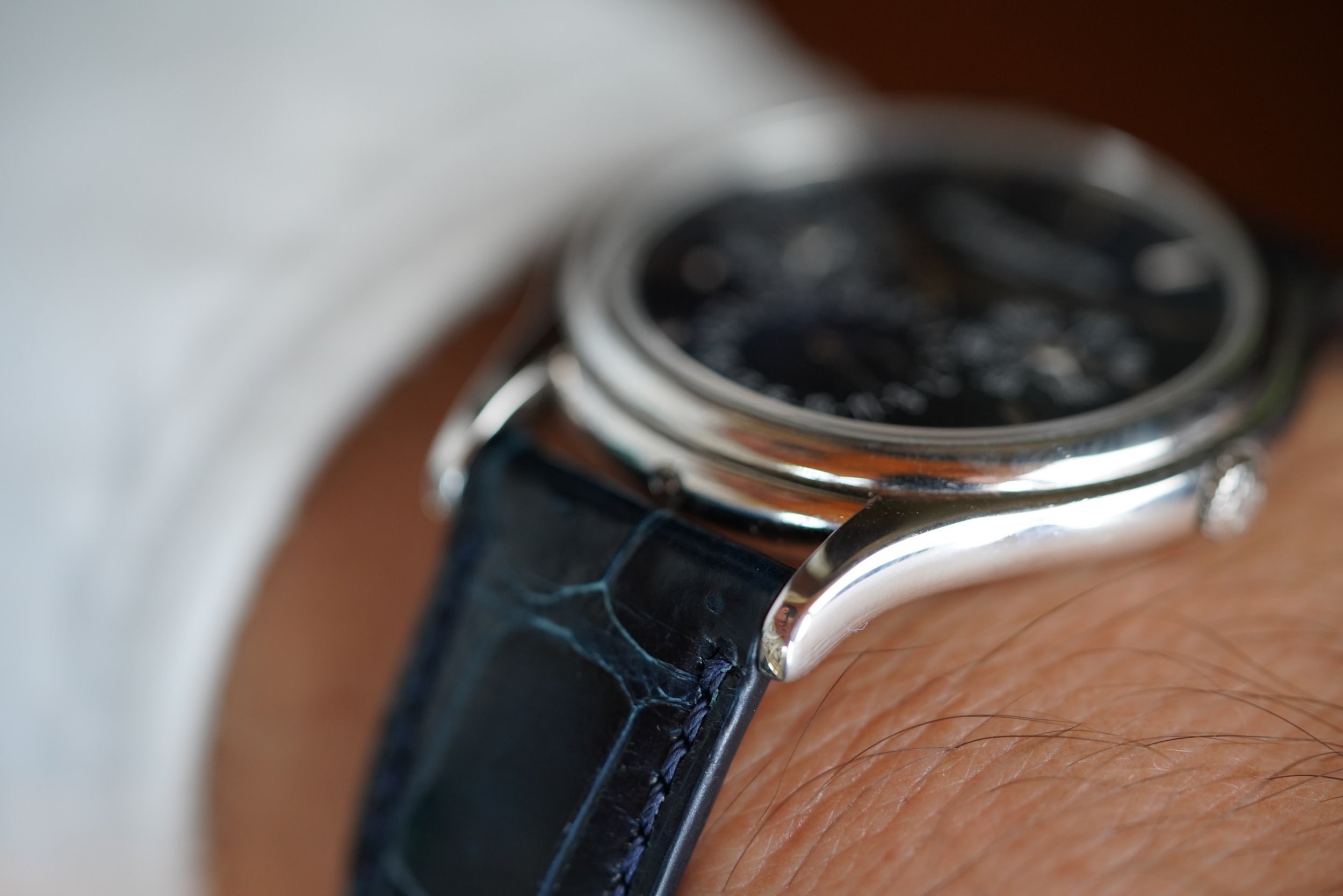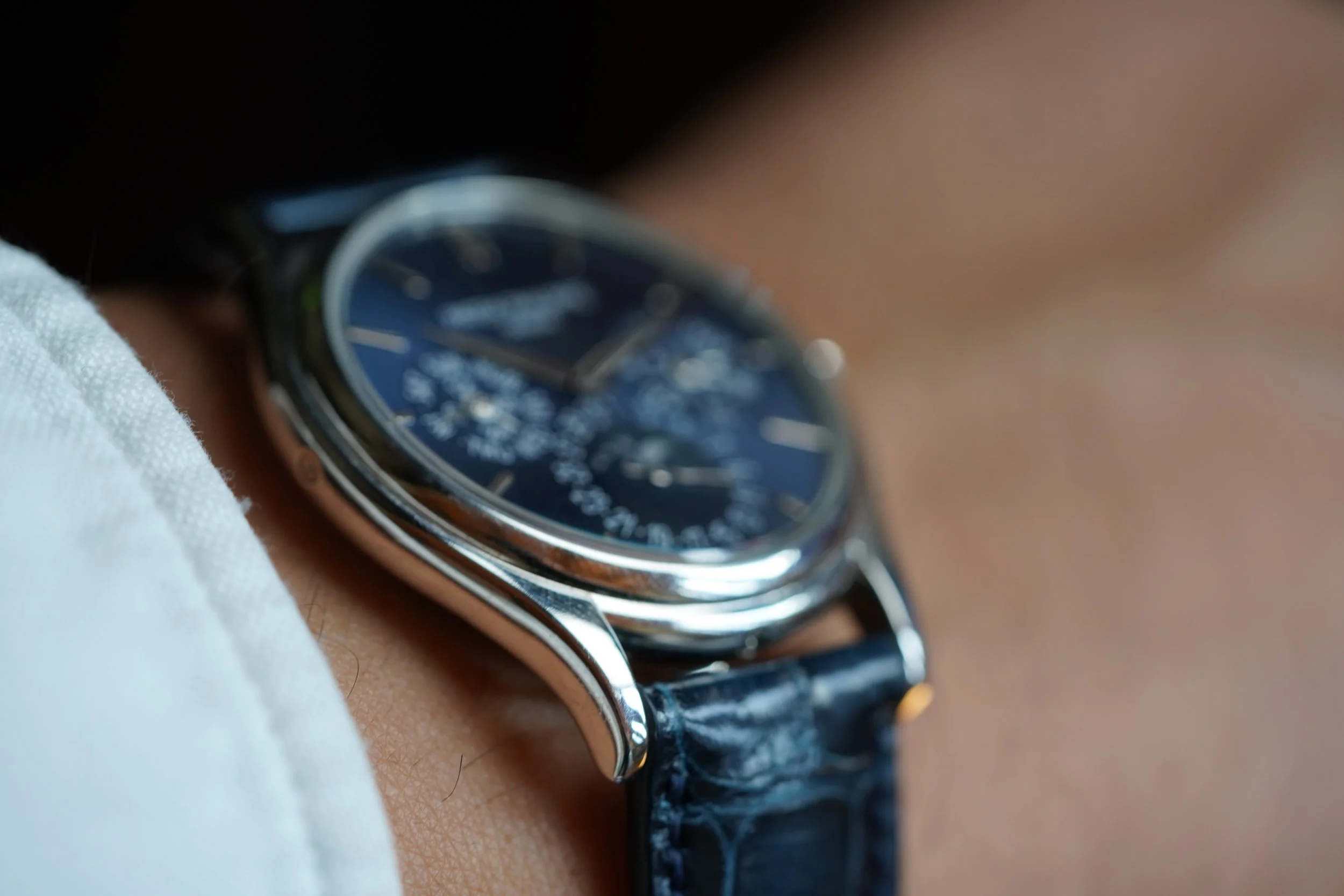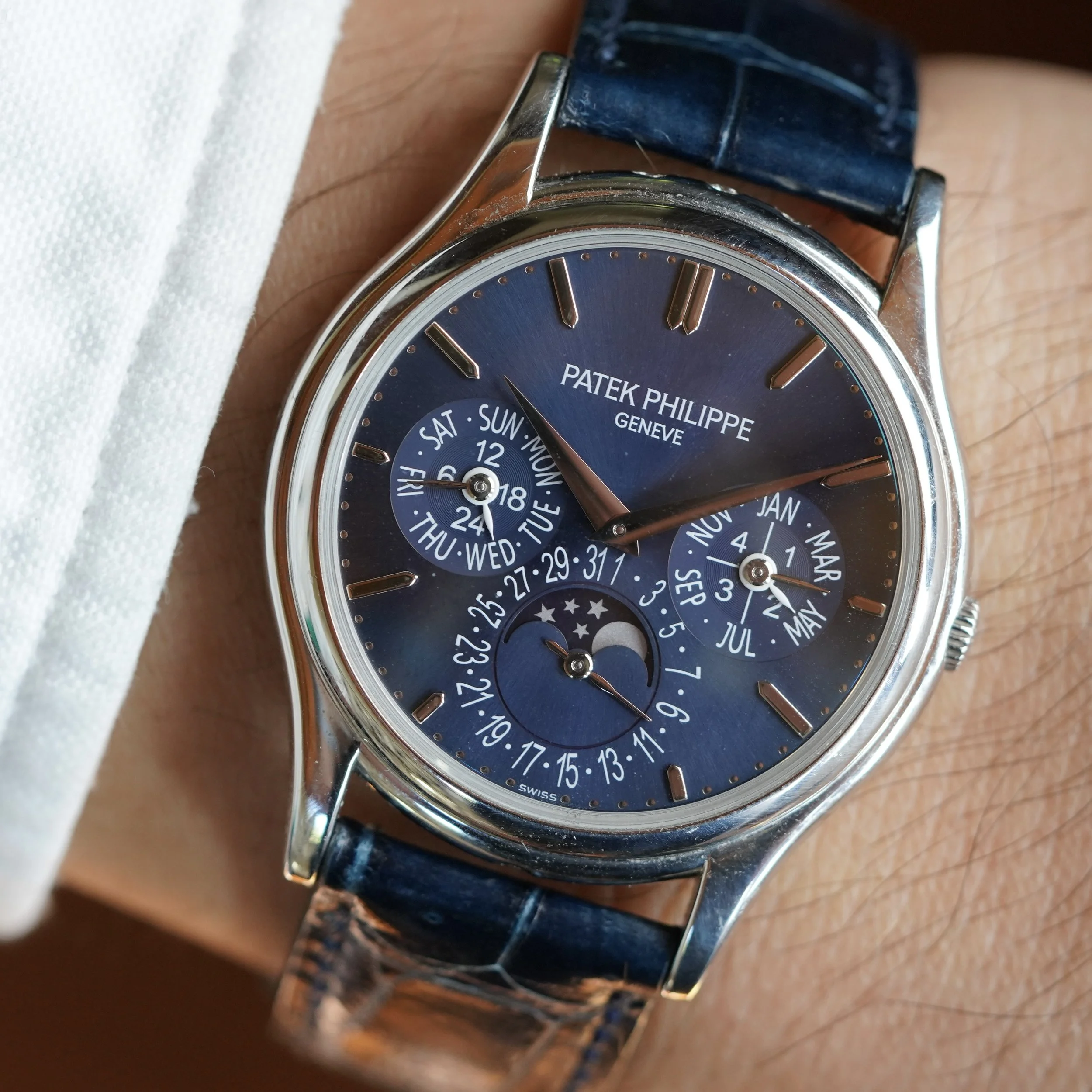 The Patek Philippe reference 5140 is one of the most beautiful complicated watches. This example is in platinum with a tremendous blue dial. It measures 37mm in diameter. The case appears to be unpolished. The watch dates to the 2010s. We do not know the date of production. It is powered by the calibre 240 Q.
