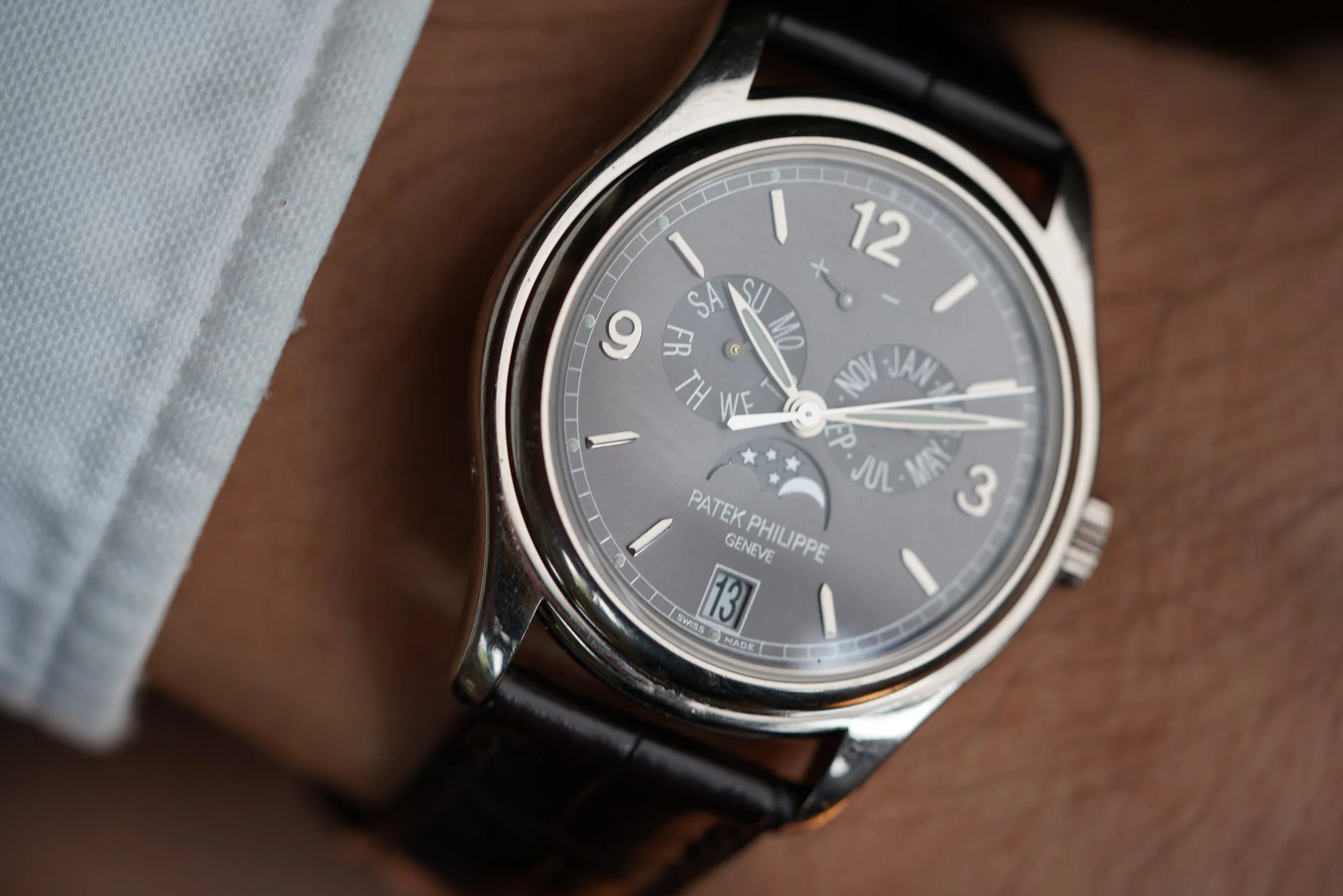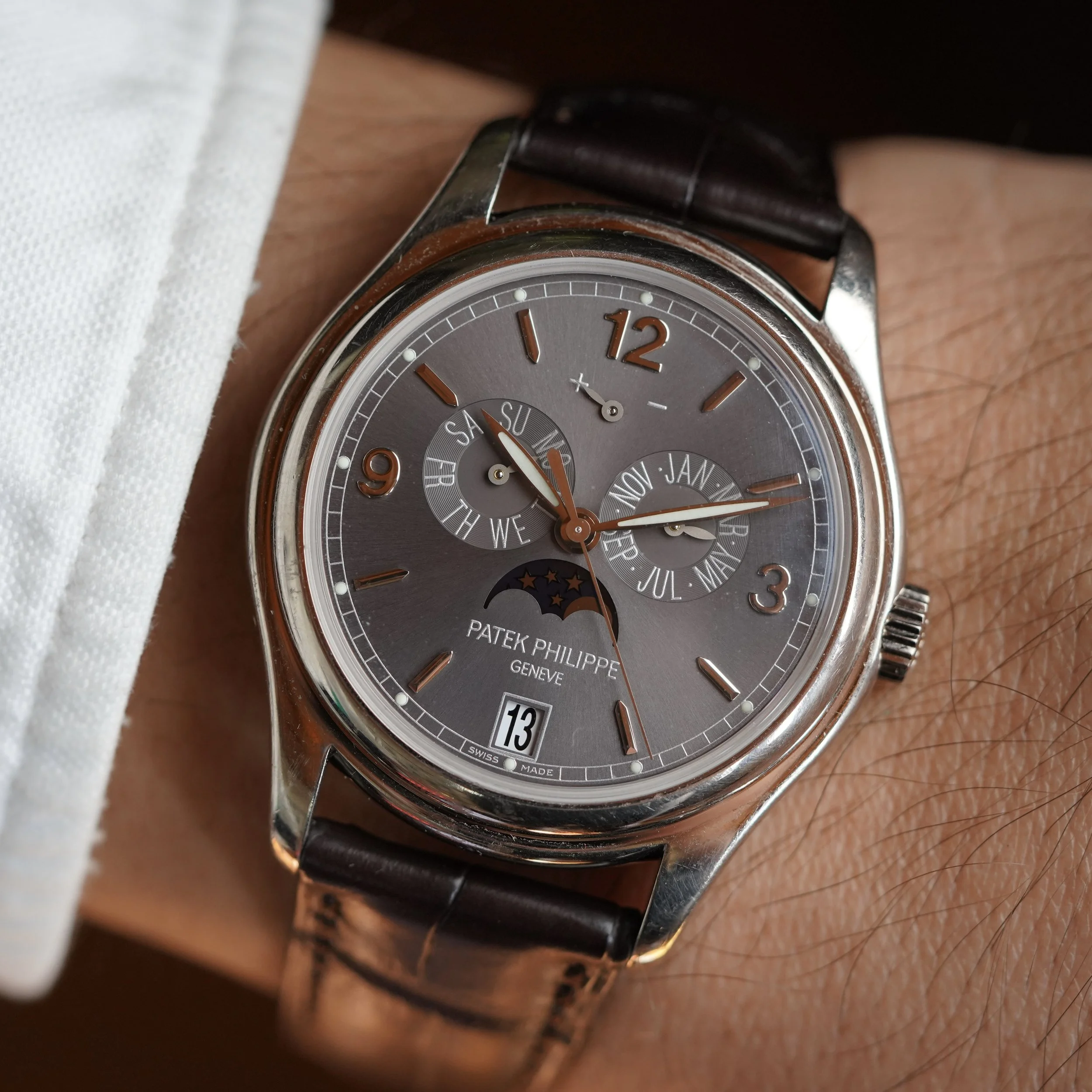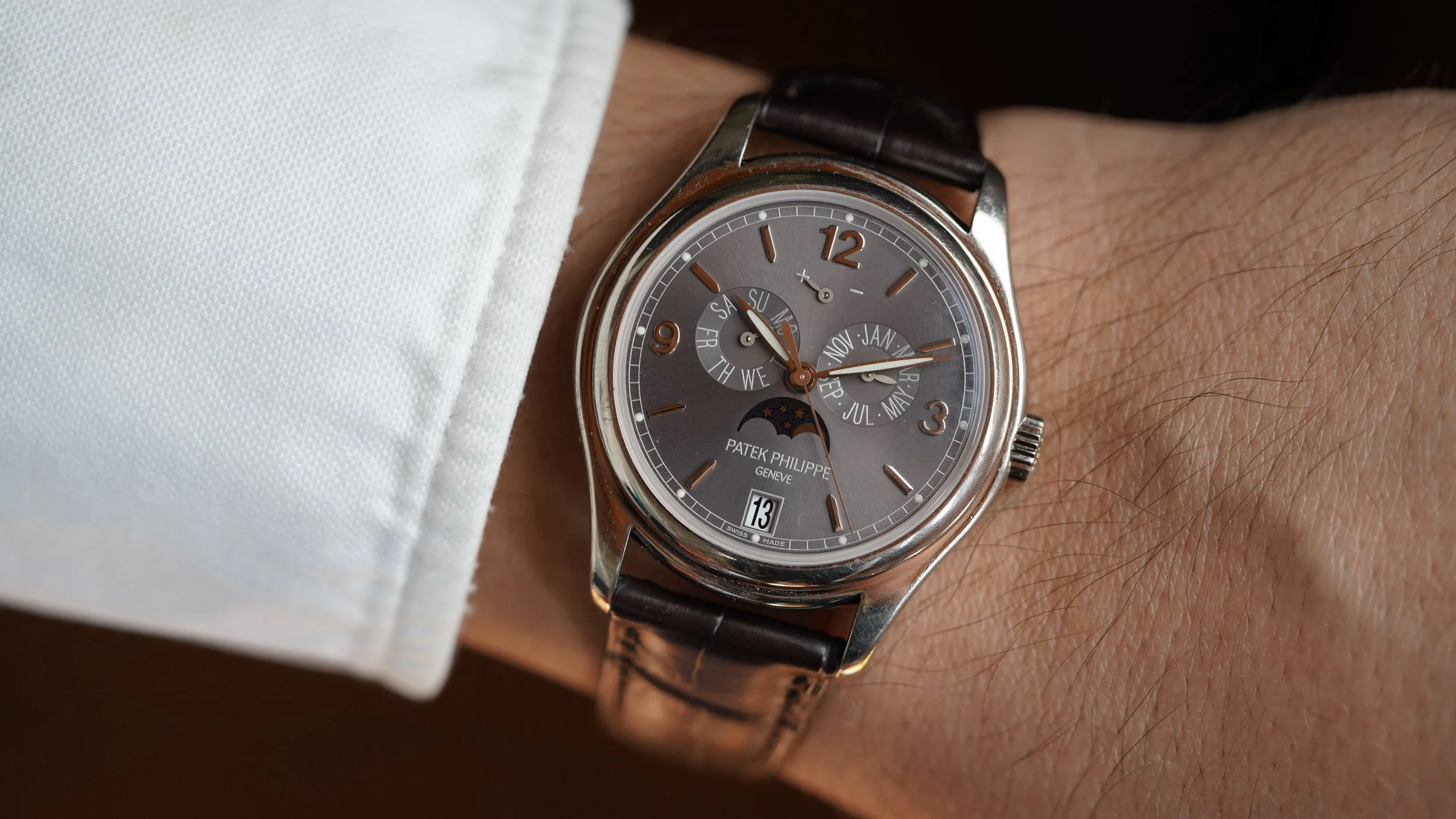 The Patek Philippe reference 5146G-010 is an awesome annual calendar model. The model is now discontinued. This particular example is a beautiful 18K white gold case. The case measures 39mm in diameter. It features a beautiful grey dial. It is paired on a brand new Patek Philippe strap.