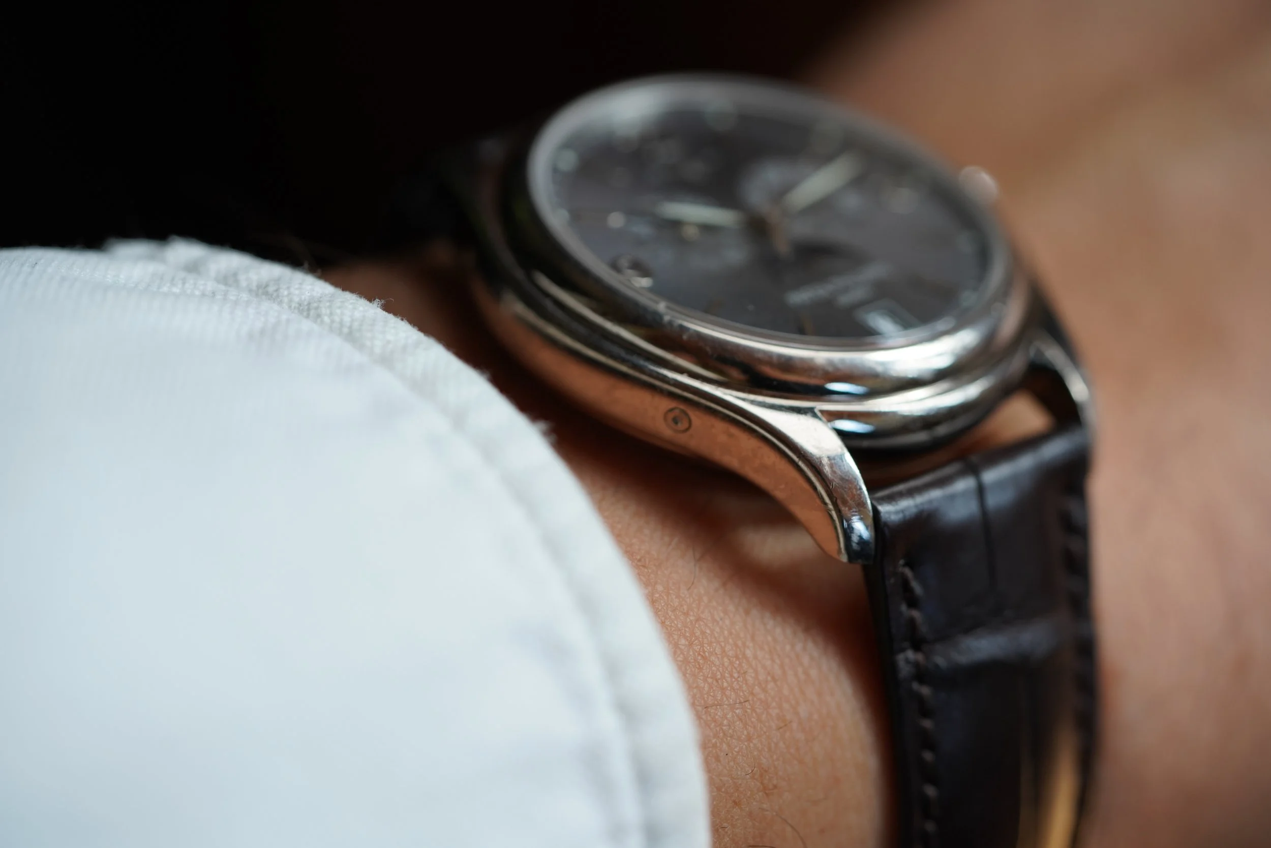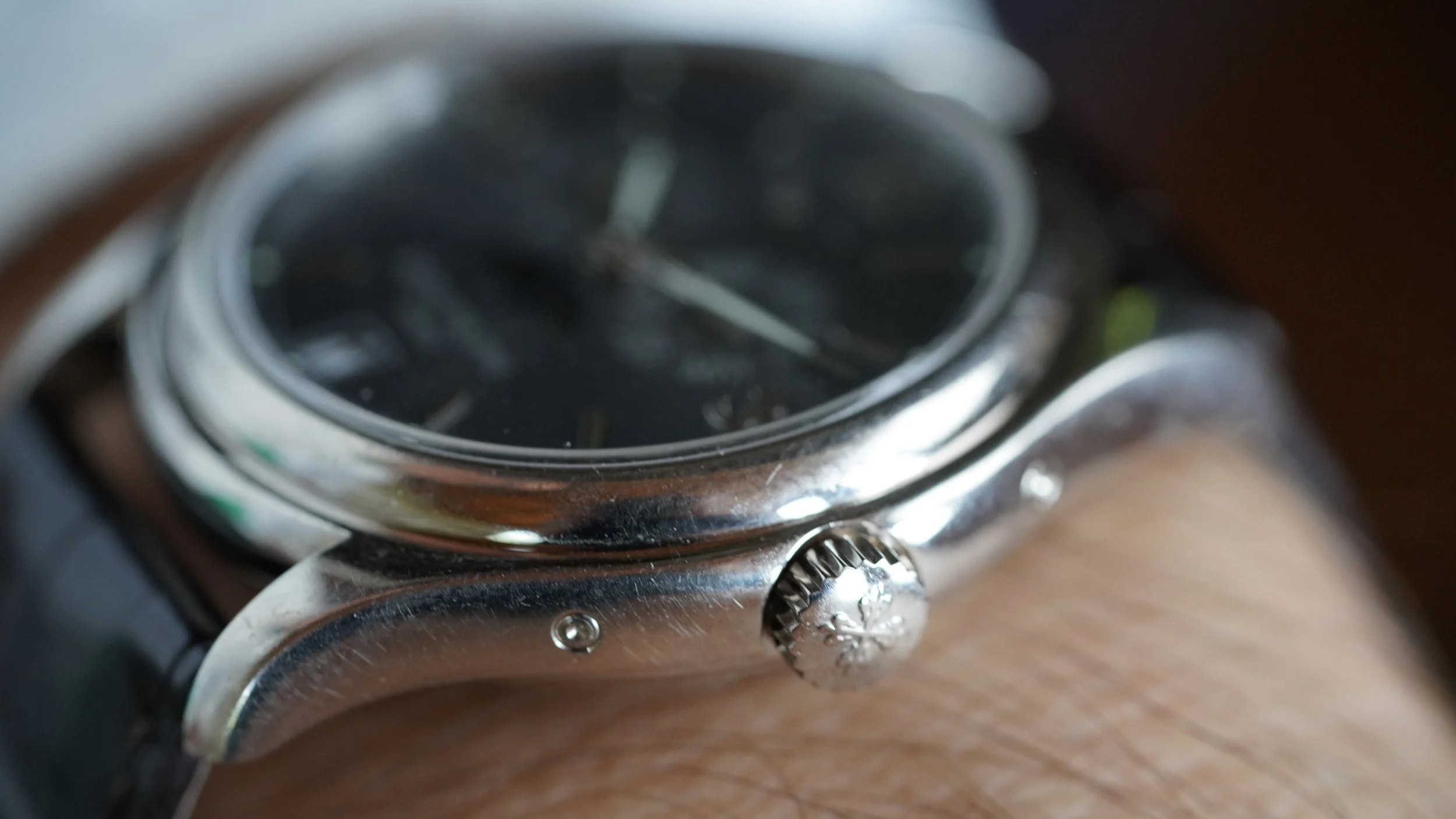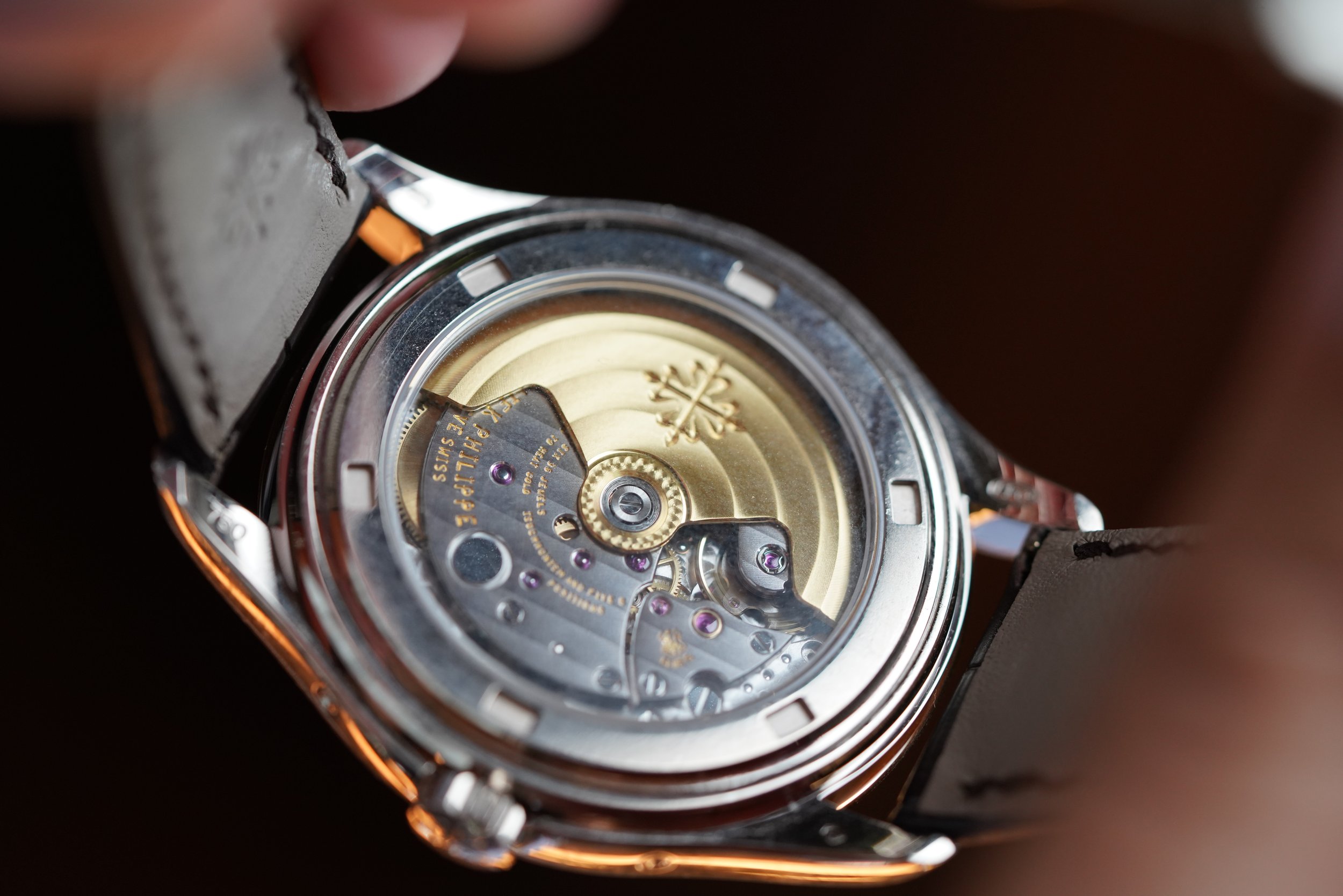 The watch does not come with a box or papers. It does come with service receipts from Patek Philippe dating to 2026 and is running well. The watch dates to 2007.