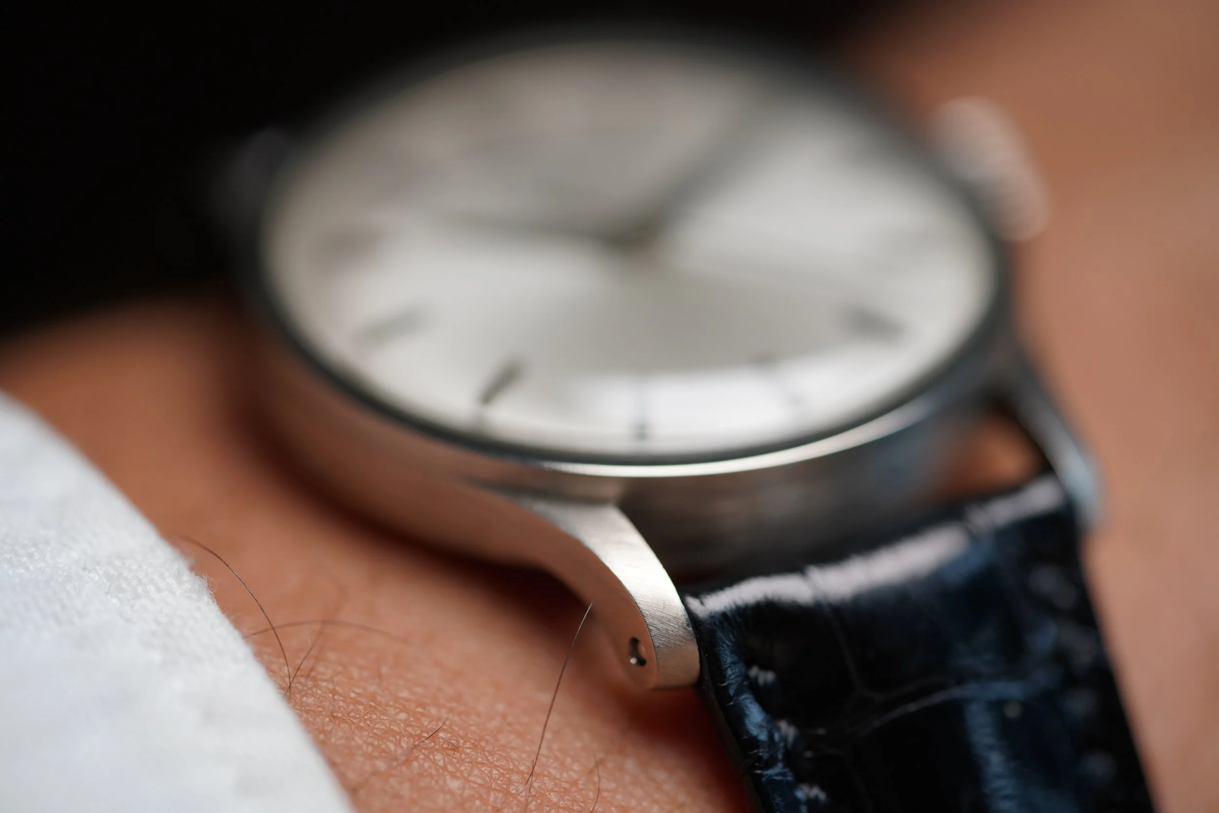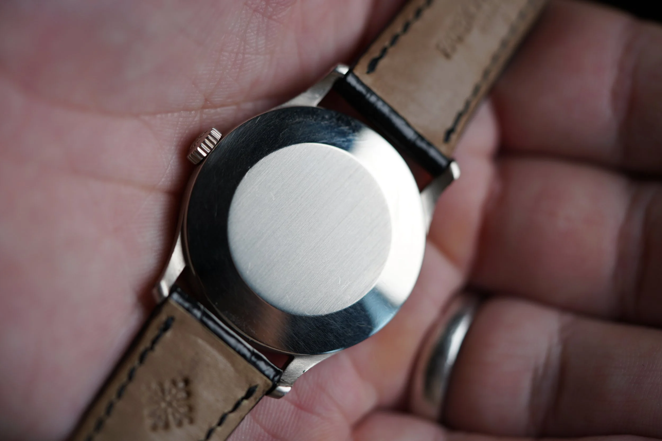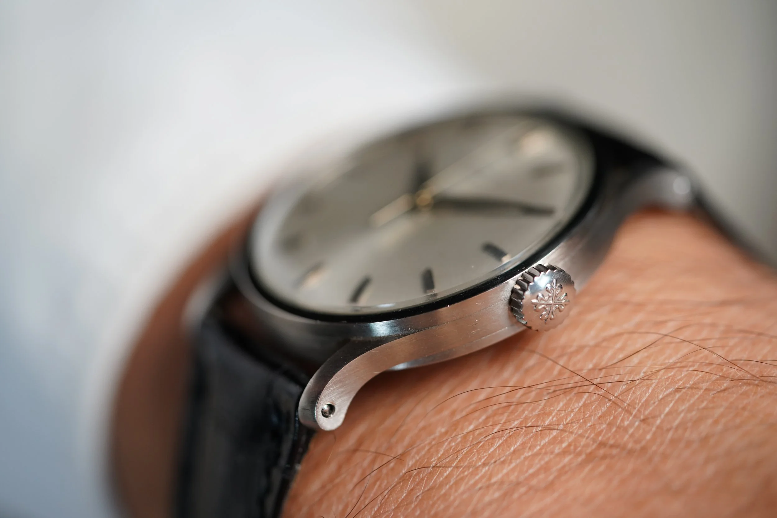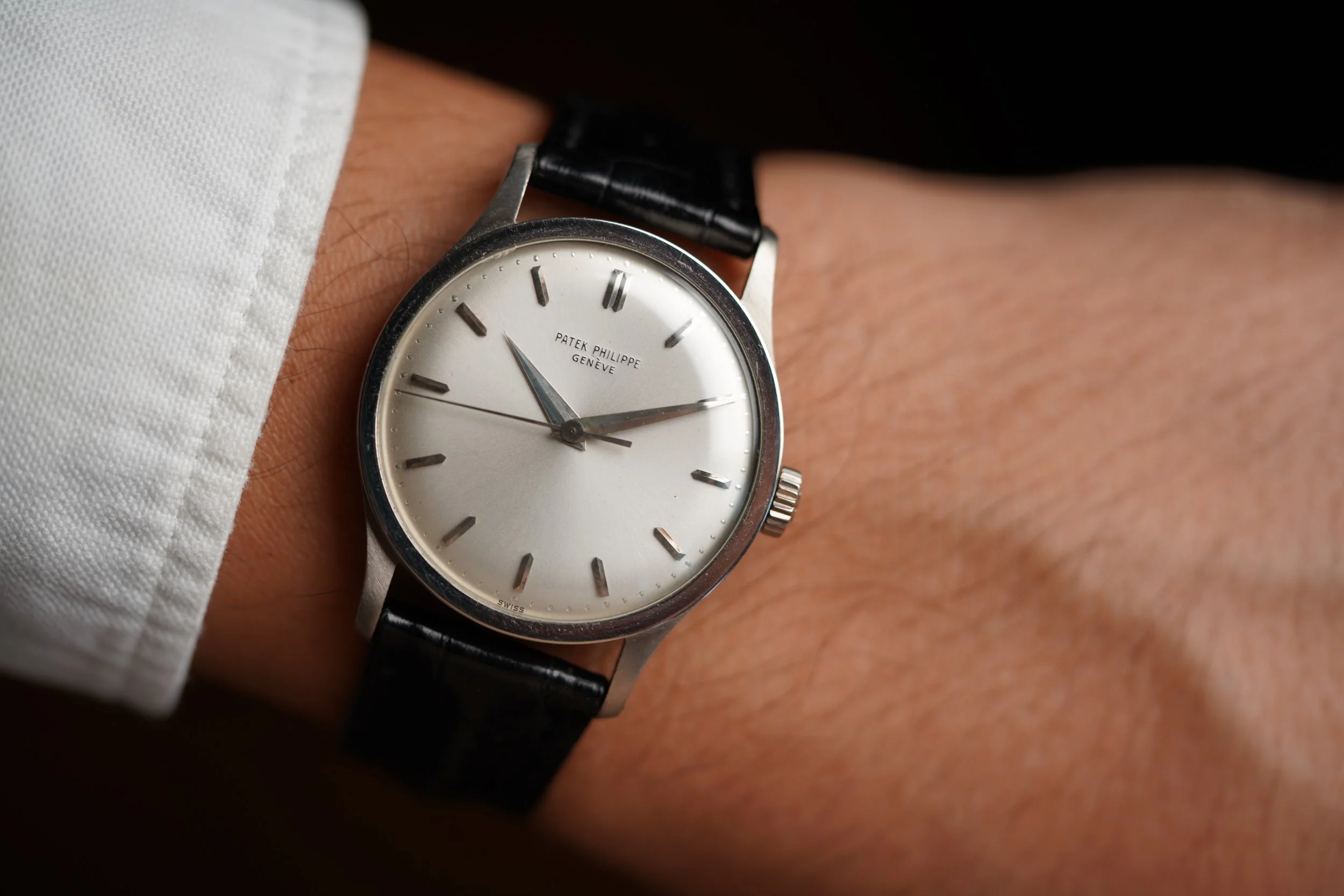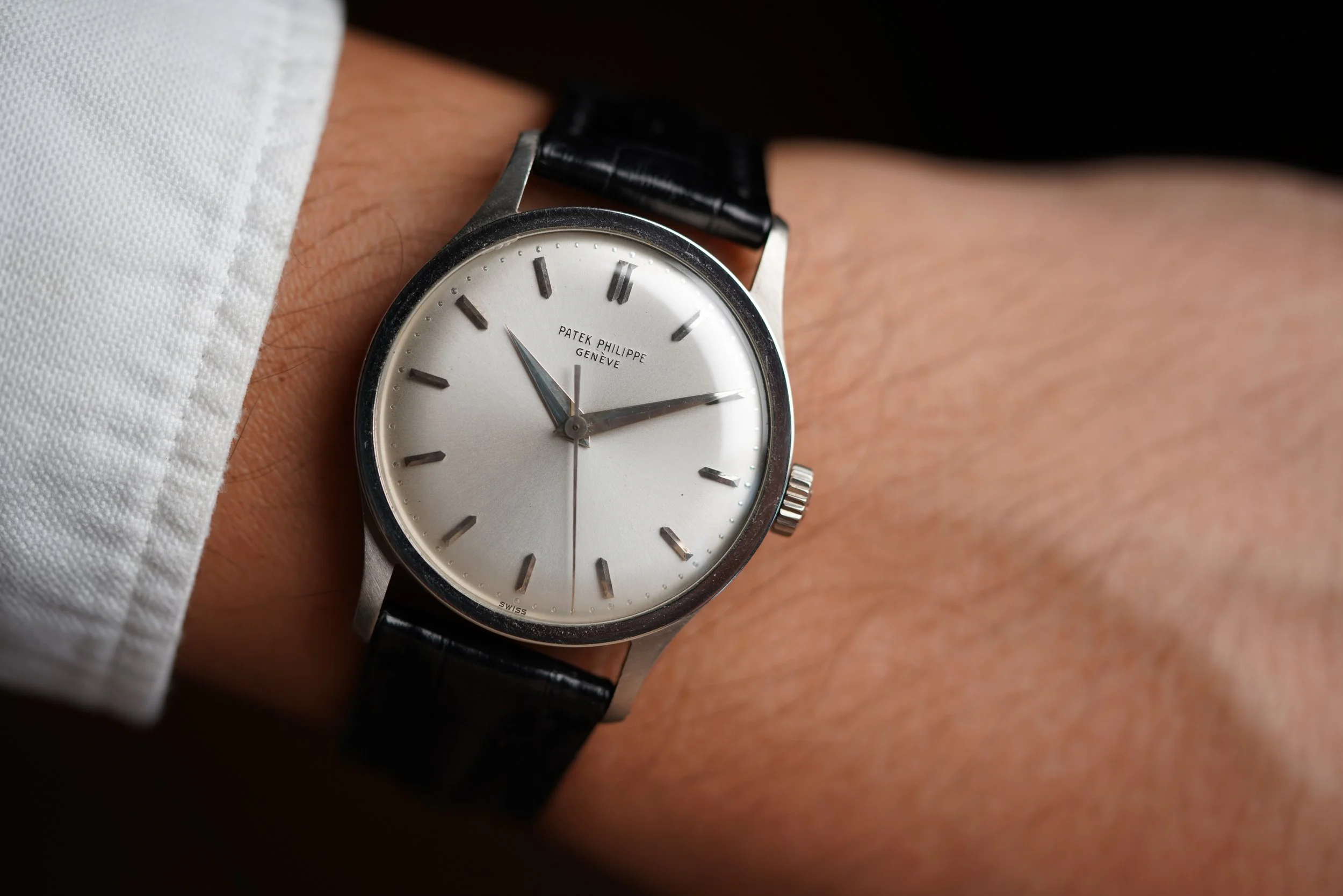 The Patek Philippe reference 570 is one of the most refined and sought-after dress watches. It is an iconic model within the Calatrava family. This specific watch is a reference 570 is a very attractive example. It features applied-dauphine hour markers which is one of the most attractive configurations. The white gold case is lightly polished.