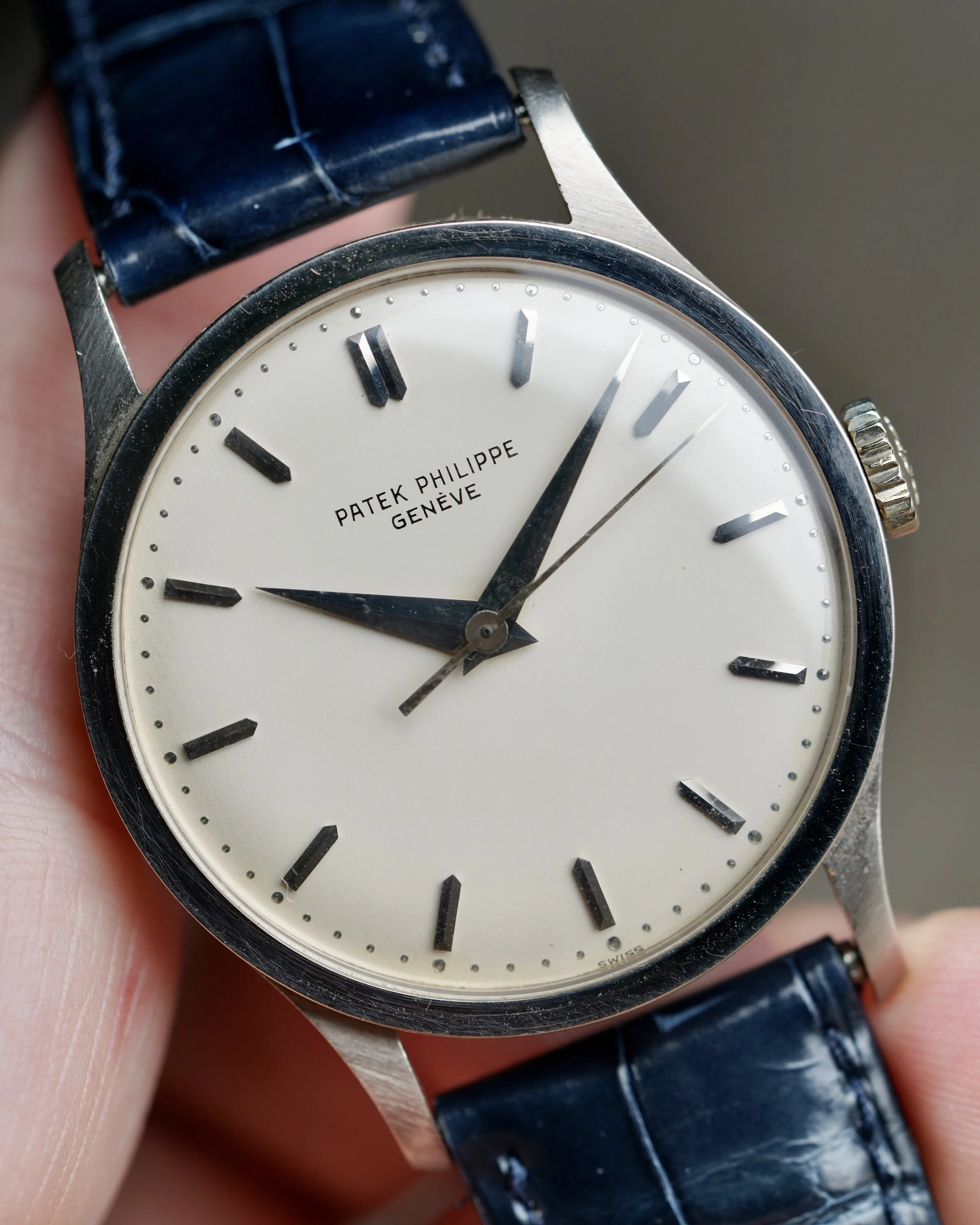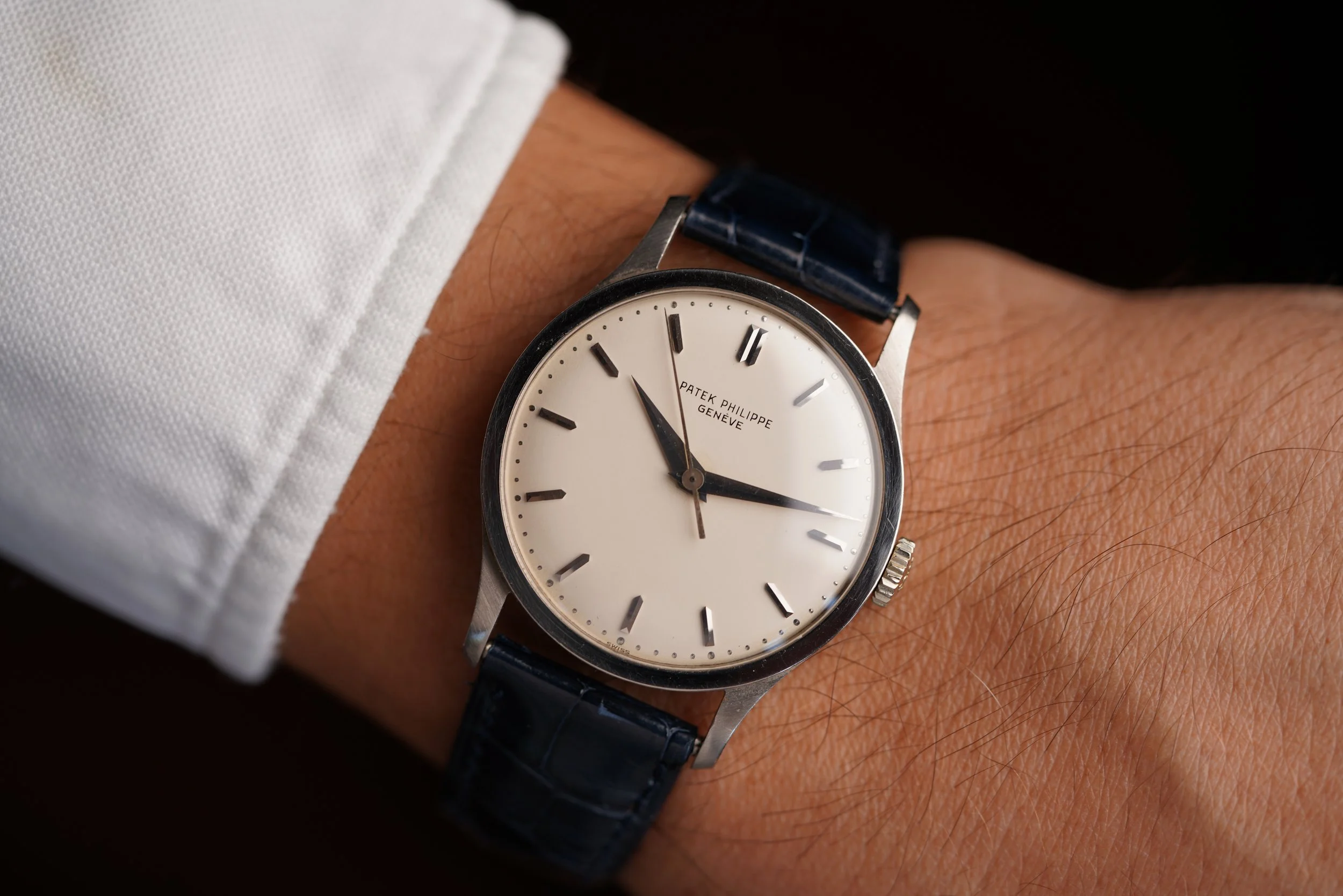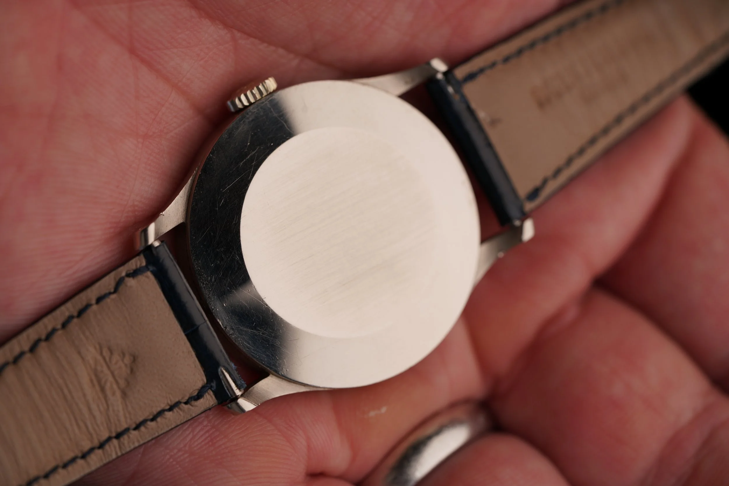 The Patek Philippe reference 570 is one of the most refined and sought-after dress watches. It is an iconic model within the Calatrava family. This specific watch is a reference 570 is one of the most beautiful examples. The white gold case is exceptional and appears to be unpolished. It is 35mm in diameter and paired on a Patek Philippe strap with a vintage white gold Patek buckle. It features applied-dauphine hour markers. Super collector Michael Stockton has an incredible example like this. Worship him when you see him!