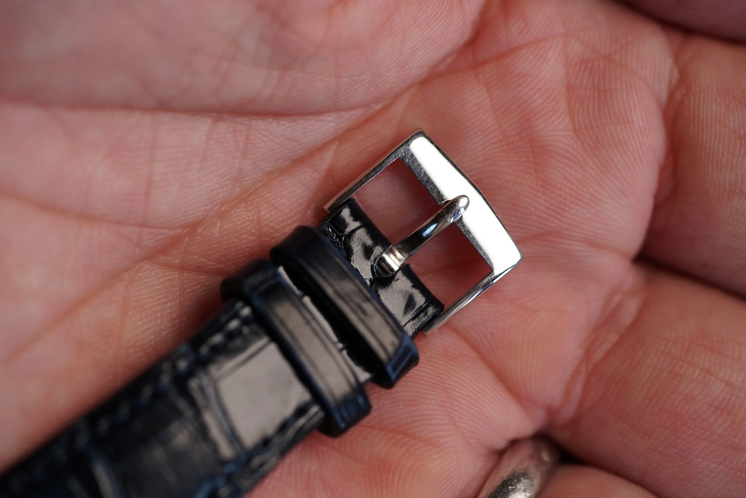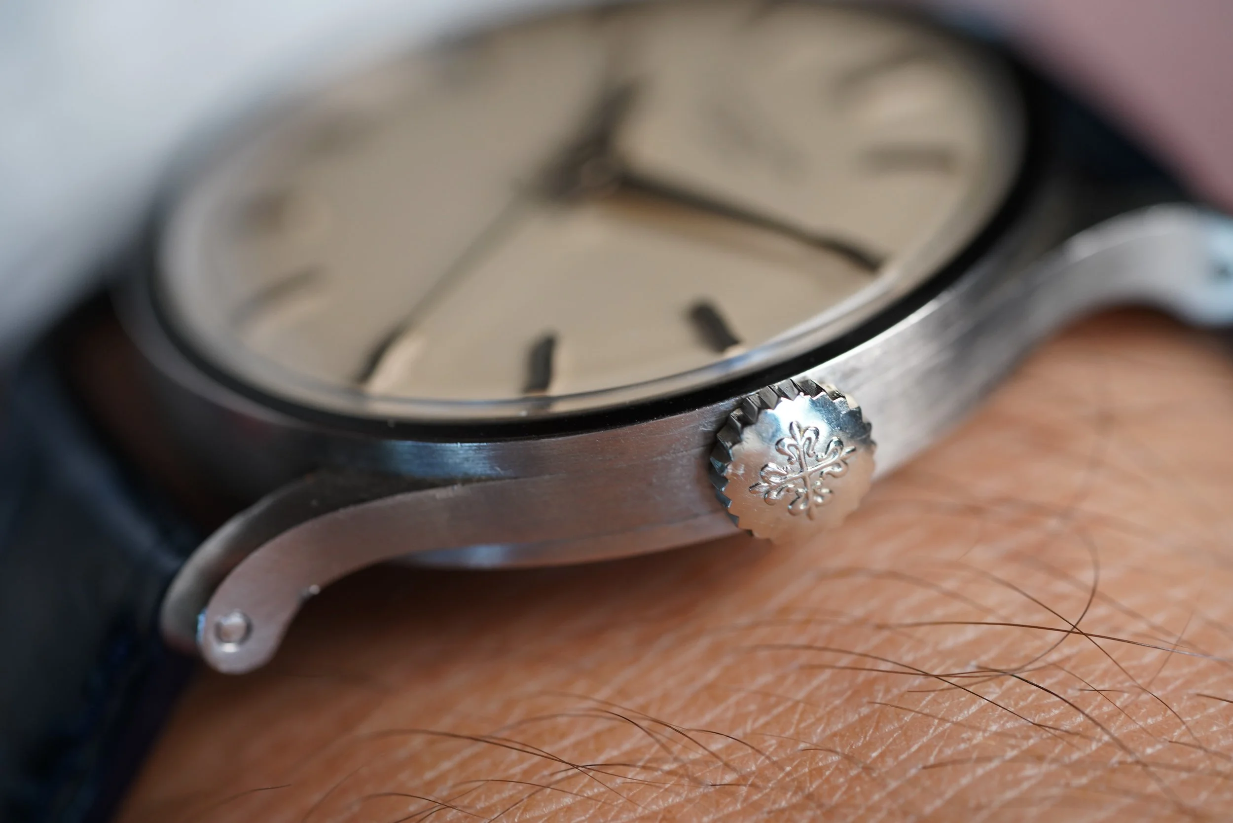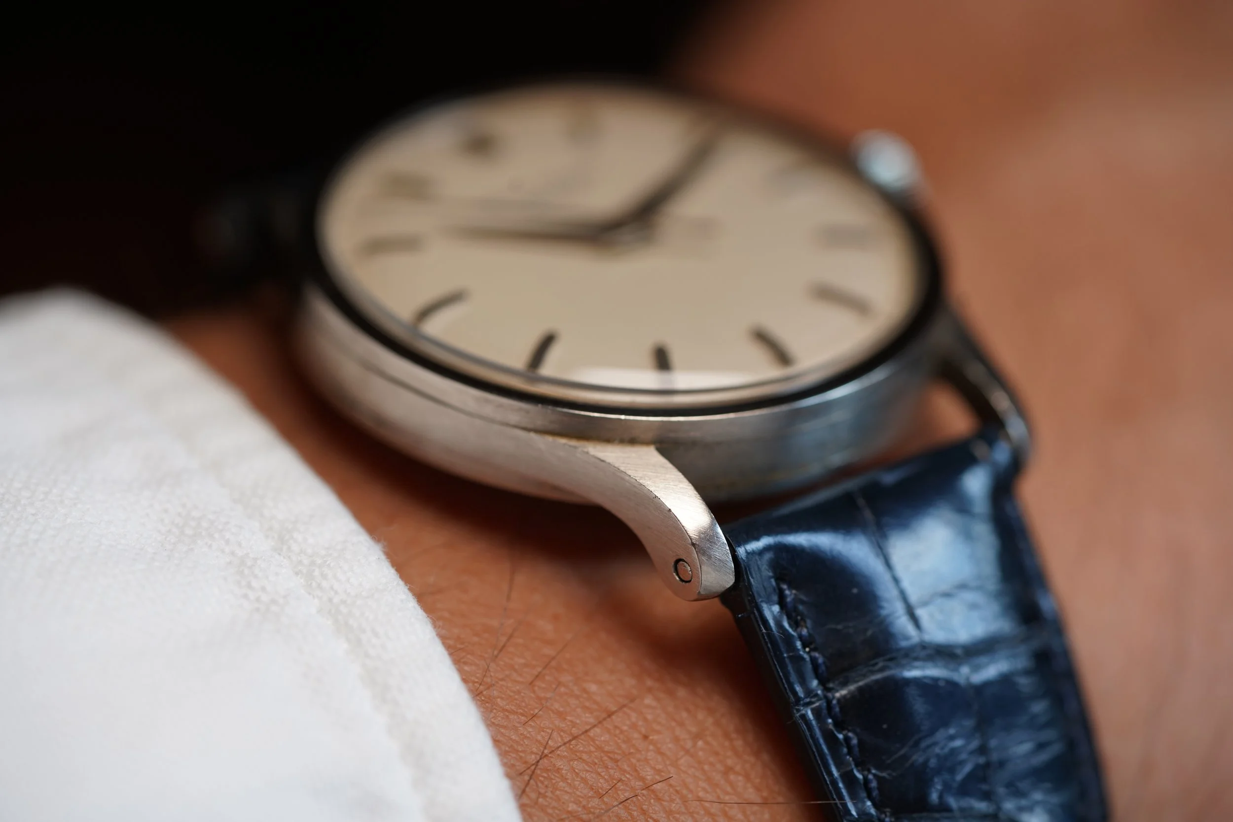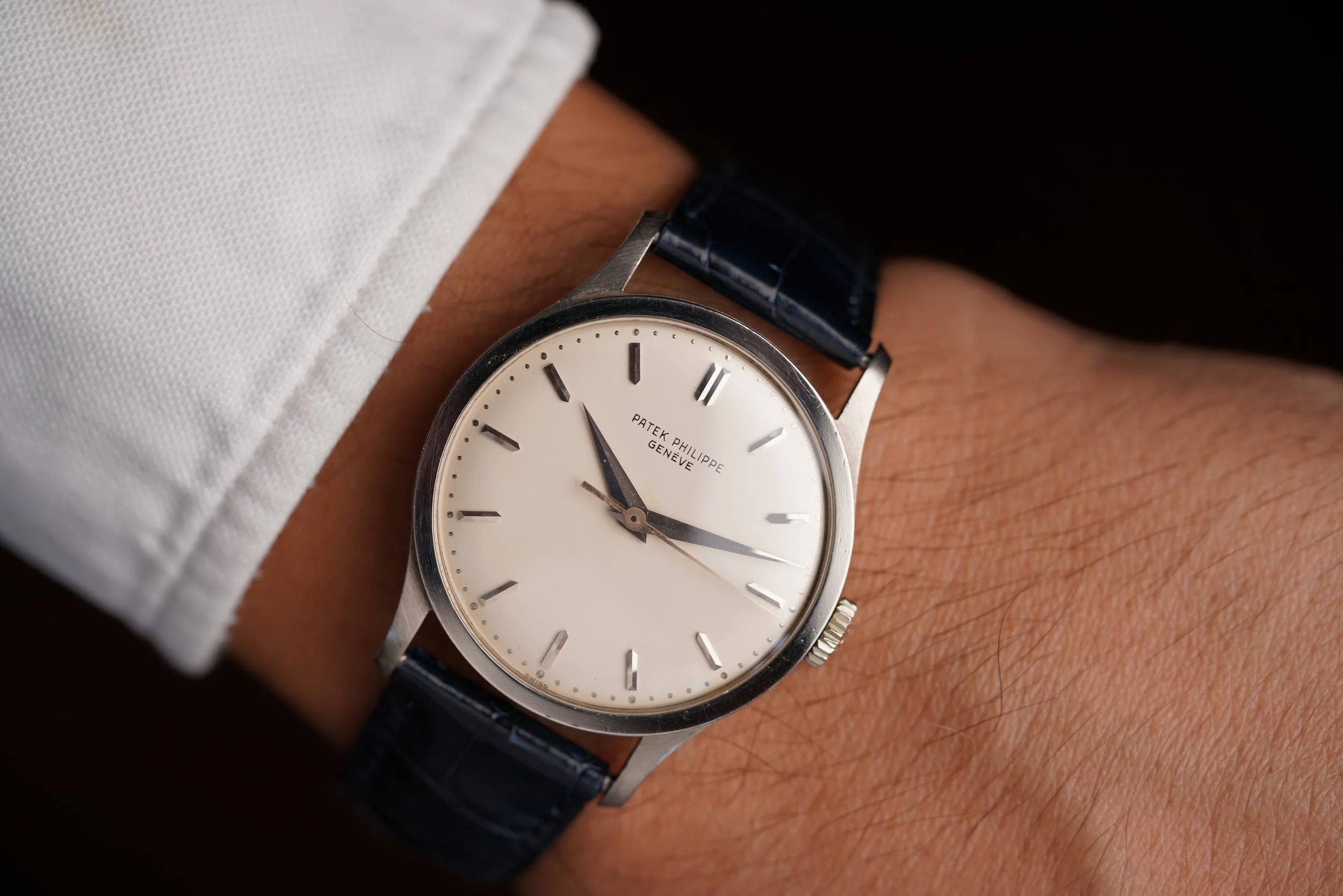 The Patek Philippe reference 570 is one of the most refined and sought-after dress watches. It is an iconic model within the Calatrava family. This specific watch is a reference 570 is one of the most beautiful examples. The white gold case is exceptional and appears to be unpolished. It is 35mm in diameter and paired on a Patek Philippe strap with a vintage white gold Patek buckle. It features applied-dauphine hour markers. Super collector Michael Stockton has an incredible example like this. Worship him when you see him!