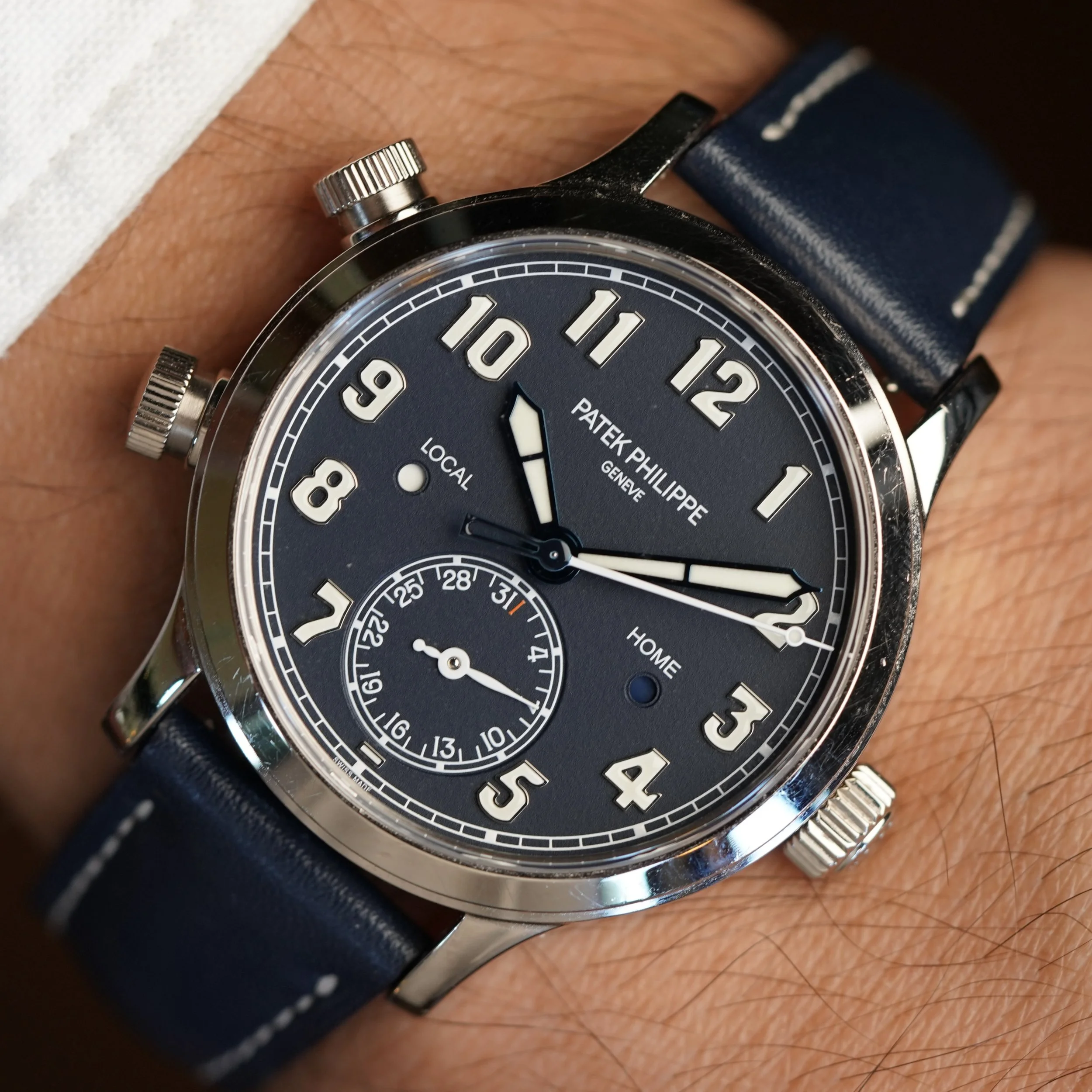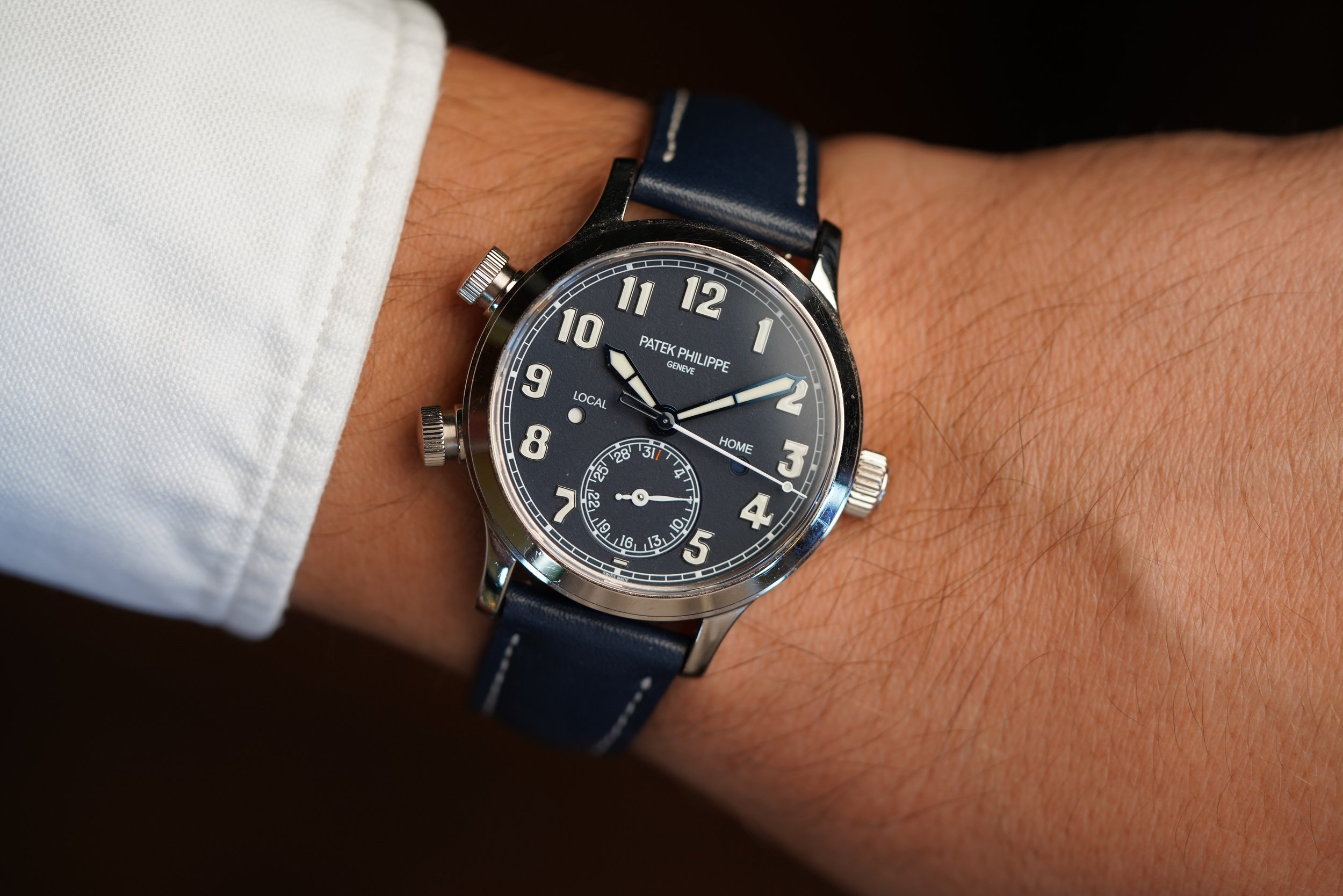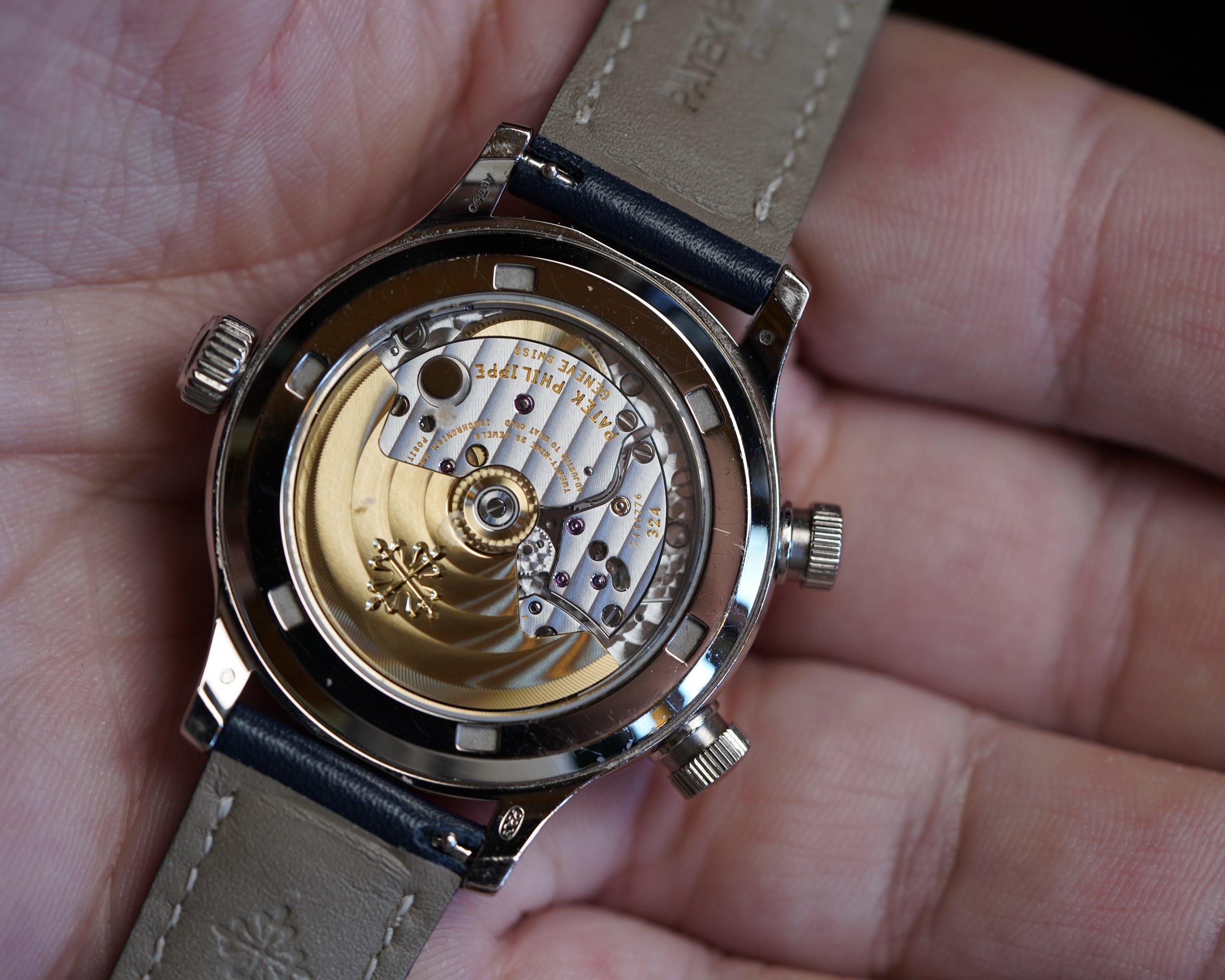 The watch is paired on a blue strap with the original Patek strap and buckle.