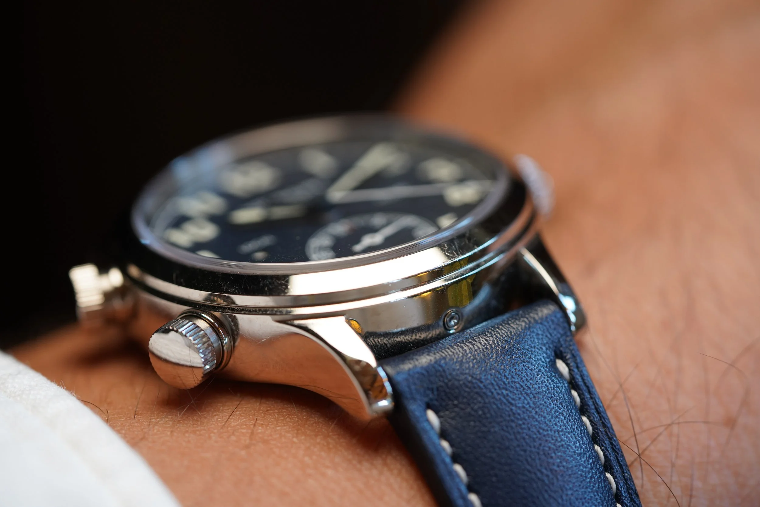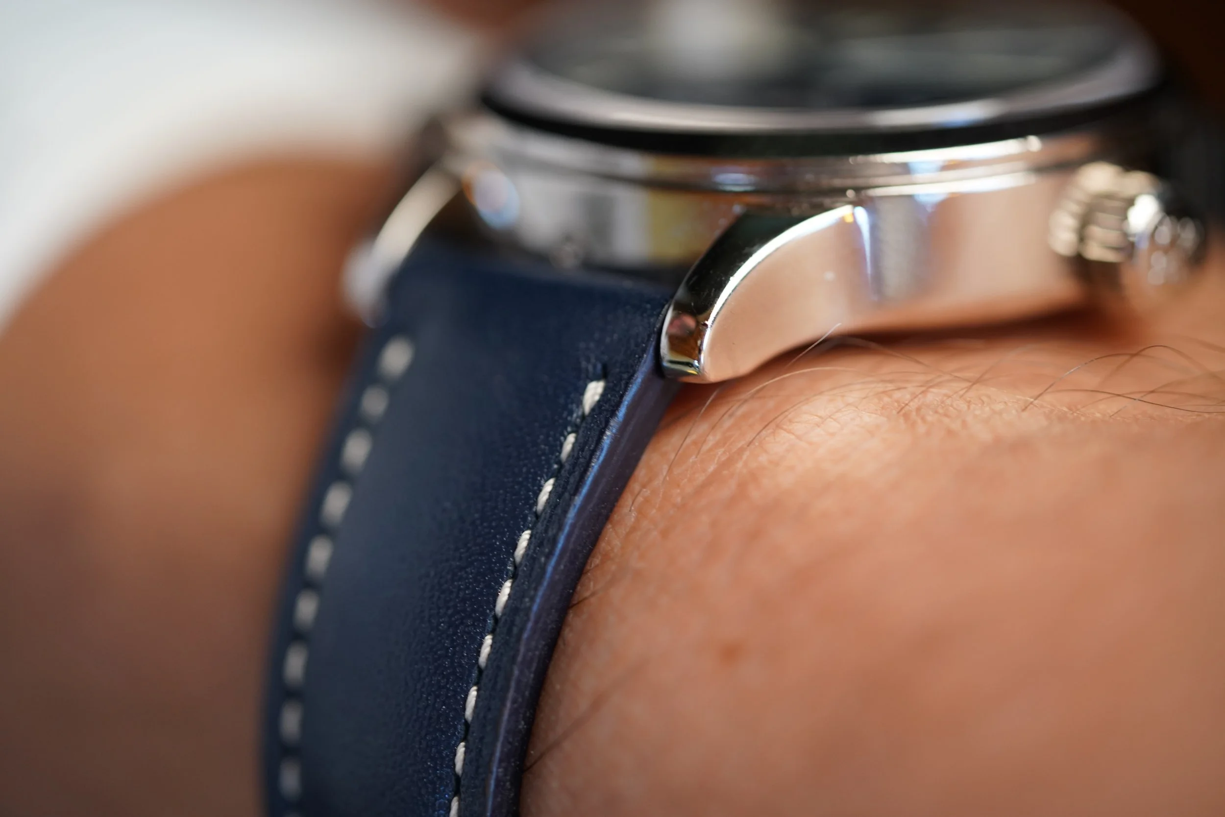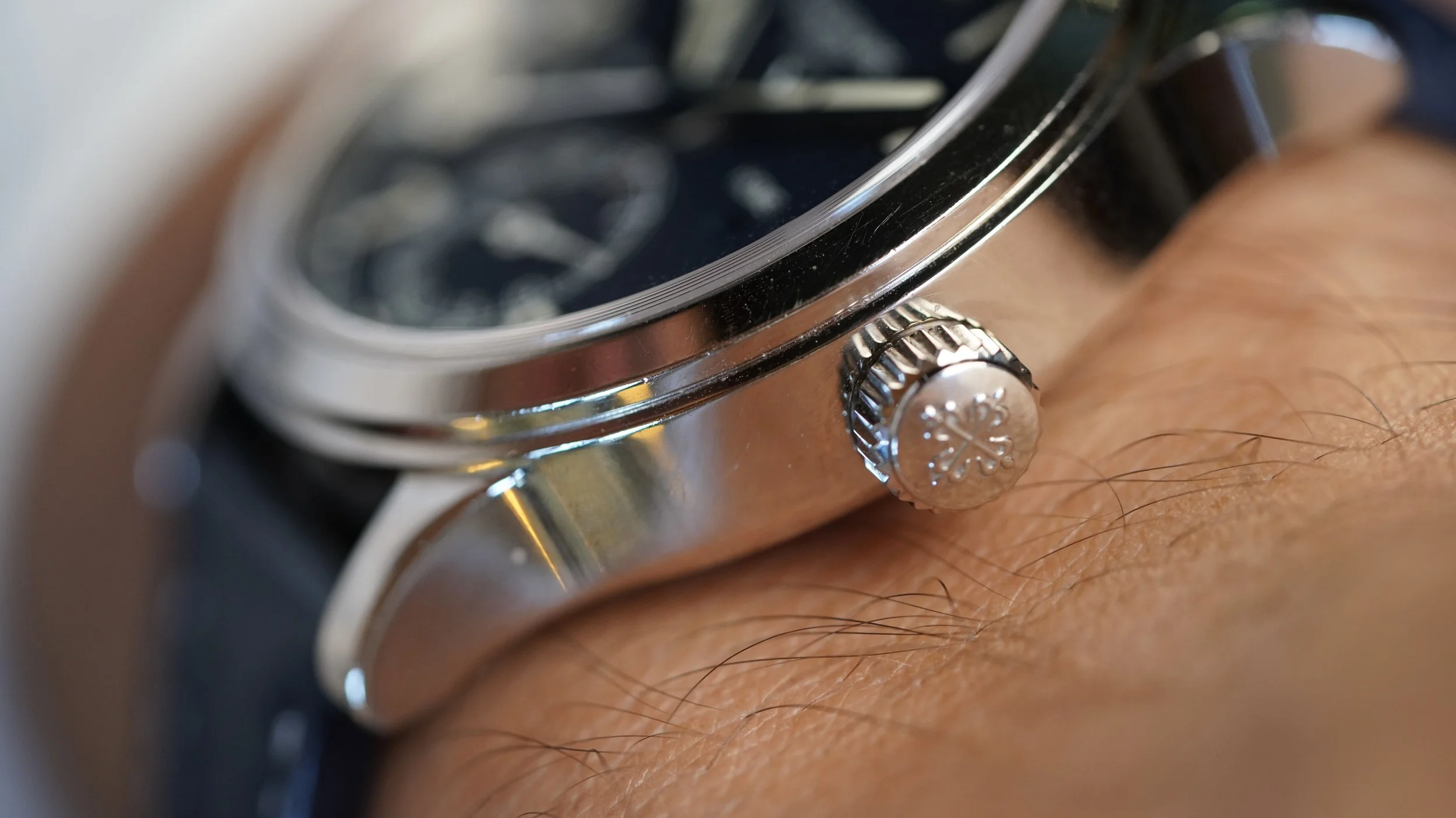 The watch is paired on a blue strap with the original Patek strap and buckle.