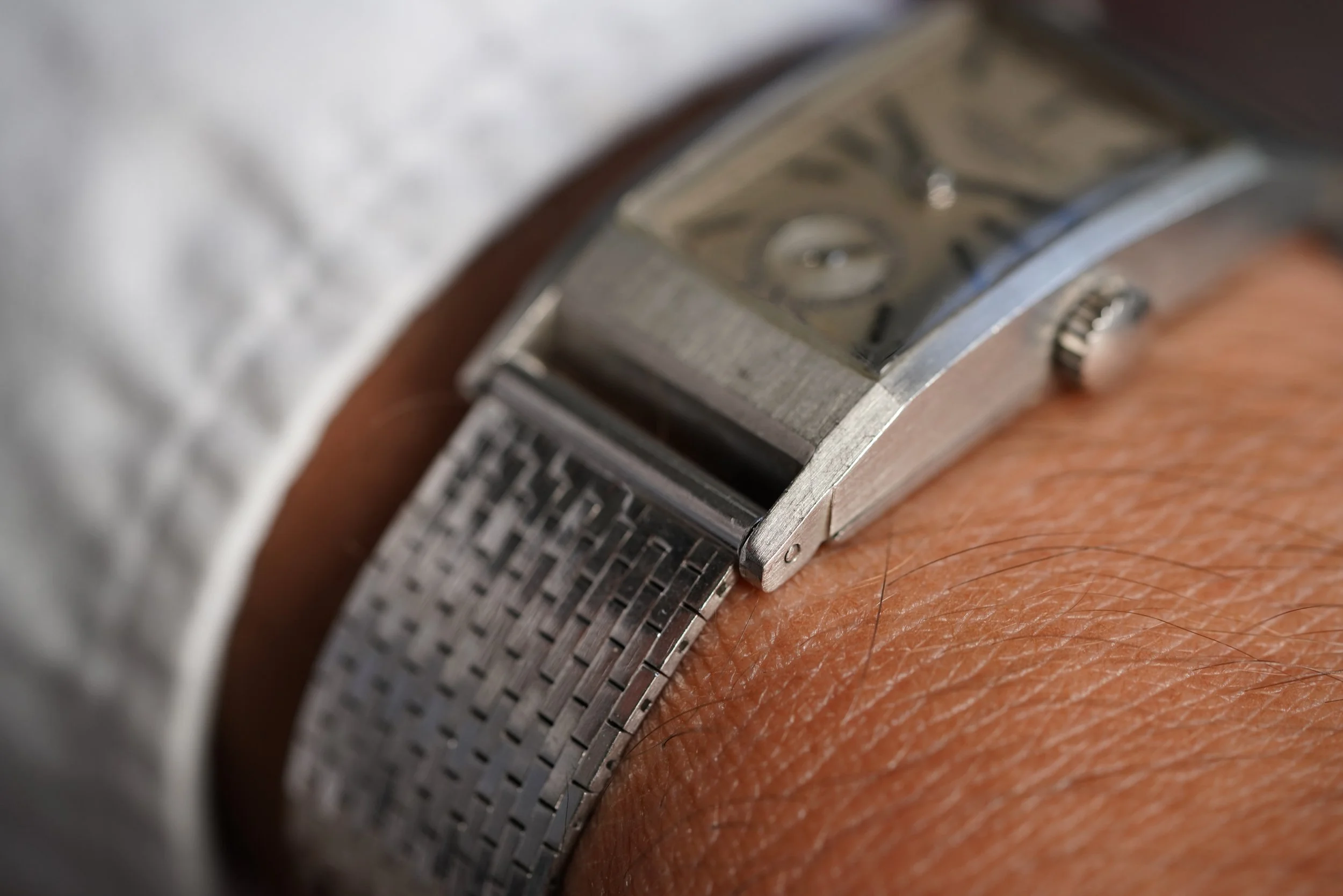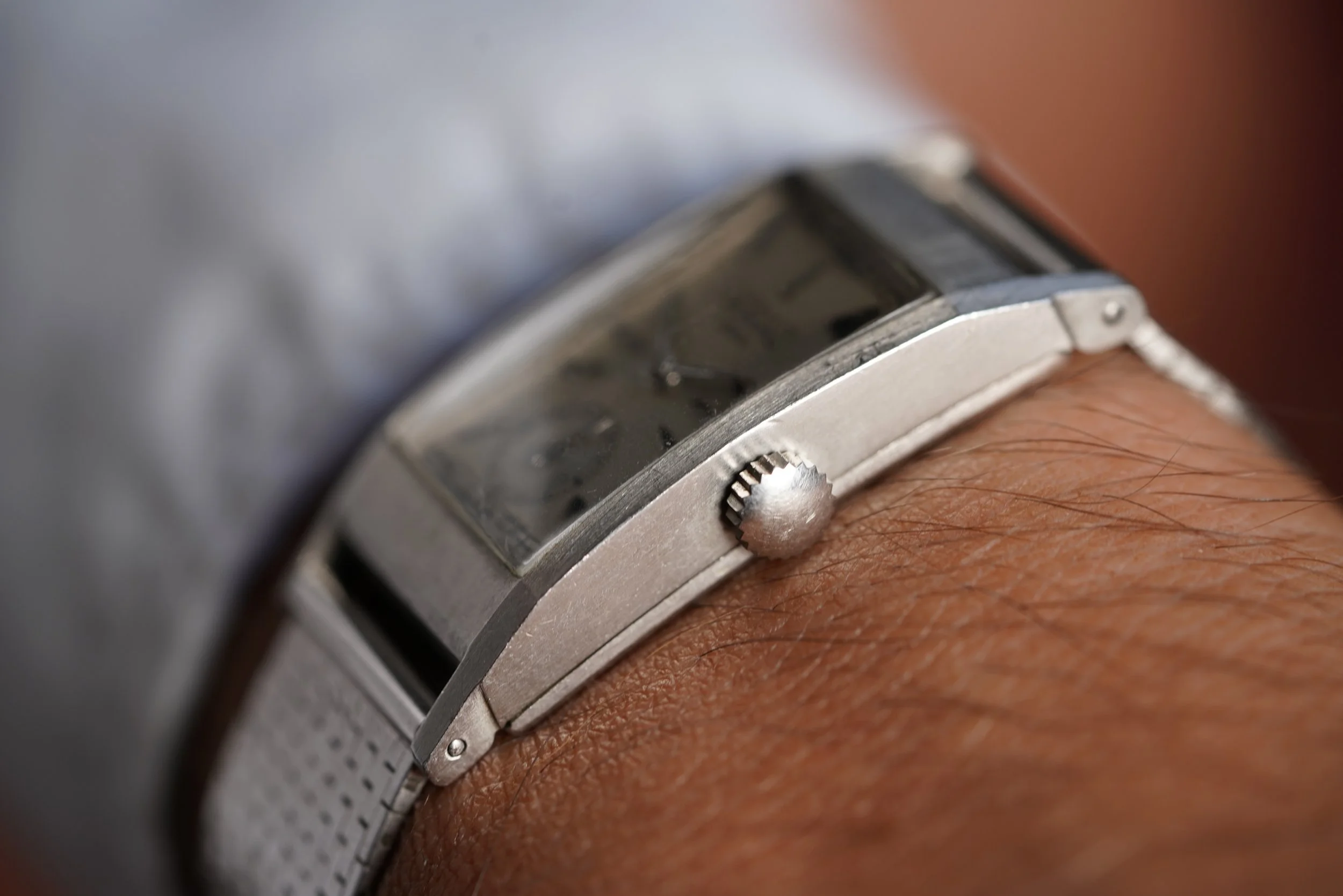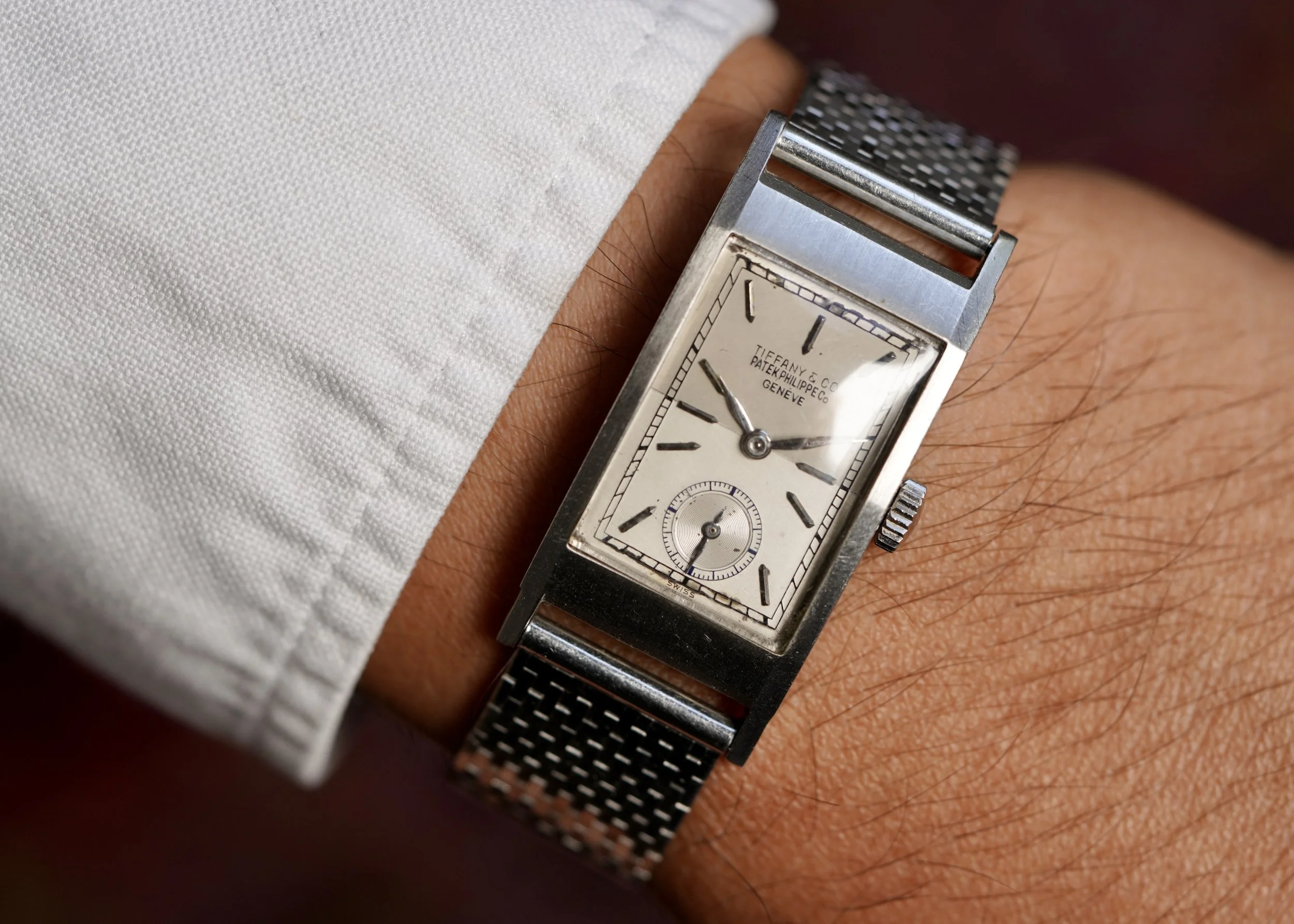 The movement is powered by the calibre 9’90, a historically important rectangular calibre from Patek Philippe developed in the 1930s that served the company in watches over the following decades.
