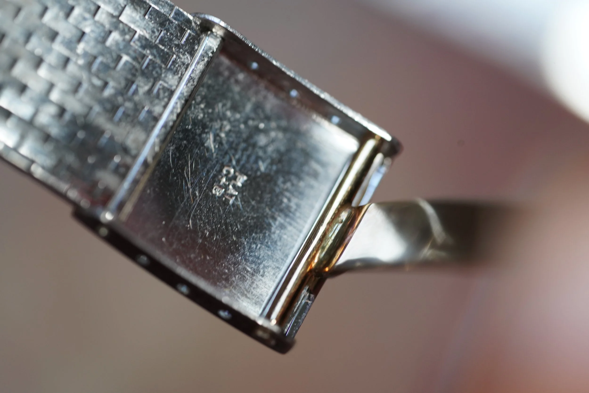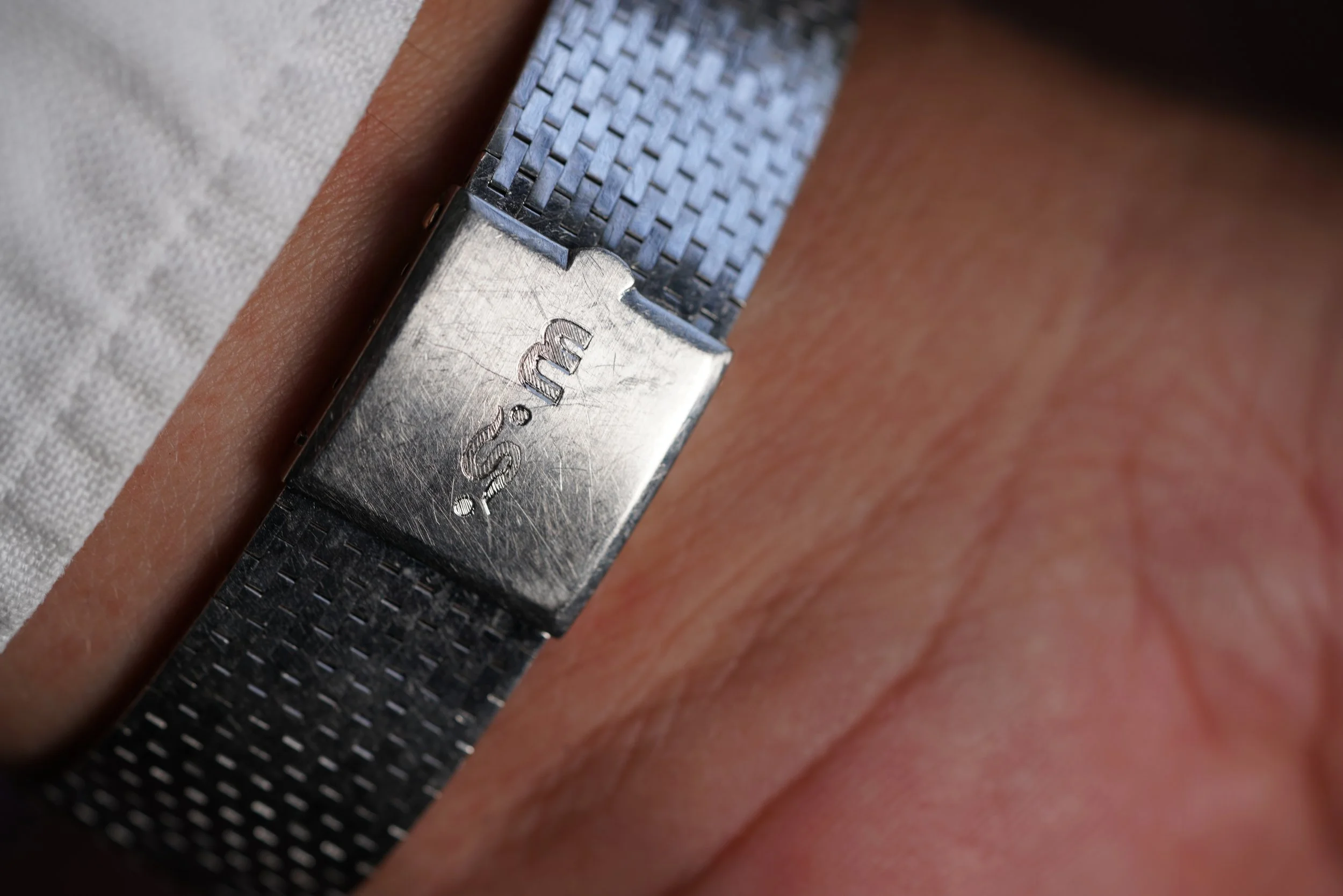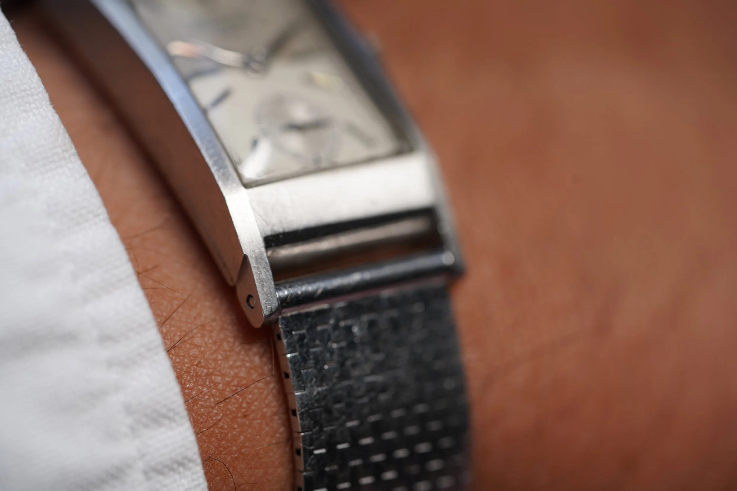 This Patek Philippe “Tegolino” reference 425 is a very special timepiece made of platinum. It measures 20mm in diameter by 43mm lug to lug. We believe the case is unpolished.