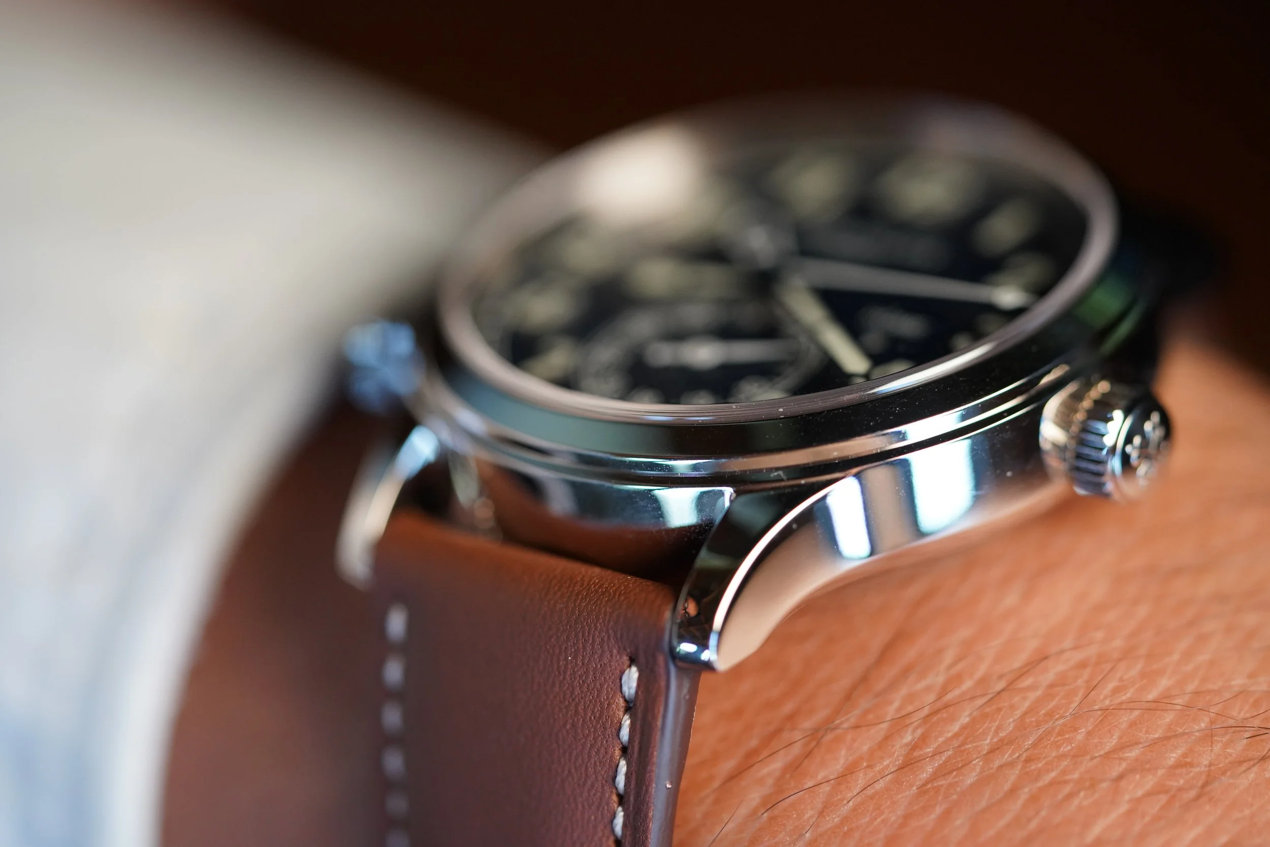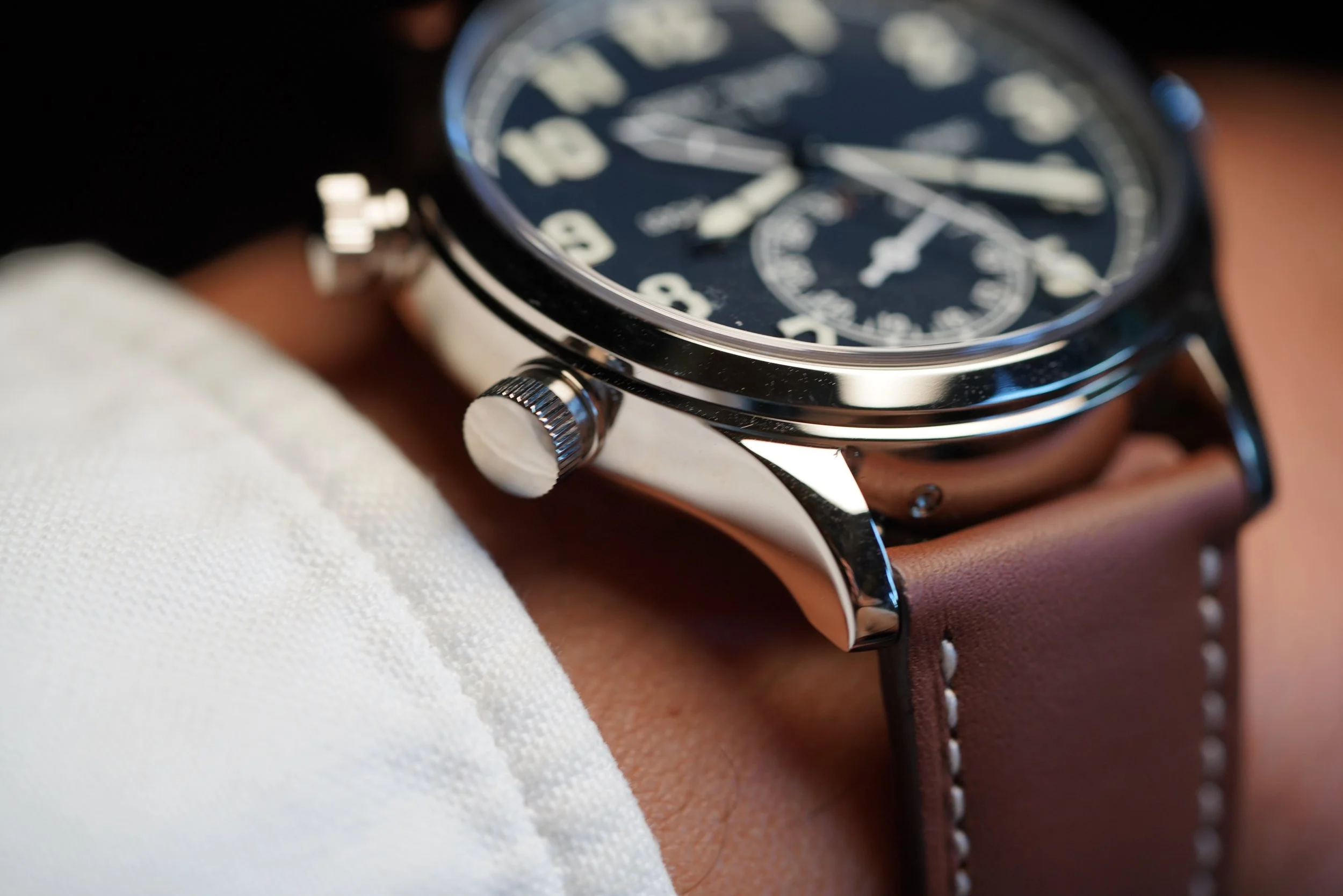 It does not come with box. It does come with the Certificate of Origin. The watch was sold in 2017. We do not know the service history of this watch, but it is running well.