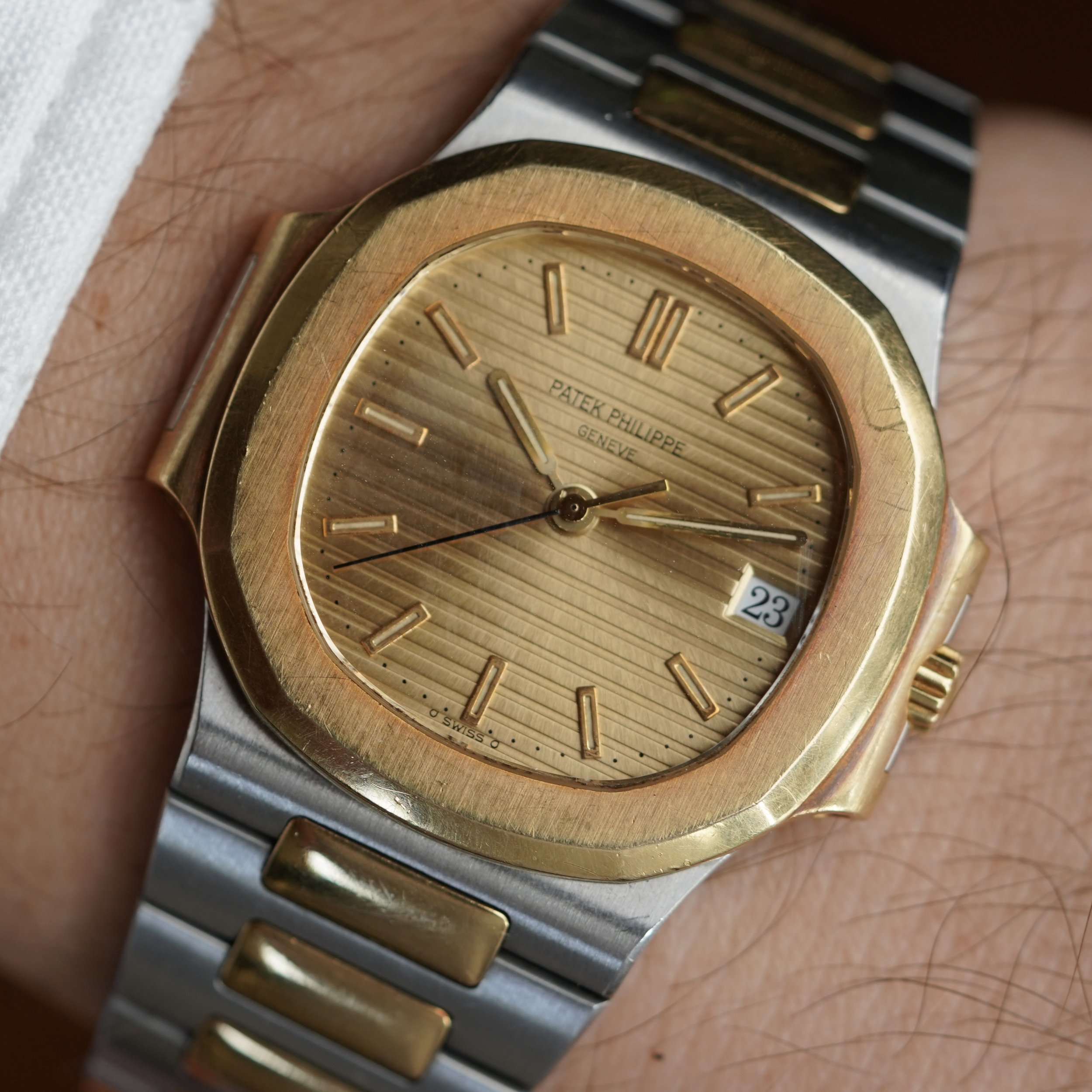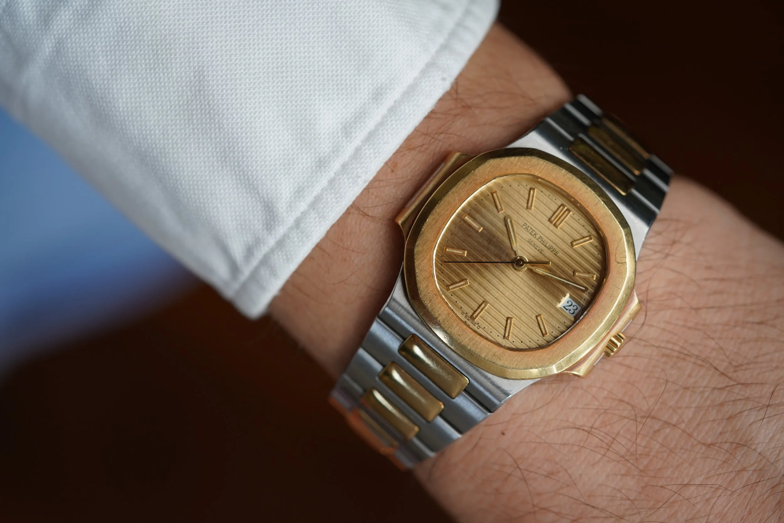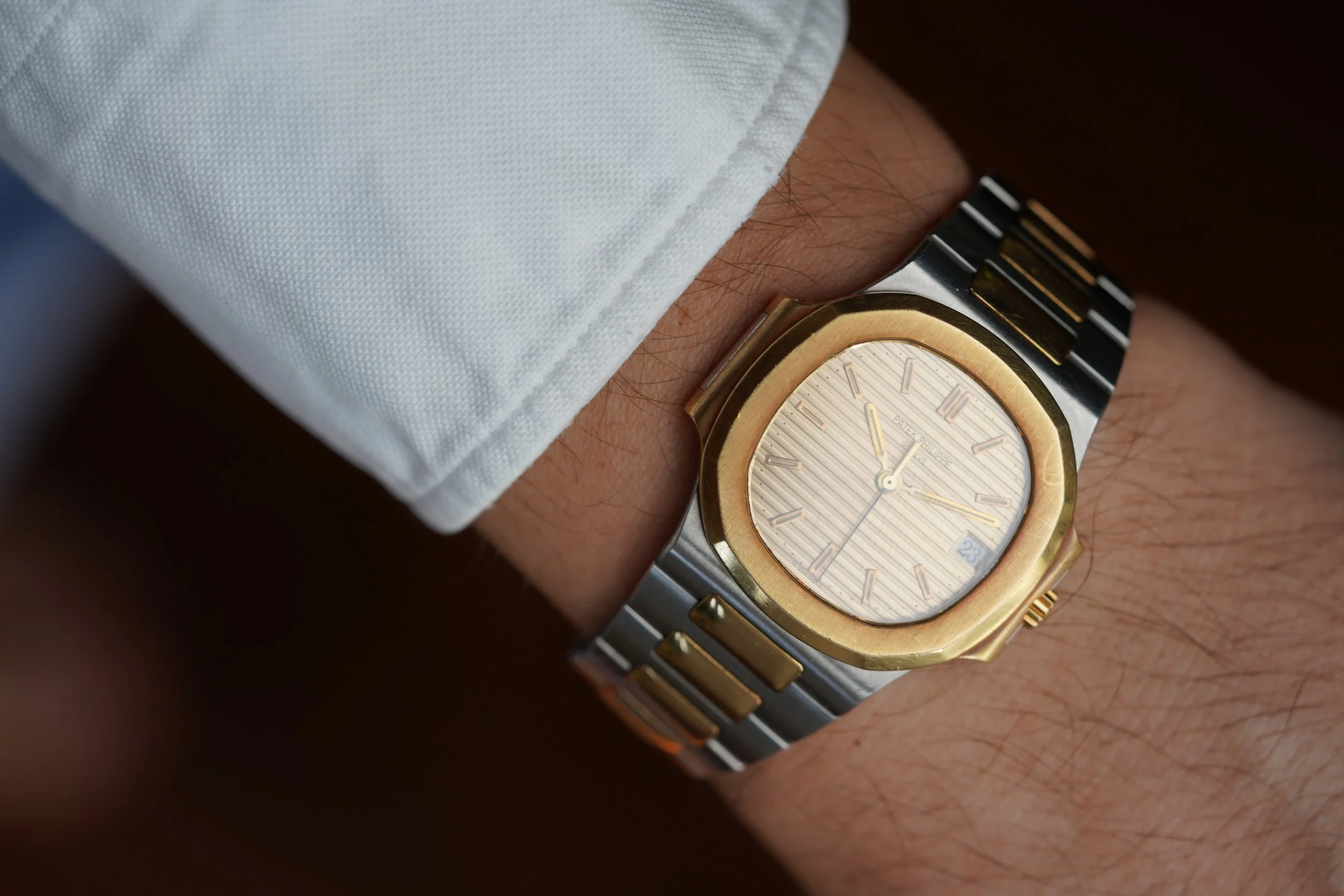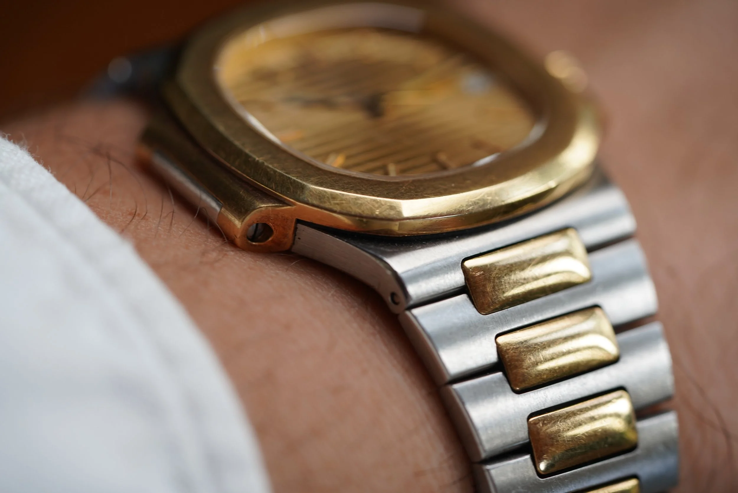 This Patek Philippe Nautilus is an outstanding vintage-sports watch in 18K yellow gold and stainless steel. The watch dates to 1996 and has been lightly polished. It measures 37mm in diameter. The dial is absolutely gorgeous, and features original lume in the hour markers and hands. It is powered by an automatic movement.