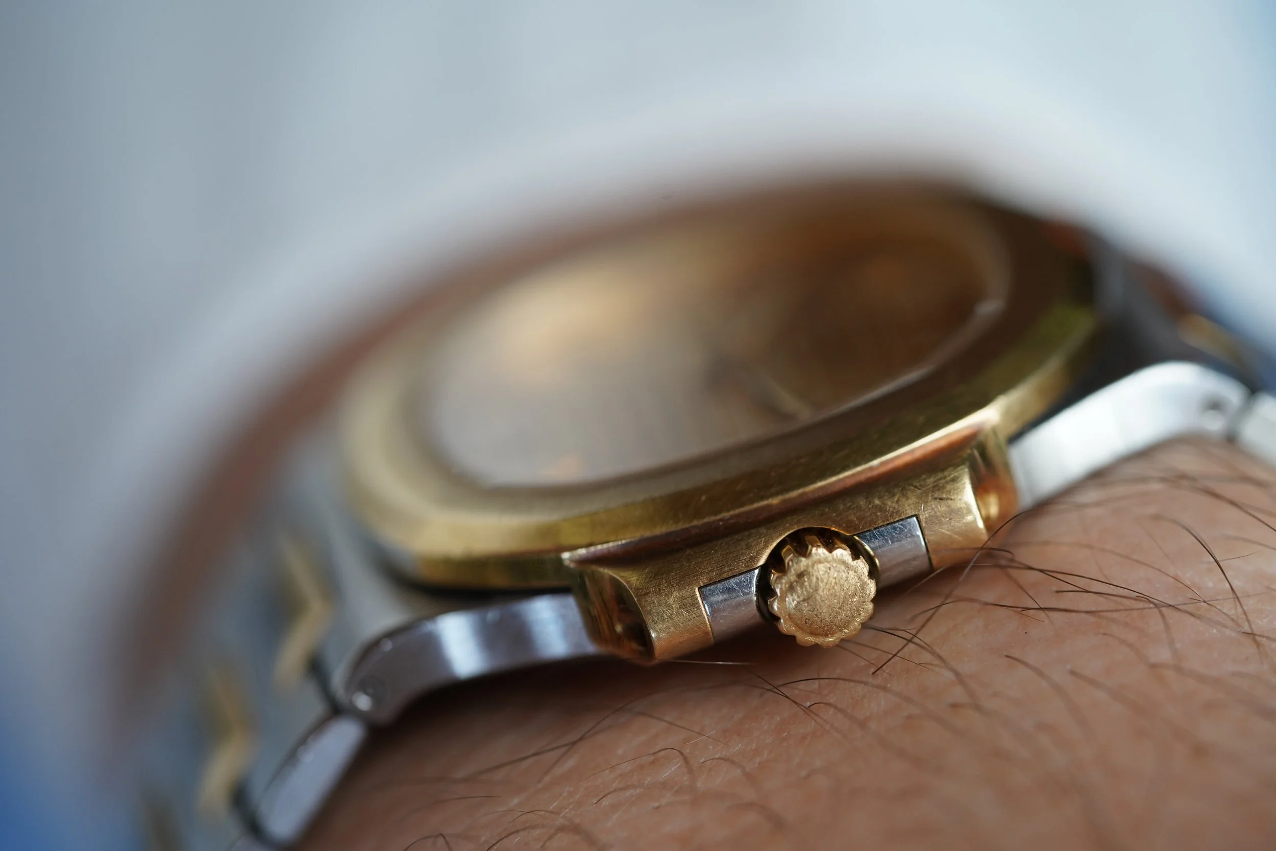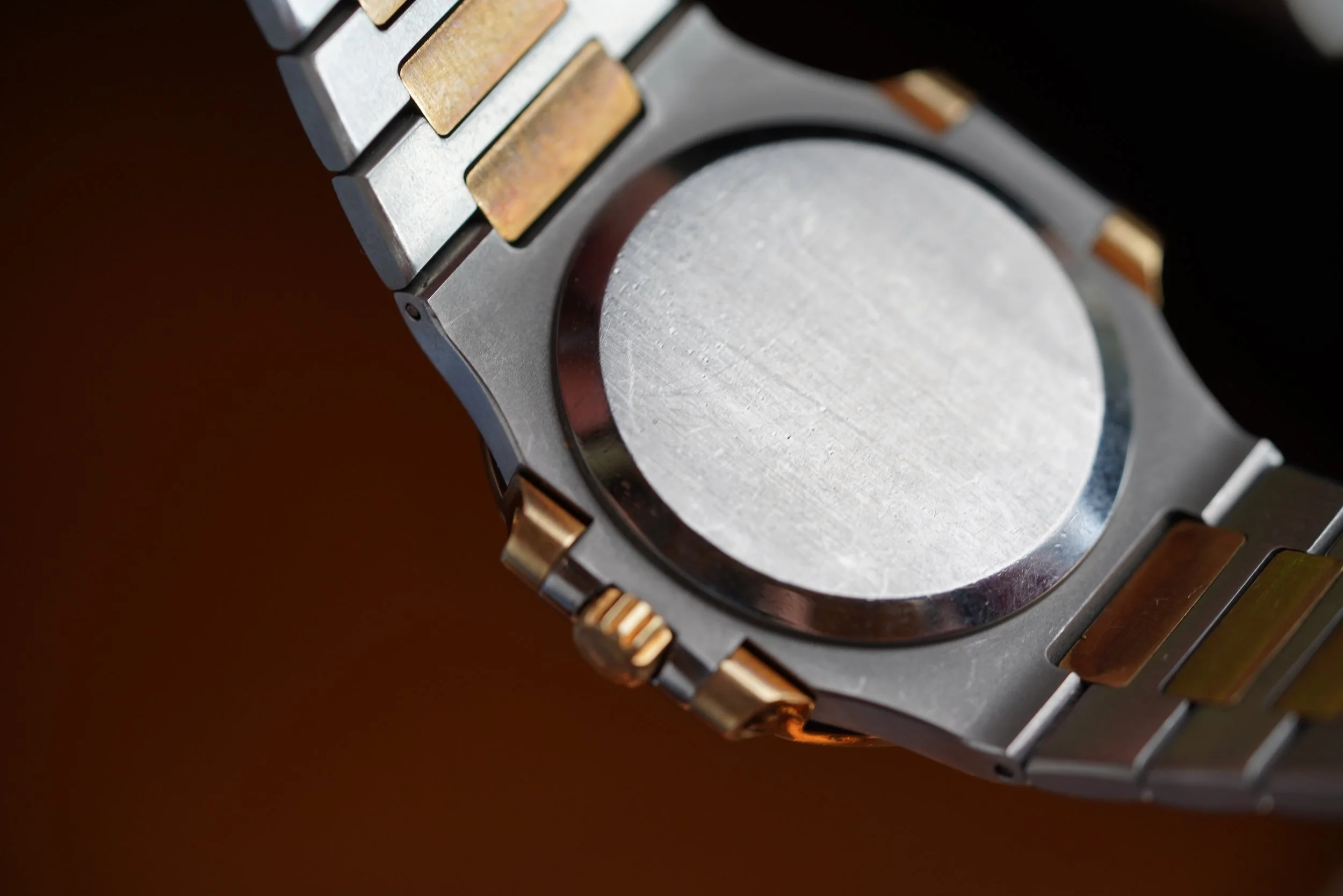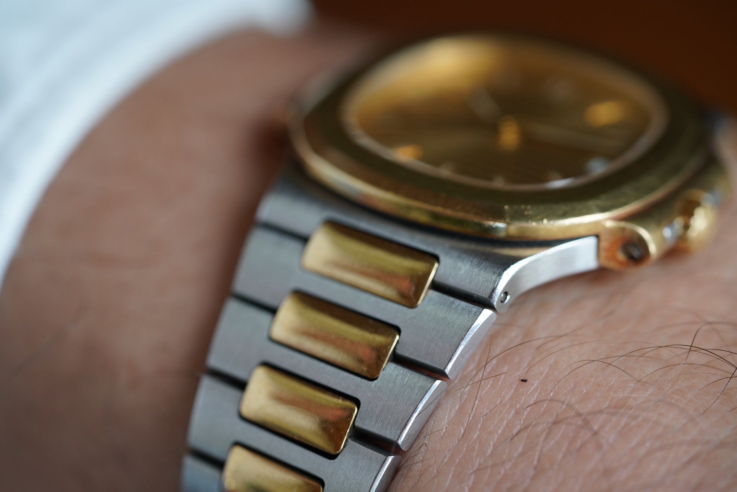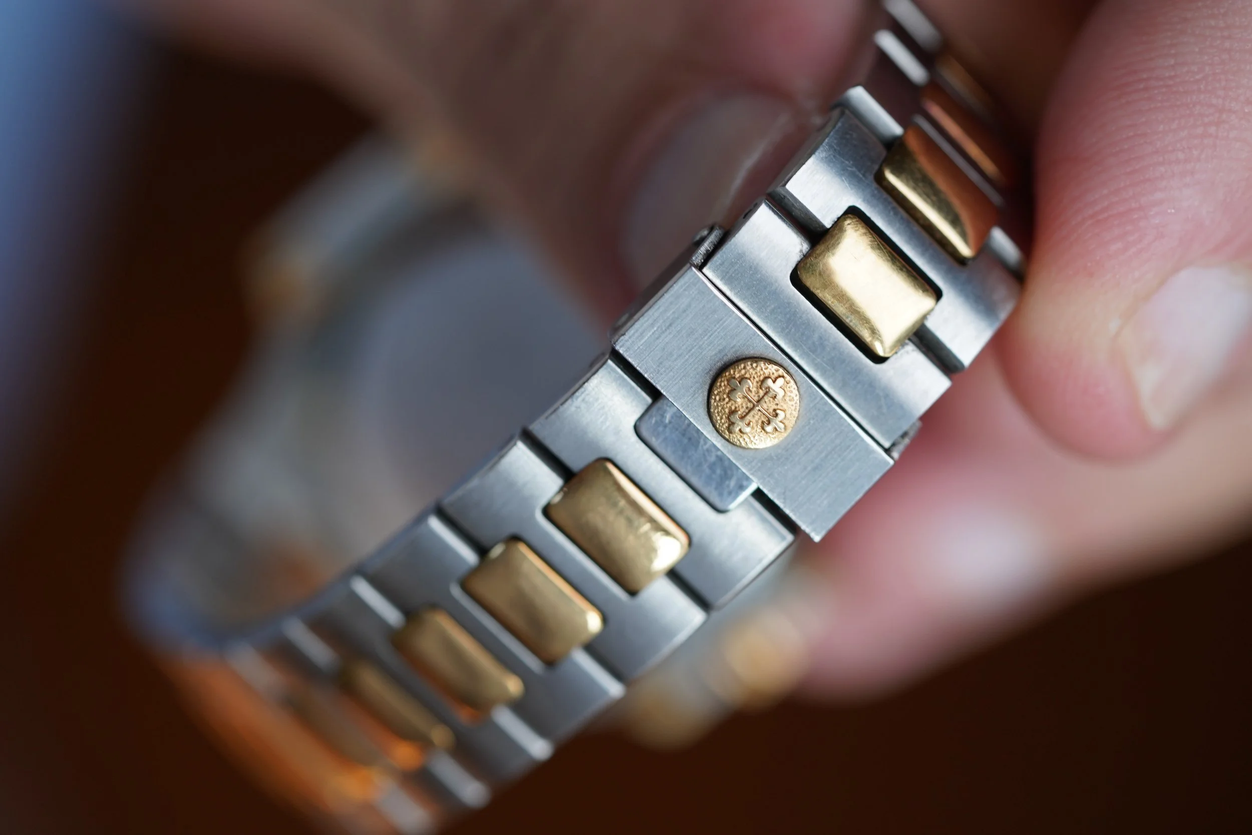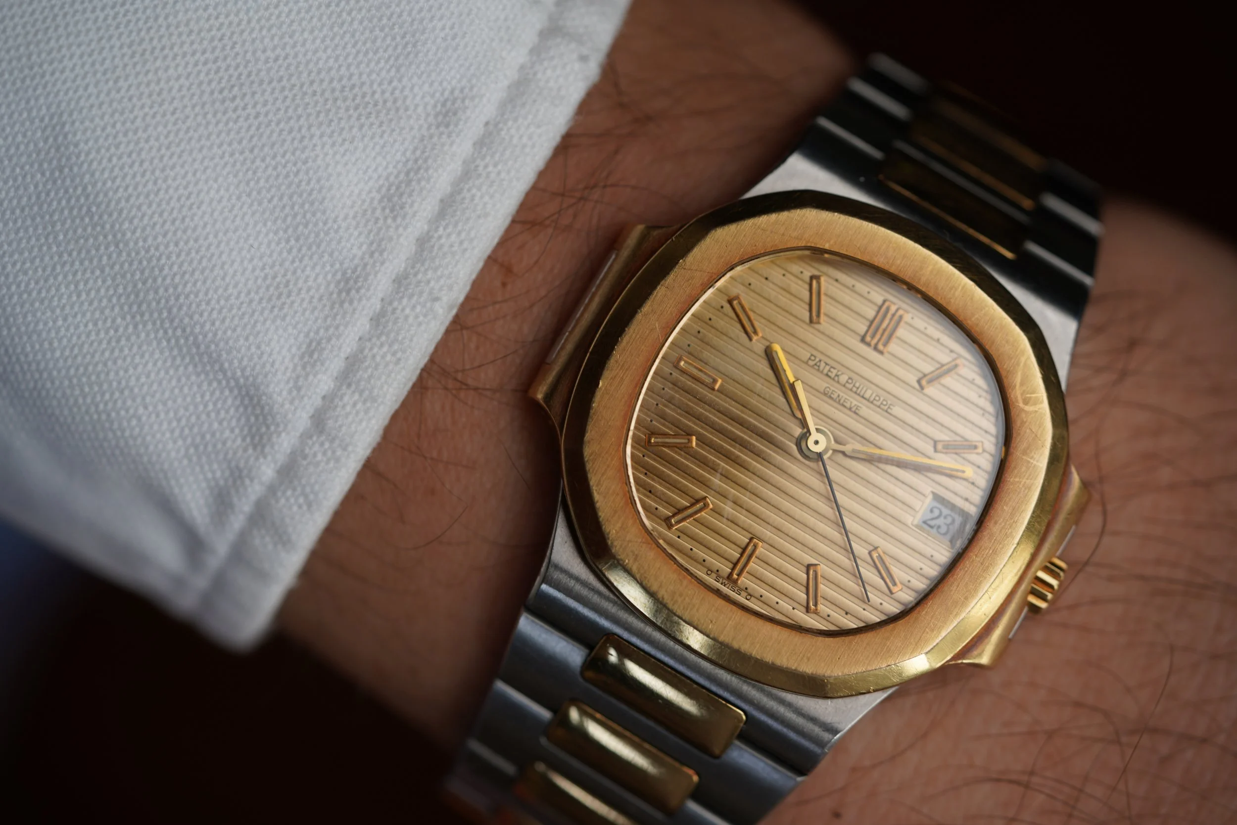 This Patek Philippe Nautilus is an outstanding vintage-sports watch in 18K yellow gold and stainless steel. The watch dates to 1996 and has been lightly polished. It measures 37mm in diameter. The dial is absolutely gorgeous, and features original lume in the hour markers and hands. It is powered by an automatic movement.