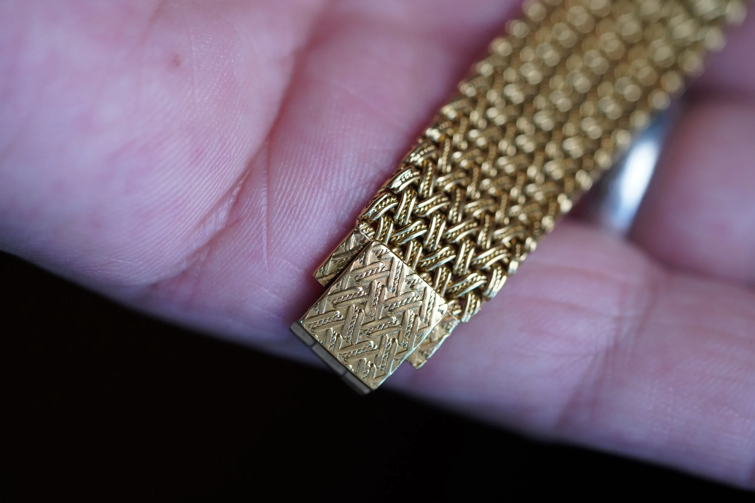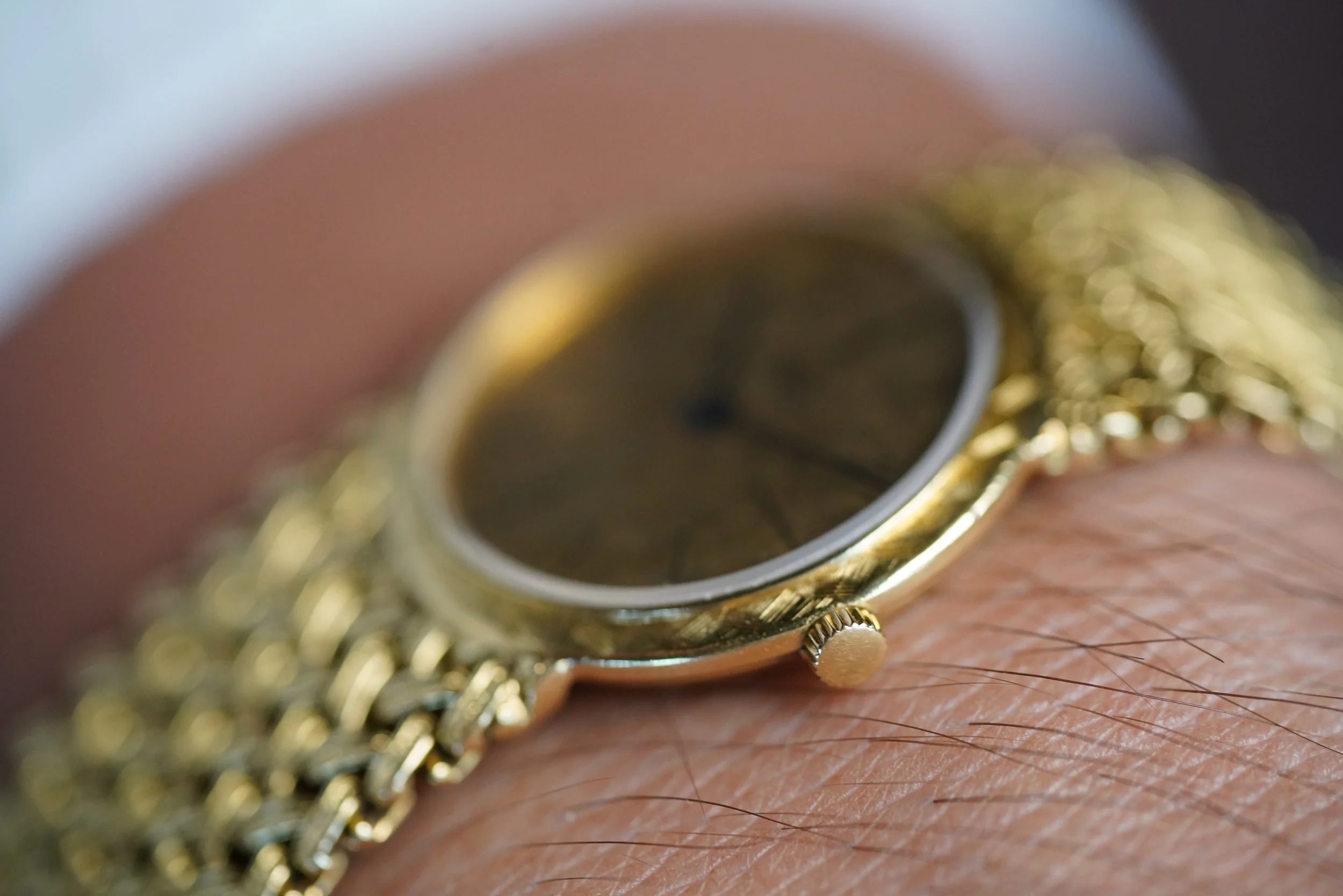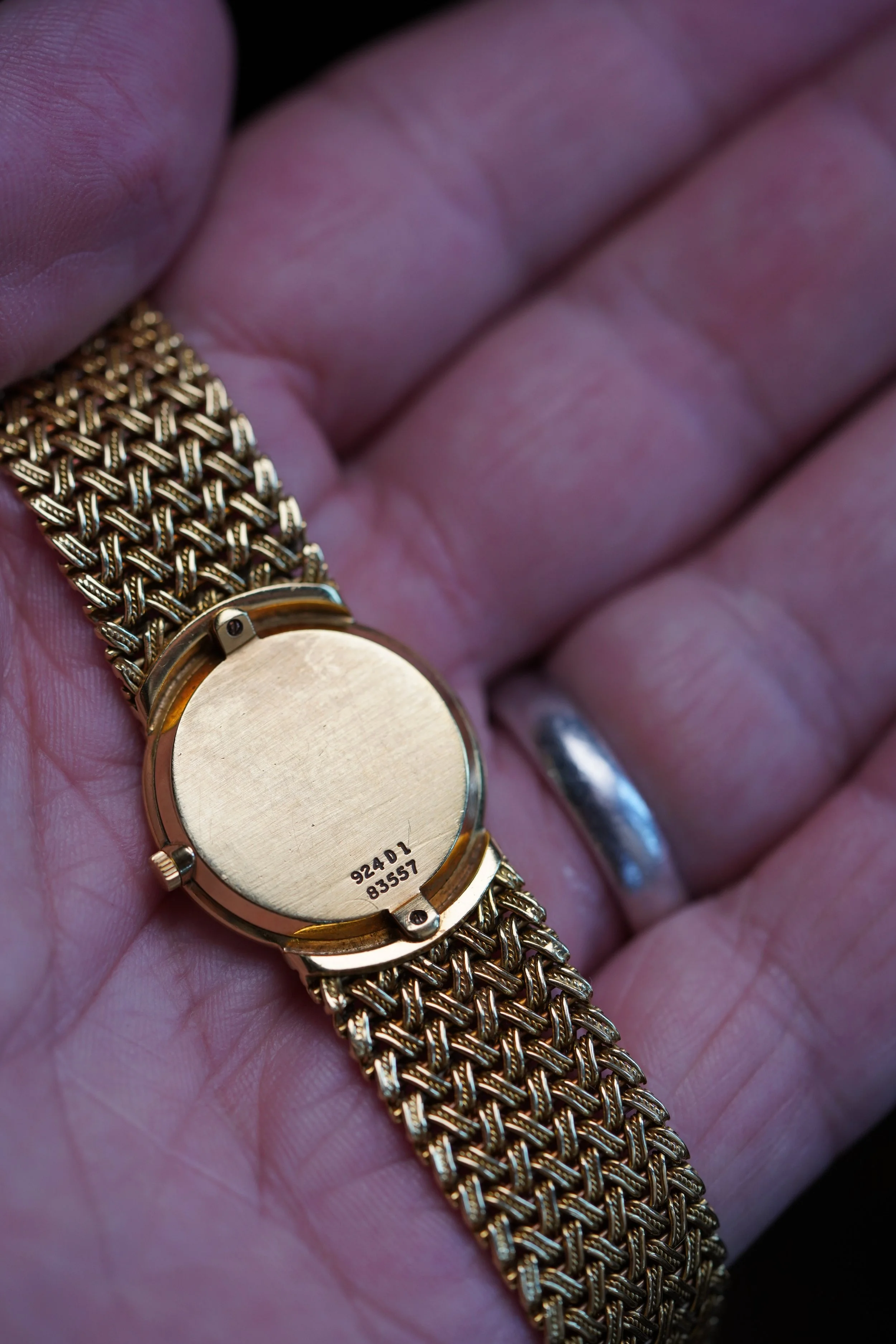 This Piaget reference 924D1 is a very sophisticated timepiece with a stunning dial. The case and bracelet is made of 18K yellow gold. It appears to be unpolished. The watch measures 24mm in diameter. The bracelet is in awesome condition and can fit a wrist as big as 7 inches.