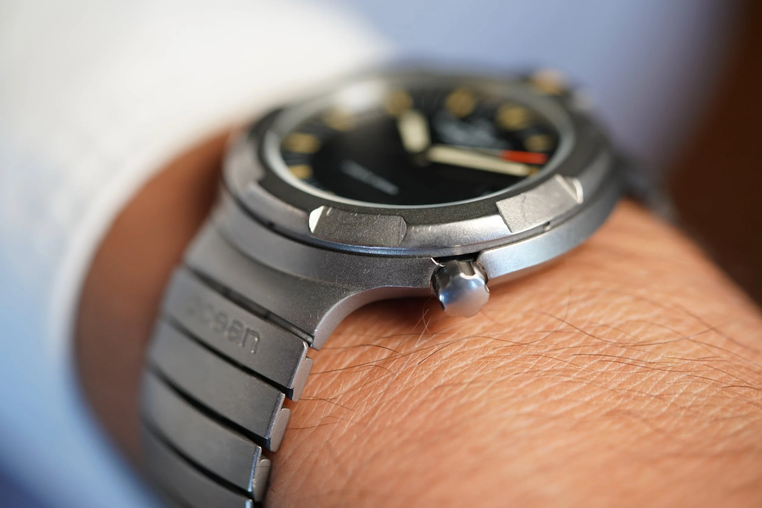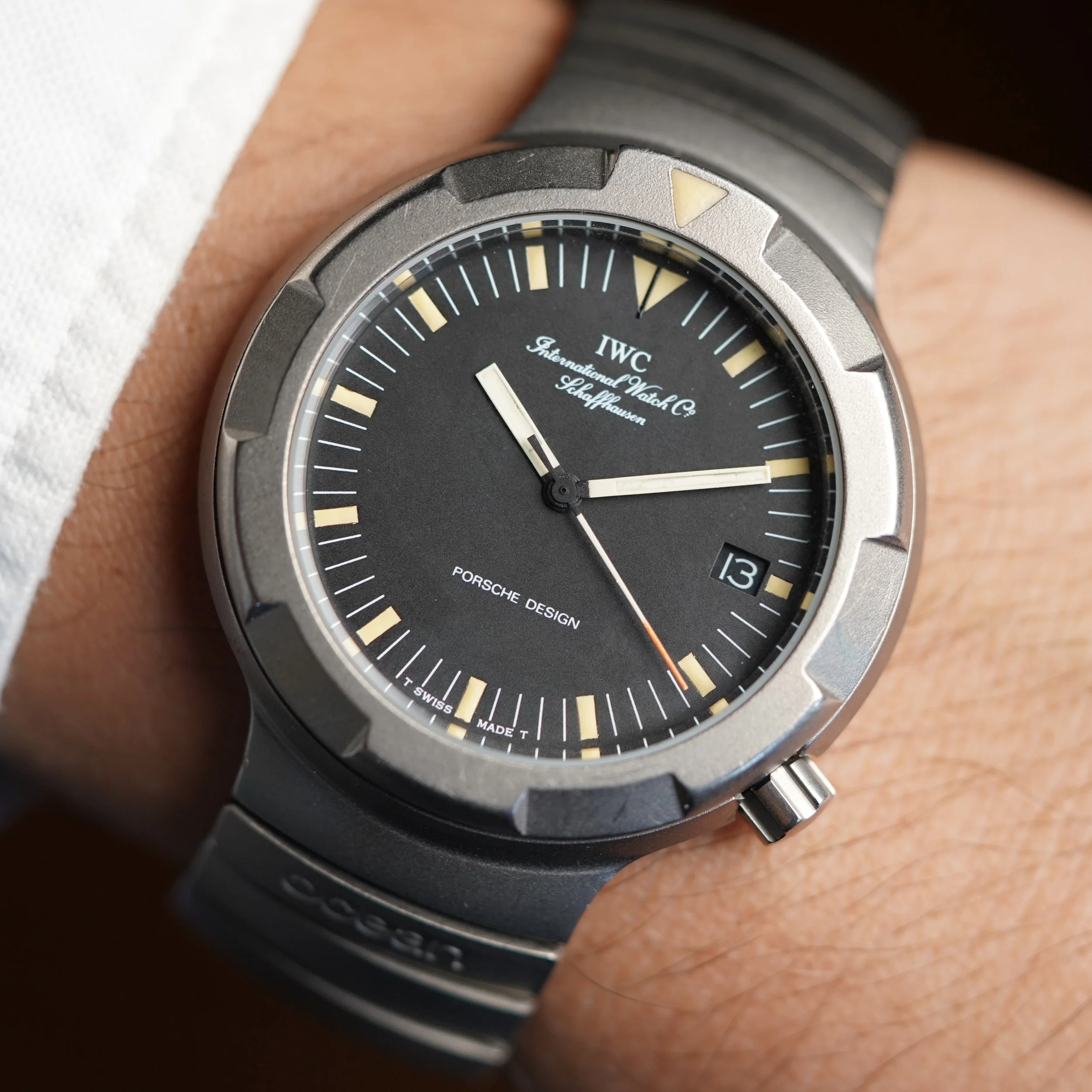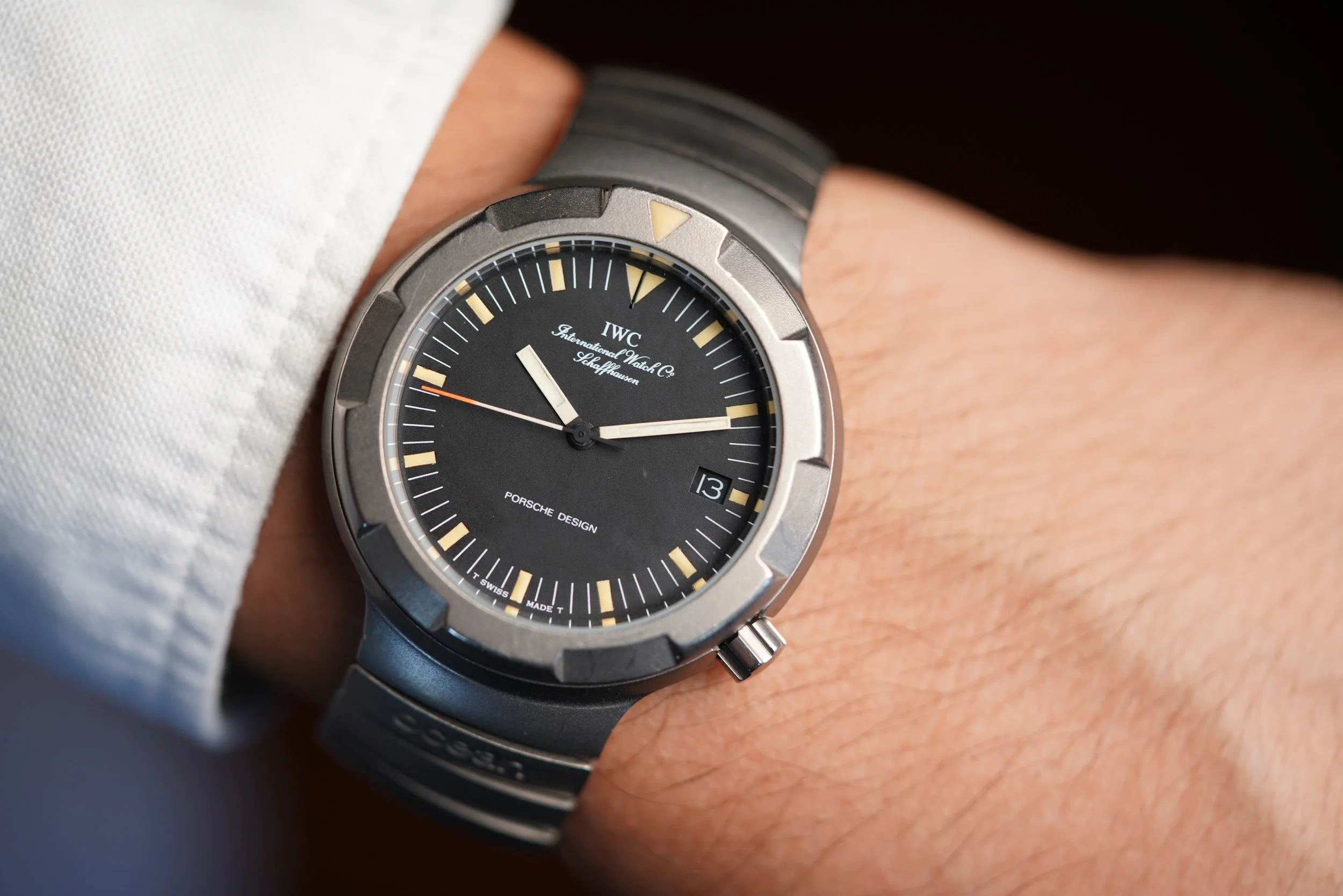 This IWC Porsche Design Compass is a cool sports watch in Titanium. The watch features an integrated bracelet and rotating bezel with a crown at 4 o’clock. The case measures approximately 40mm in diameter and is approximately 11mm thick. It appears to be unpolished.