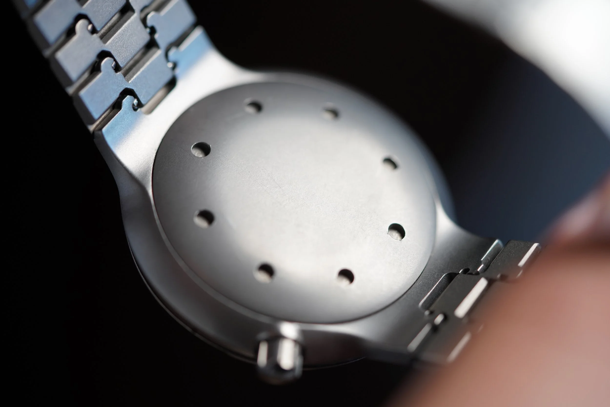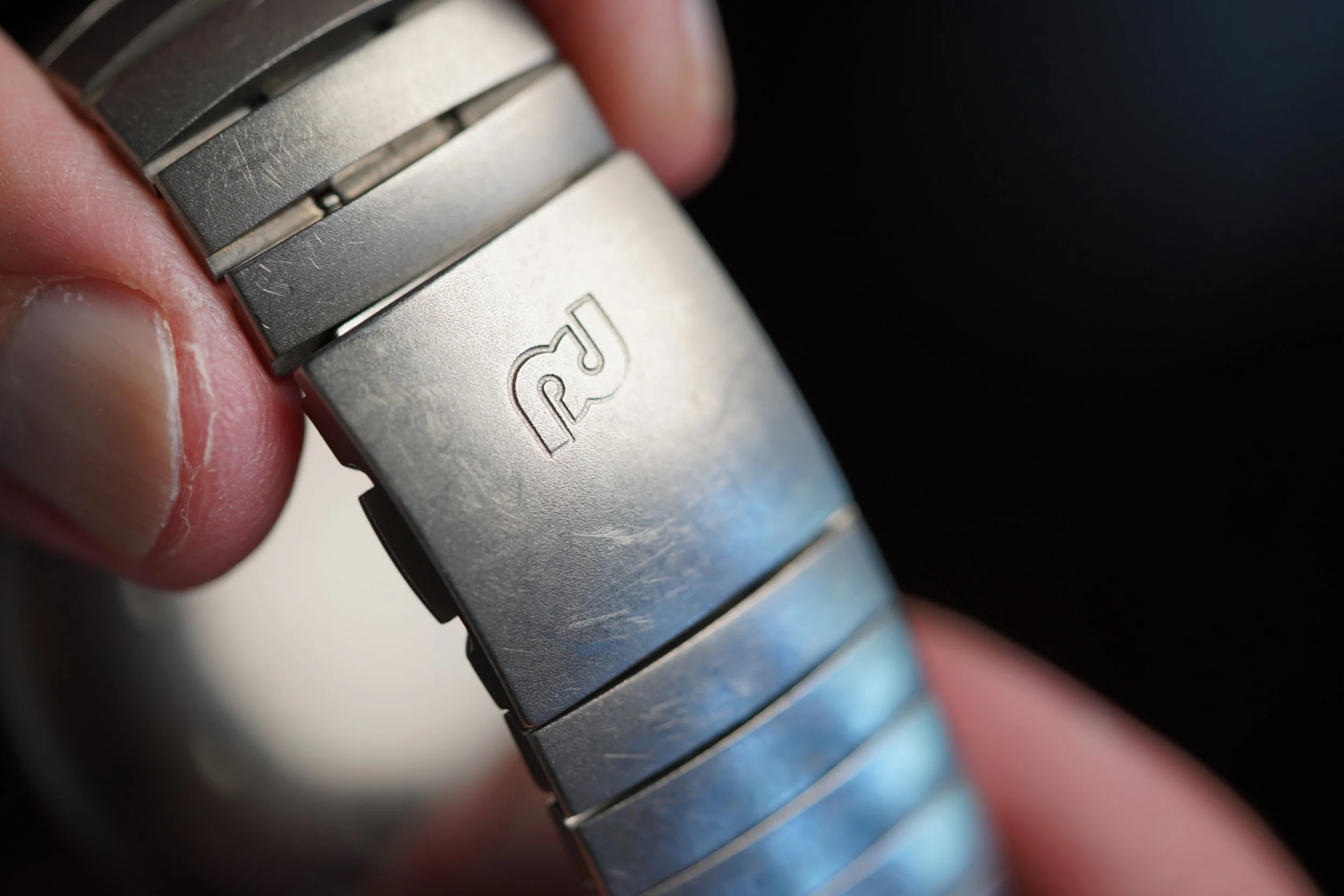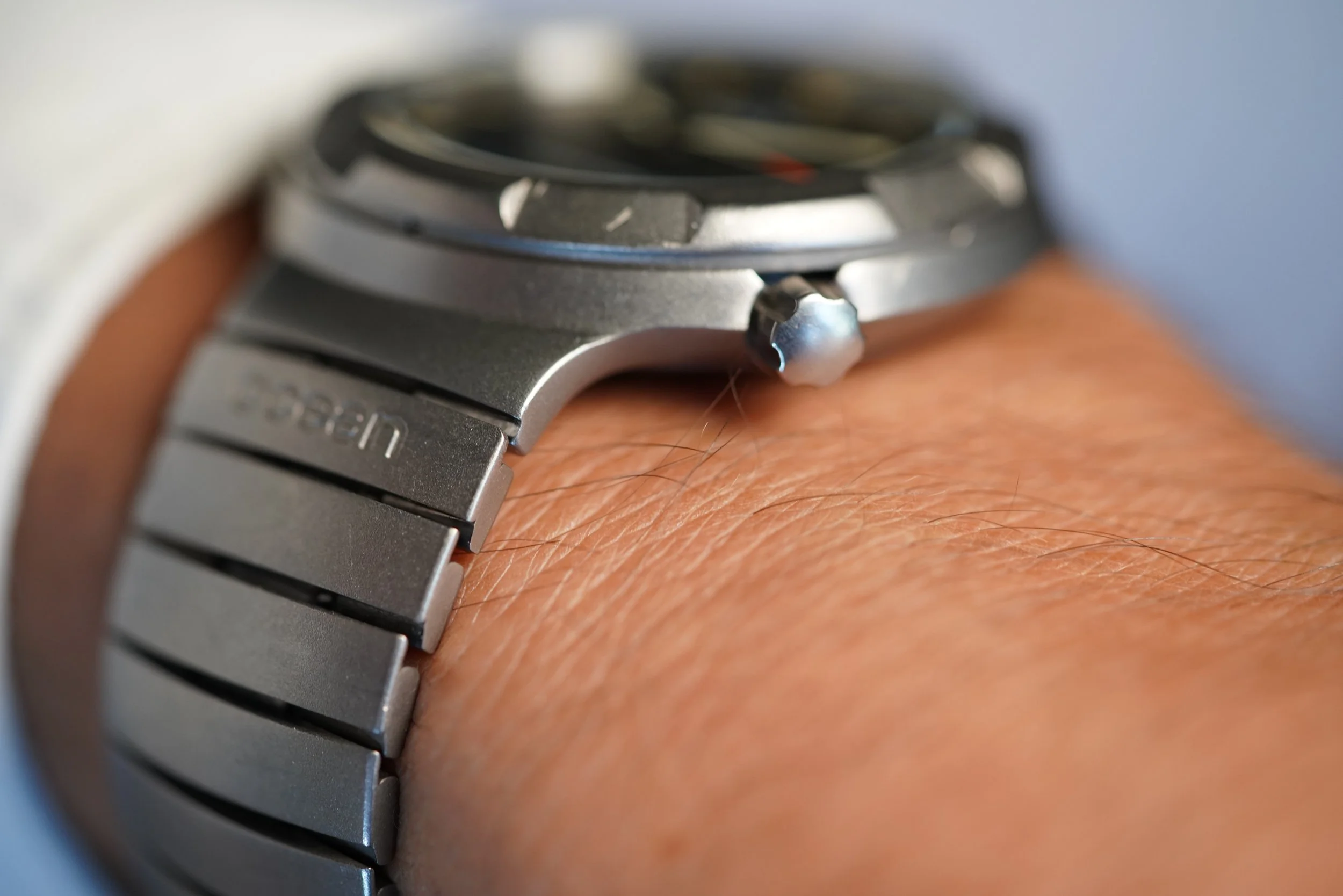 This IWC Porsche Design Compass is a cool sports watch in Titanium. The watch features an integrated bracelet and rotating bezel with a crown at 4 o’clock. The case measures approximately 40mm in diameter and is approximately 11mm thick. It appears to be unpolished.
