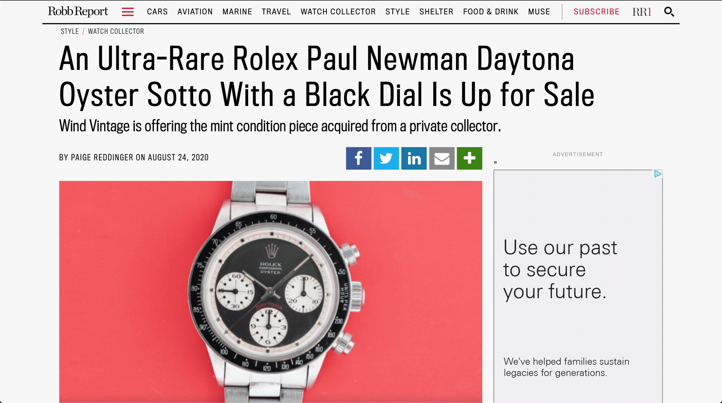 Paige Reddinger of Robb Report featured Wind Vintage’s Ultra-Rare 'Paul Newman' Daytona reference 6263 'RCO' 'Oyster Sotto' for sale.