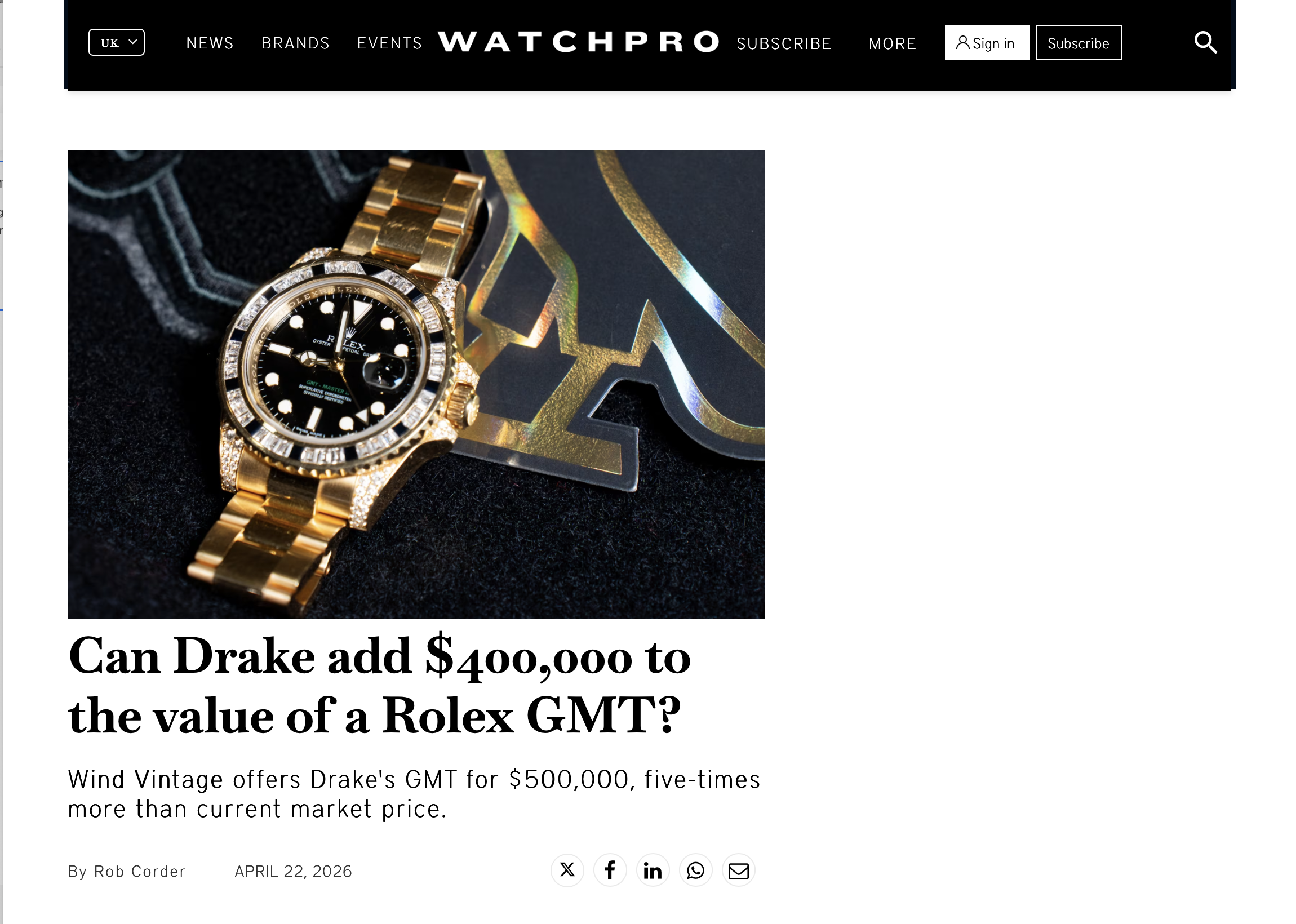 Rob Corder of WatchPro recently wrote ‘Can Drake add $400,000 to the value of a Rolex GMT?’.