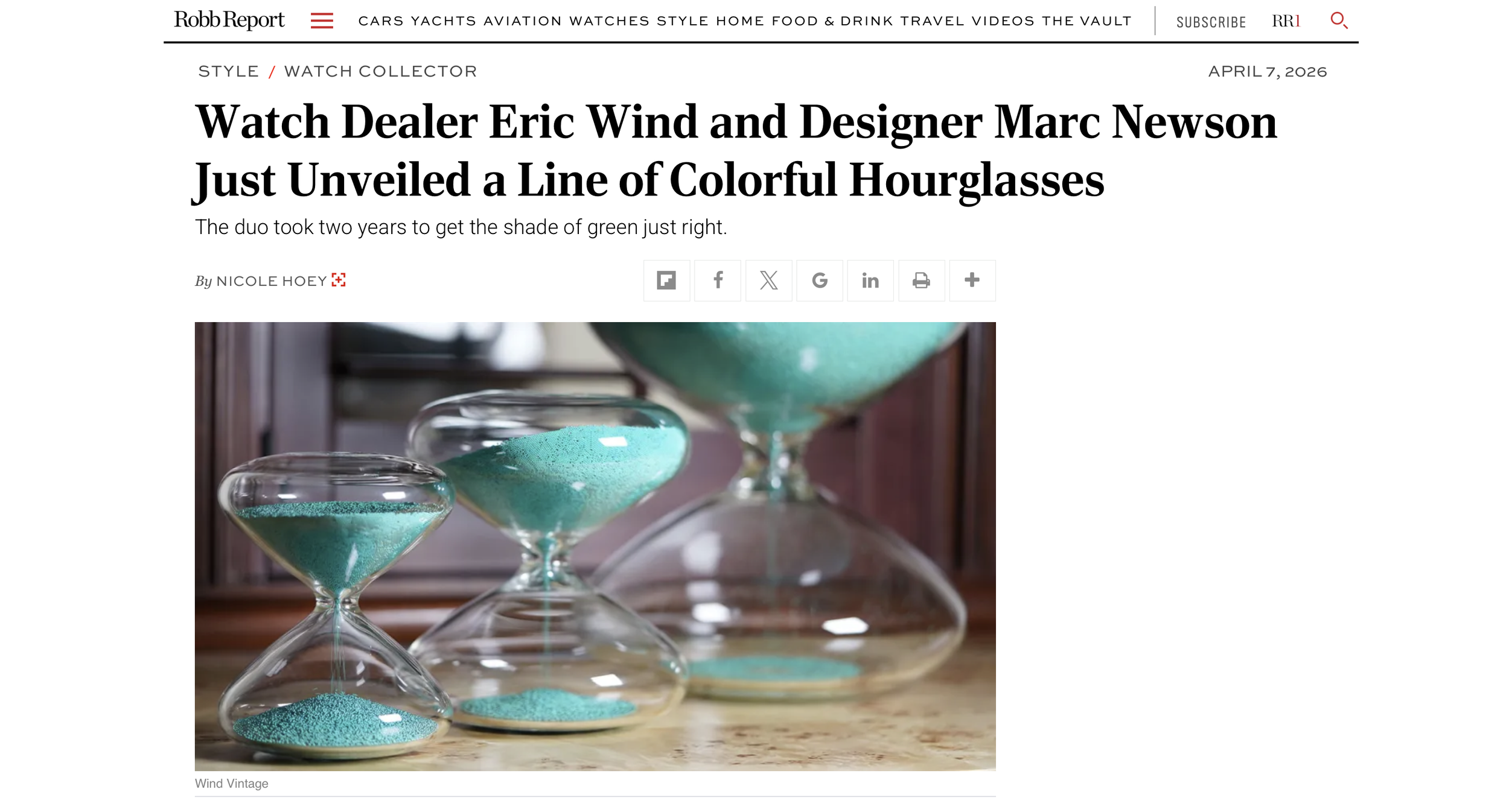 Nicole Hoey recently wrote for Robb Report ‘Eric Wind and Designer Marc Newson Just Unveiled a Line of Colorful Hourglasses’