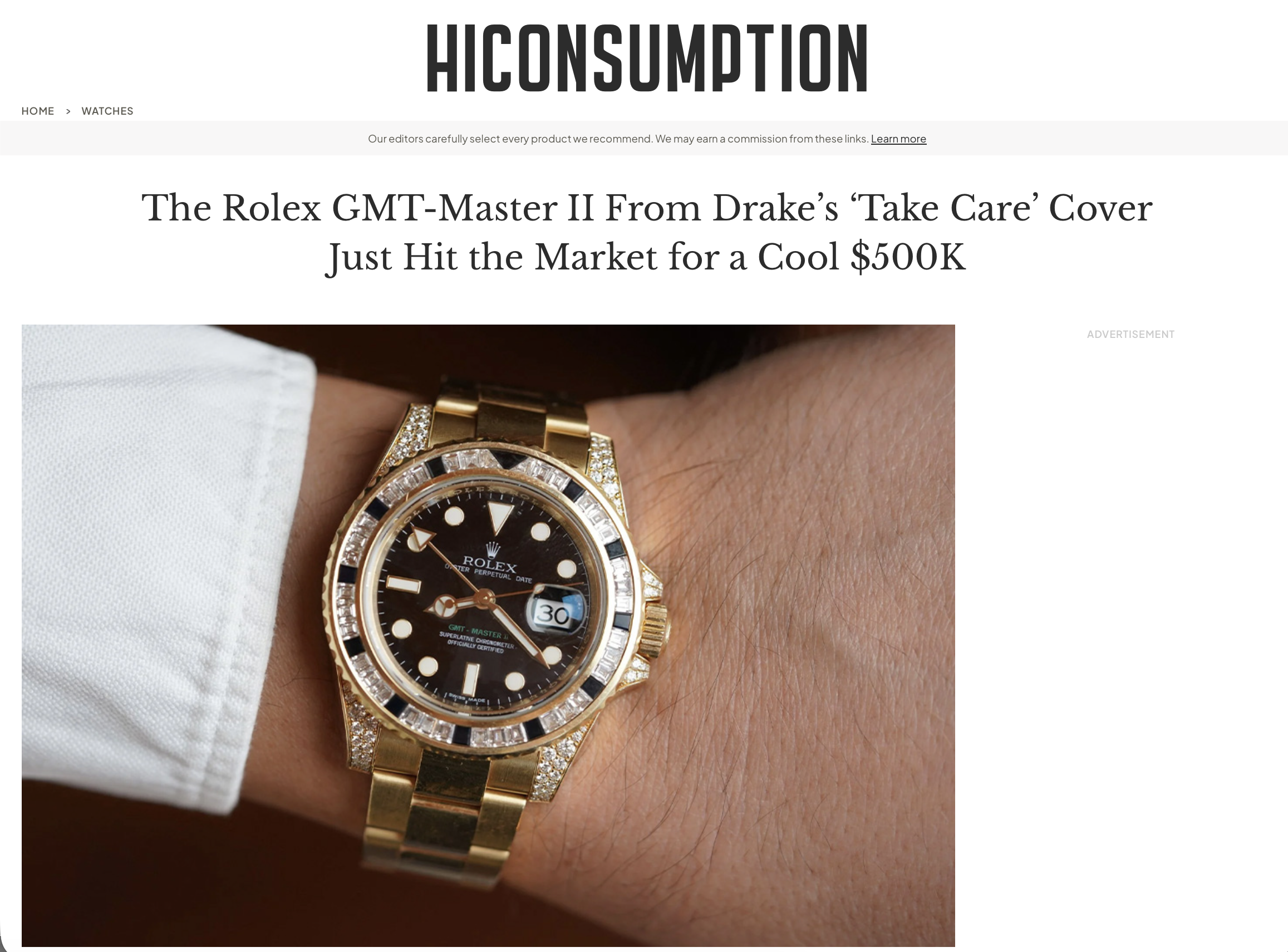 Ian Rebello recently wrote for HiConsumption ‘The Rolex GMT-Master II From Drake’s ‘Take Care’ Cover Just Hit the Market for a Cool $500K’.
