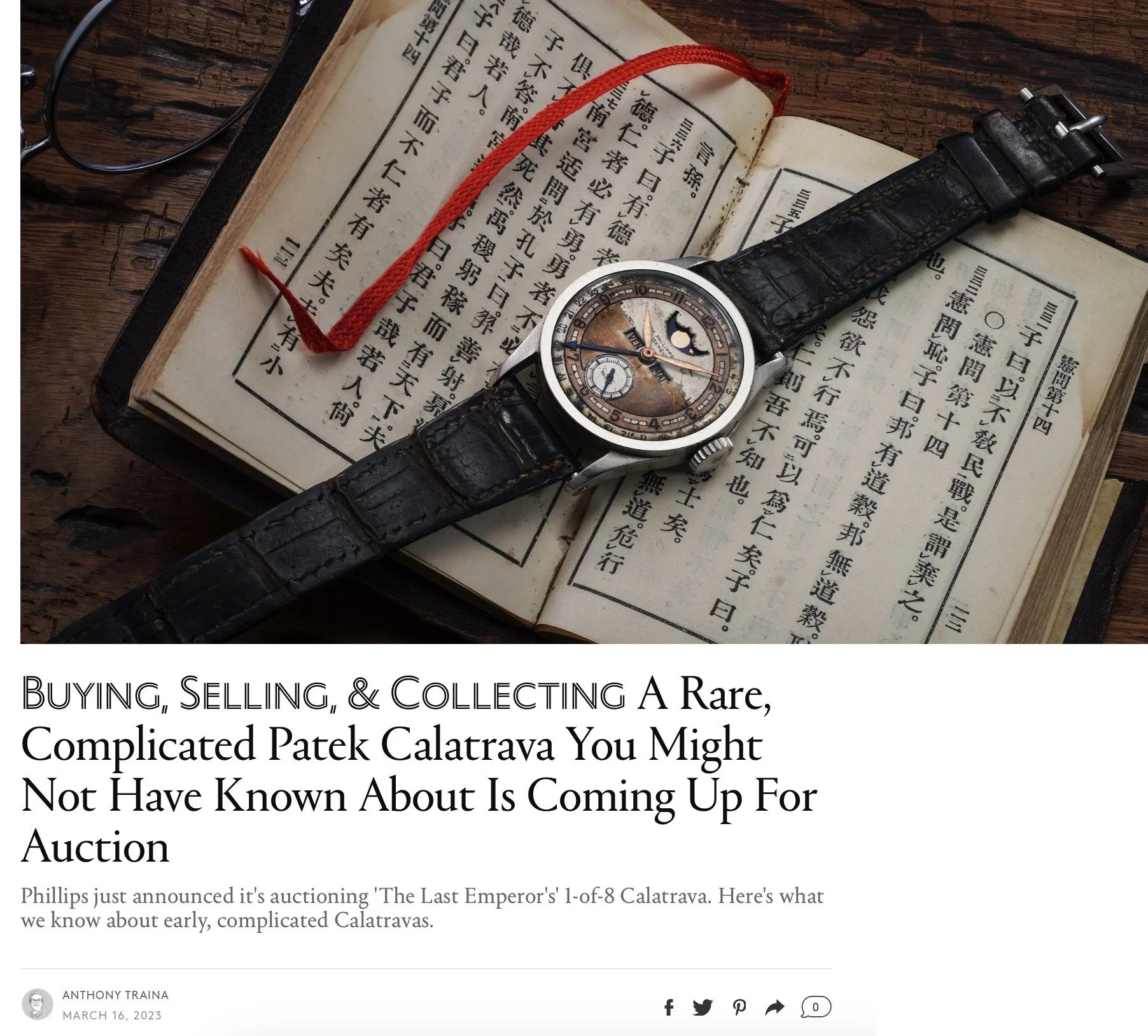 Editor at Hodinkee, Tony Traina, recently wrote about The Last Emperor's' complicated Patek Philippe Calatrava reference 96. Within the article, Traina acknowledged Charlie Dunne, Director of Content and Research at Wind Vintage, for assistance on the subject.