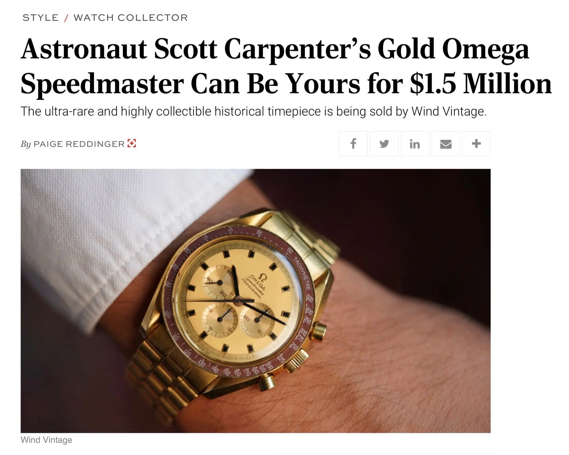 Robb Report’s watch editor, Paige Reddinger recently wrote about ‘Astronaut Scott Carpenter’s Gold Omega Speedmaster Can Be Yours for $1.5 Million’. Within the article, Reddinger wrote: