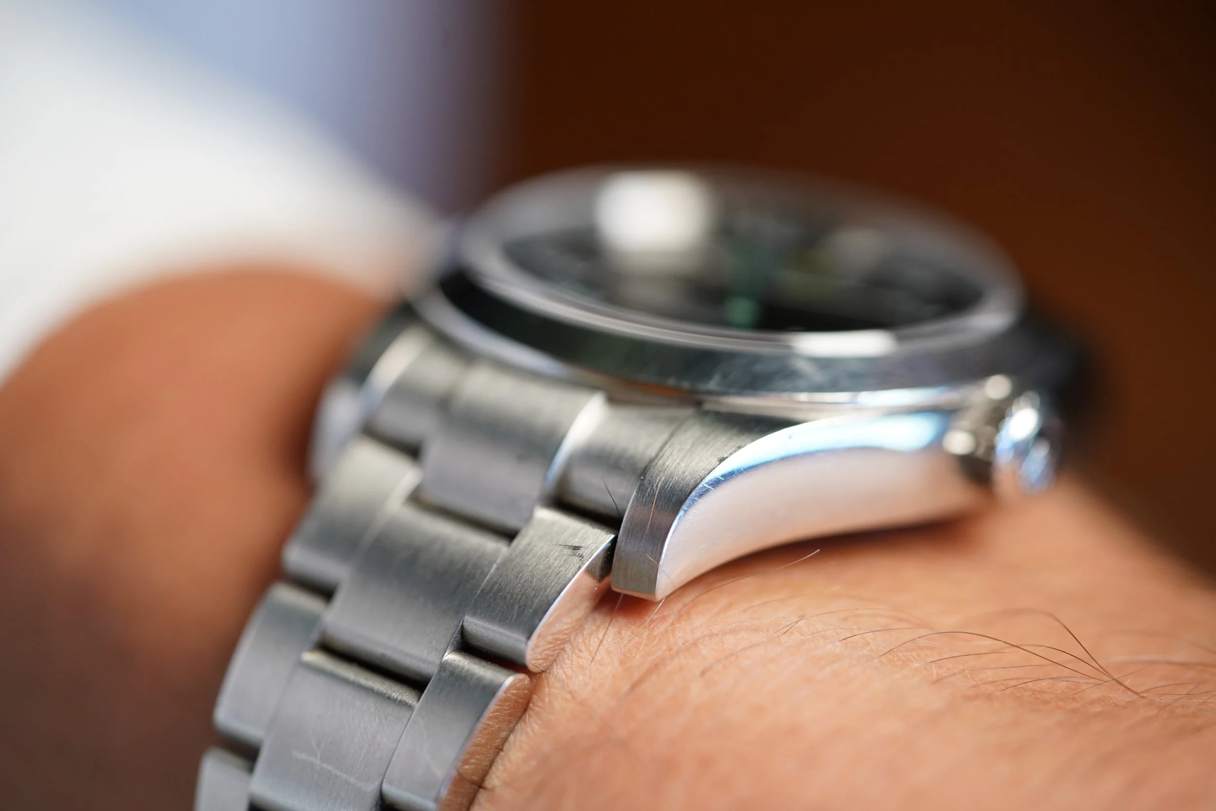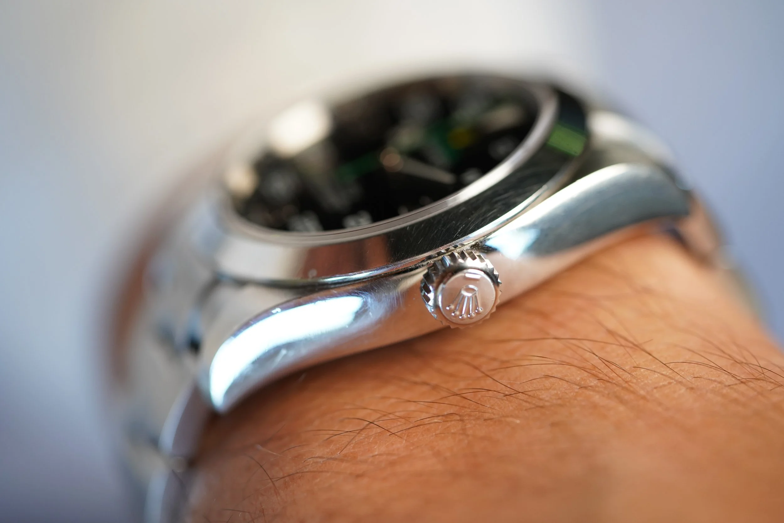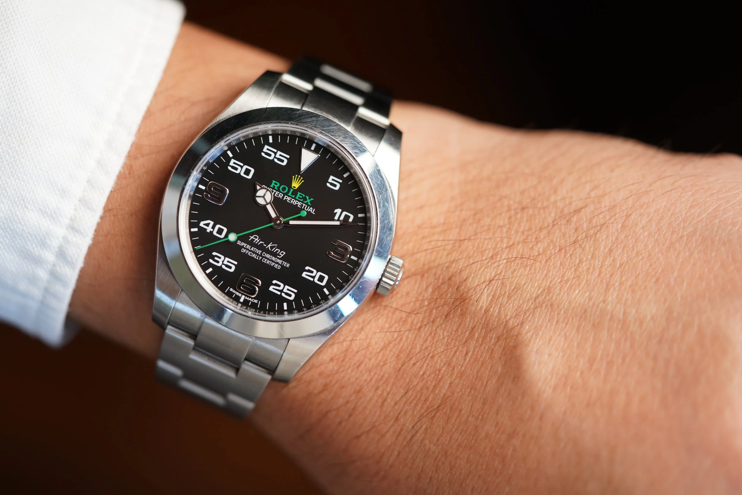 This Rolex Air-King reference 116900 is a great modern watch. The case is unpolished a measures 40mm in diameter. The dial features pronounced numerals at 3, 6 and 9 and features the highly attractive green “Rolex” print. It was sold in 2018.